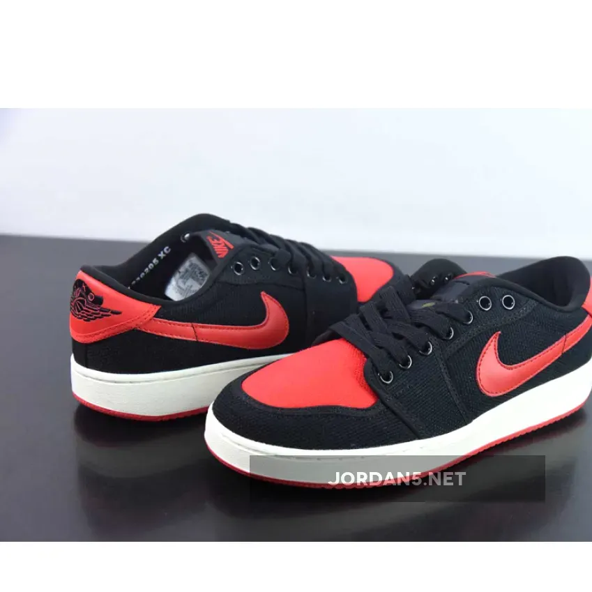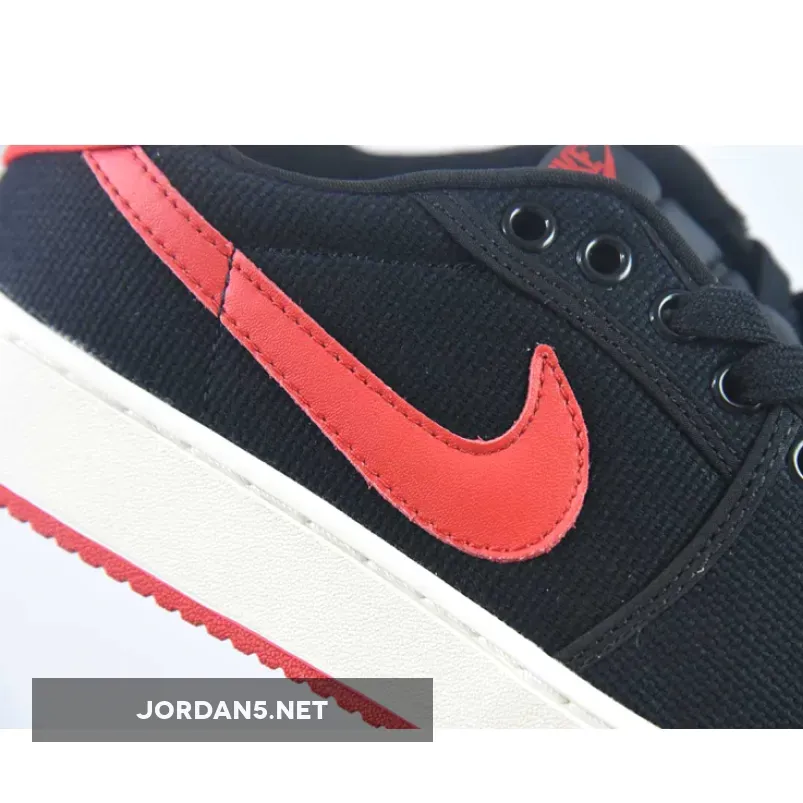 this colorway of the Air Jordan 1 KO Low is constructed out of a full Black and Red canvas base decorated with Red leather Swooshes and heels.