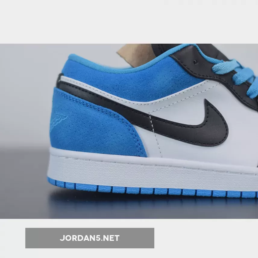 The blue accents that give the shoe its name are present on the perforated suede heel and collar — an interesting alternate material choice, as the AJ1 Low usually uses leather or nubuck — plus the laces and outsole. The rest of the upper is dressed in black or white, with the former appearing on overlays, mudguards, tongues and Swooshes, while the latter graces toeboxes and quarter panels. Although the colorblocking is not identical, the overarching palette bears a noticeable resemblance to artist Todd Bratrud‘s Nike SB Dunk High “Send Help” from 2006. What’s more is that the coloring and perforations also resemble 2009’s skateboarding-ready Air Jordan 1 Phat Low “Laser Blue.” Non OG-style Air Jordan 1 Lows also add a substantial dose of extra branding, all of which is present and accounted for here. Tonal ball-and-wings graphics hit the heel, and tongues offer a small blue Jumpman on the top plus Michael Jordan‘s #23 in blue on the lace keeper. White midsoles and the aforementioned blue outsoles round things off, with blue flat laces and black rope laces allowing the wearer to add a personal touch.