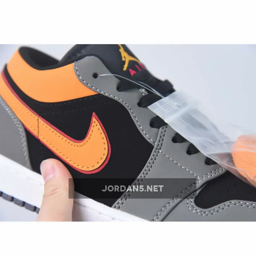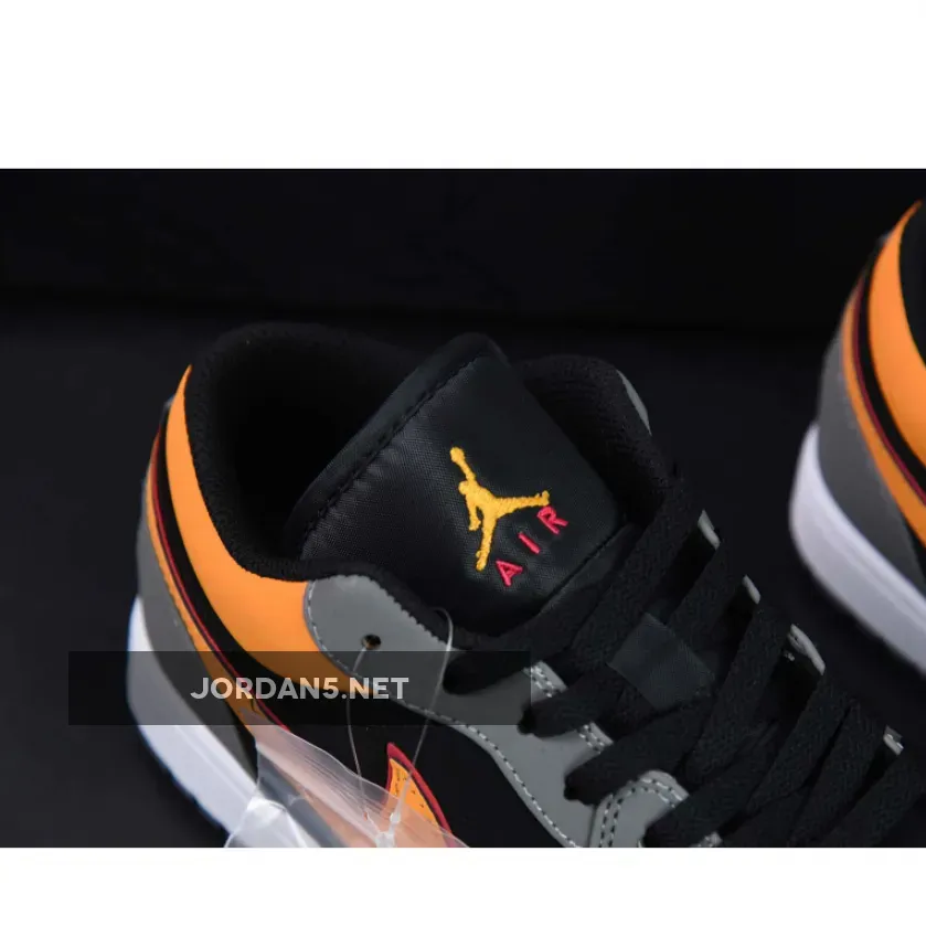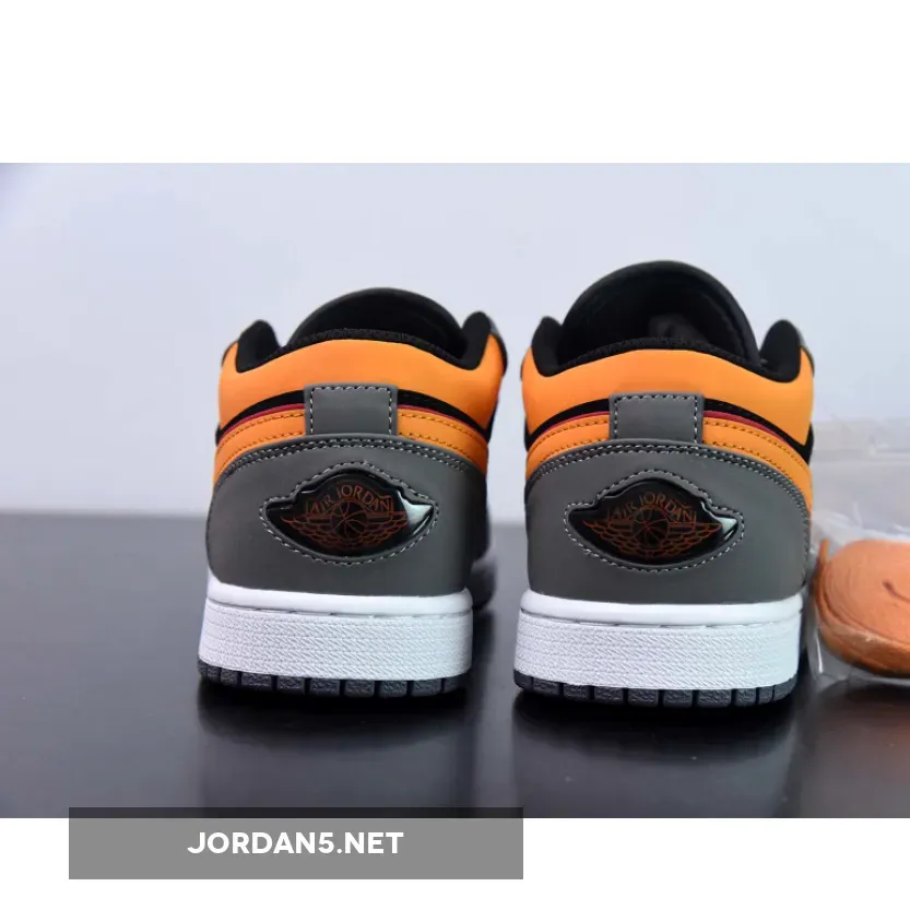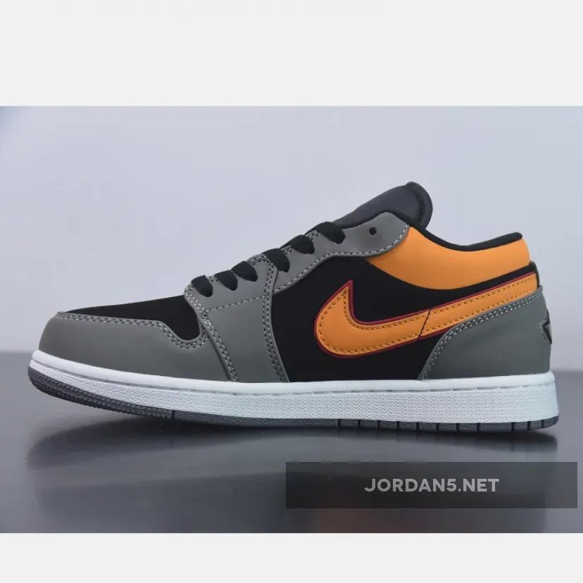 Done in an official color scheme listed as Black, Vivid Orange, Light Granite, Cardinal Red, White, this new iteration of the Air Jordan 1 Low is constructed in a mix of nubuck and leather alongside mesh used on the tongues and inner lining.