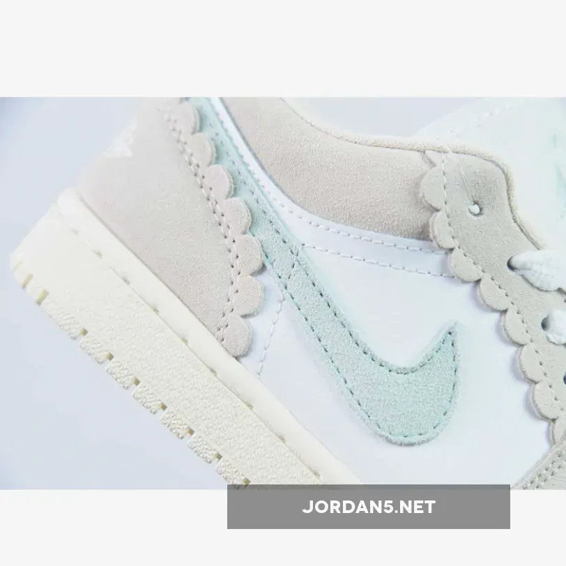 This colourway features a white leather underlay with pink suede overlays. Wavy curves adorn the eyestays and heel panels. Frilled white laces keep the theme of the shoe consistent. Equally typical is the suede Swoosh, whose light blue finish matches adjacent branding such as the Wings embroidery along the heel and the Jumpman on the tongue. White leather bases round out the upper in complement to the tongue and laces, while yellowed midsoles sit right below.
