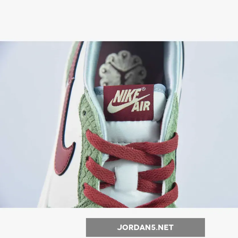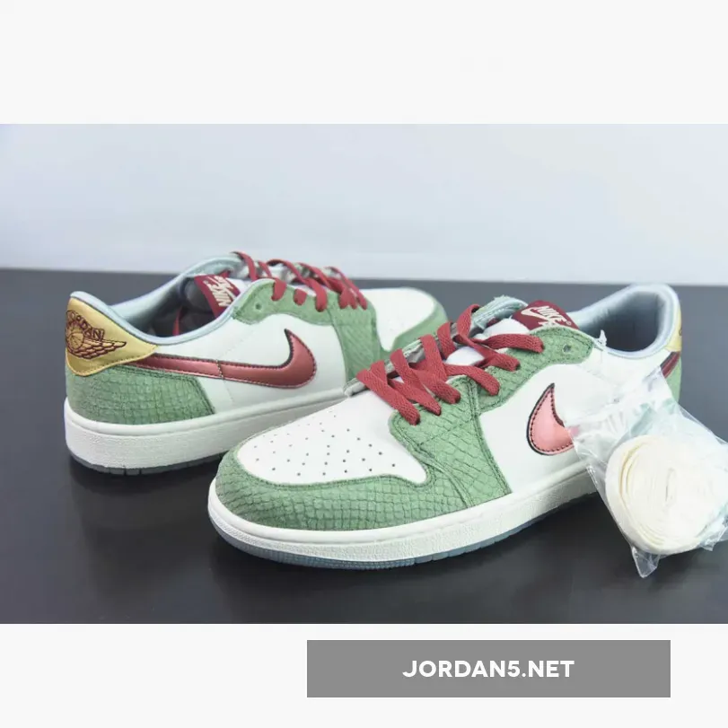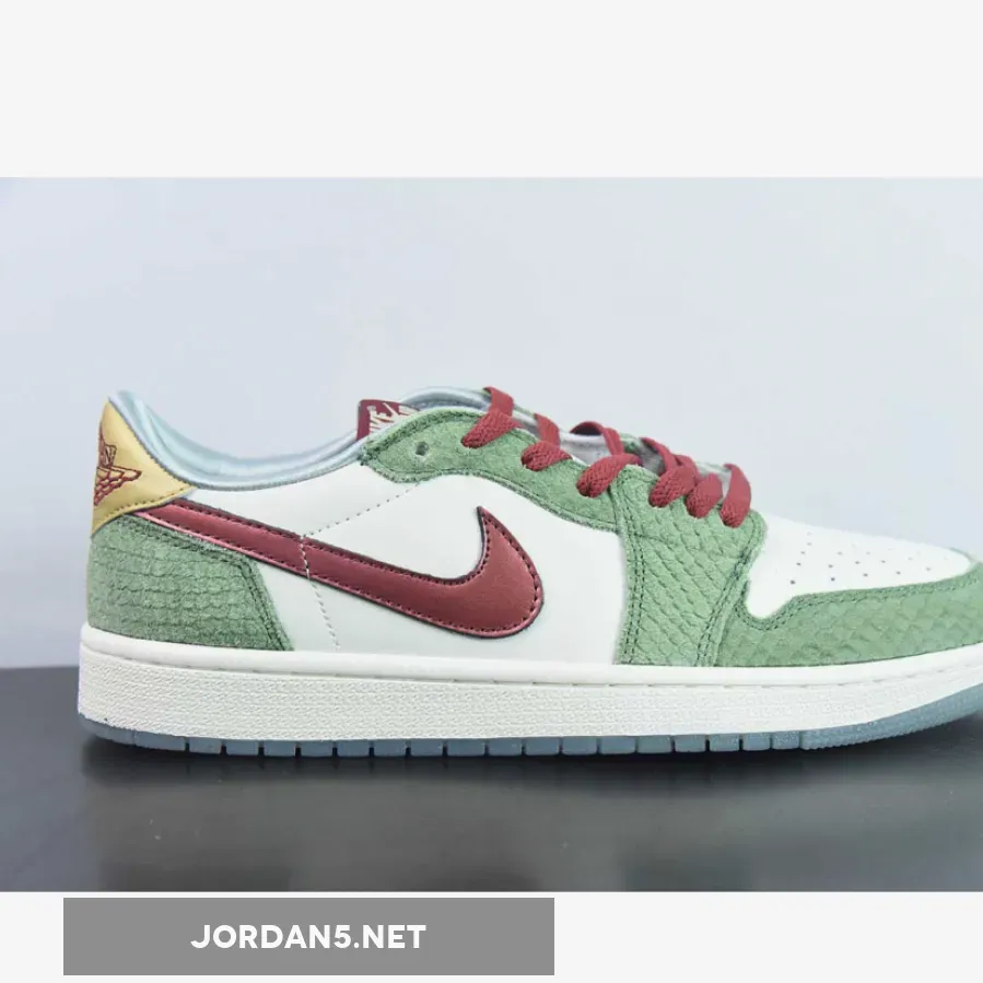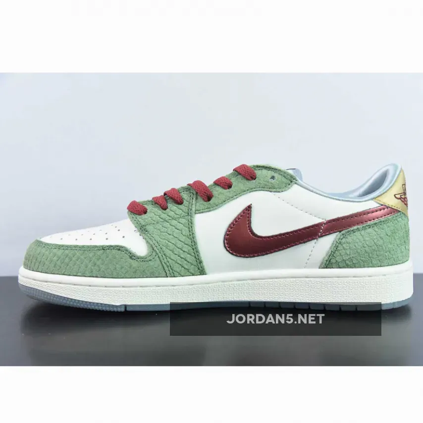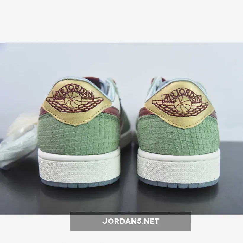 The Air Jordan 1 Low “YOTD” boasts a captivating palette that blends Sail, Cedar, Oil Green, Light Pumice, and Dark Team Red hues. the upper sports a “Sail” leather base that complements the “Oil Green” scale overlays that span from the mudguard to the heel counter. Adding a dash of contrast, Dark Red accents grace the Swooshes, embroidered Wings logo found on the Golden heel tabs, “Nike Air” tongue labels, and a set of laces. Inside, a refined Light Grey satin lining exudes elegance, all set atop a pristine White midsole, which meets the ground with a Green rubber outsole. Key thematic details round out the look courtesy of the sockliner, inside of the tongue and a celebratory red envelope. As a final touch, this extraordinary pair comes packaged in a special Year of the Dragon-themed box.