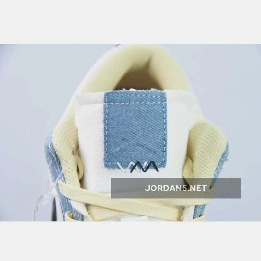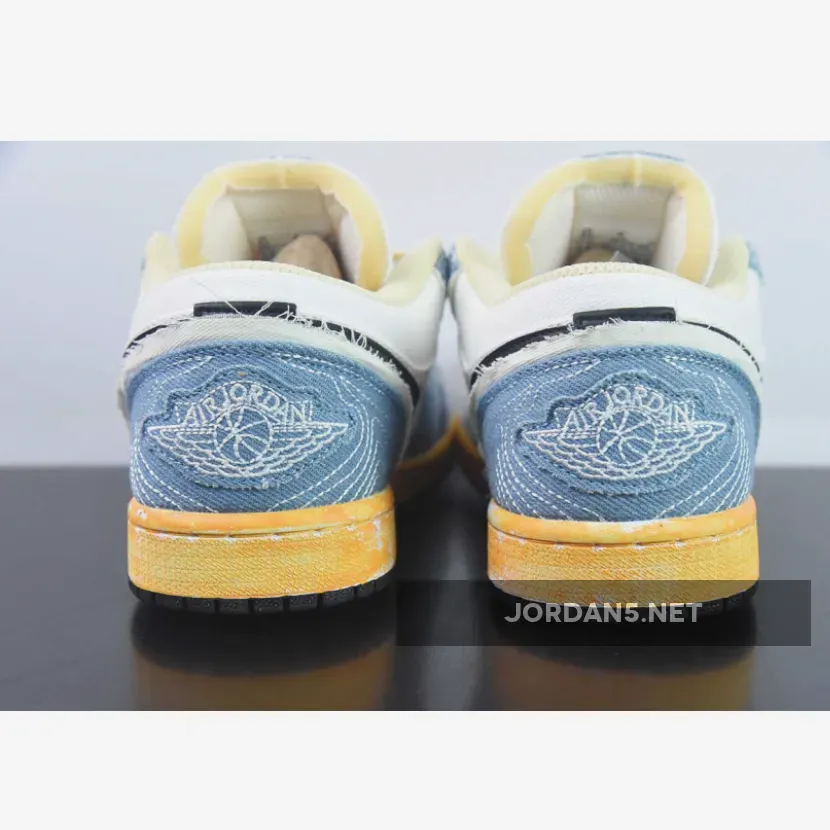 Once more paying homage to the traditional Japanese craftsmanship, the Air Jordan 1 Low Sashiko is given an aged aesthetic made up of a White canvas base with distressing and wear denim fabric overlays taking care of the the toe box, forefoot, eyestay, and heels with frayed edges.