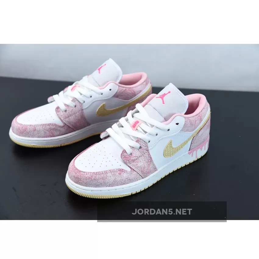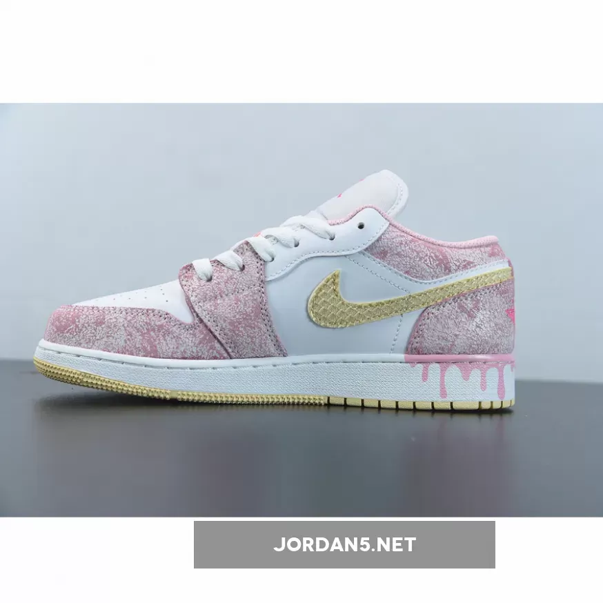 The Jordan 1 Low GS Paint Drip Arctic Punch is part of a long line of offerings from Nike this Easter. This ice cream-inspired AJ1 Low is the perfect, pink addition to your rotation this spring, with tumbled, suede, pink overlays dressing the toe cap, around the ankle and the heel. Michael Jordan’s legendary Jumpman logo sits in bright pink at the top of the tongue, matching to the Wings insignia embroidered in neon on the heel of this J. All tied up with a white lace unit that matches the rest of the smooth upper, this Jordan is not complete without a little extra detailing that gives it its finishing touches. This is bound to be a sell-out once it is released, so to be in with the best chance of copping the Air Jordan 1 Low GS Paint Drip “Strawberry Ice Cream”, keep it locked to Our Store Supplier.