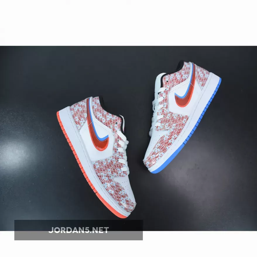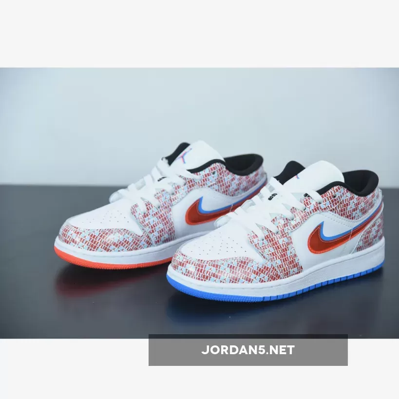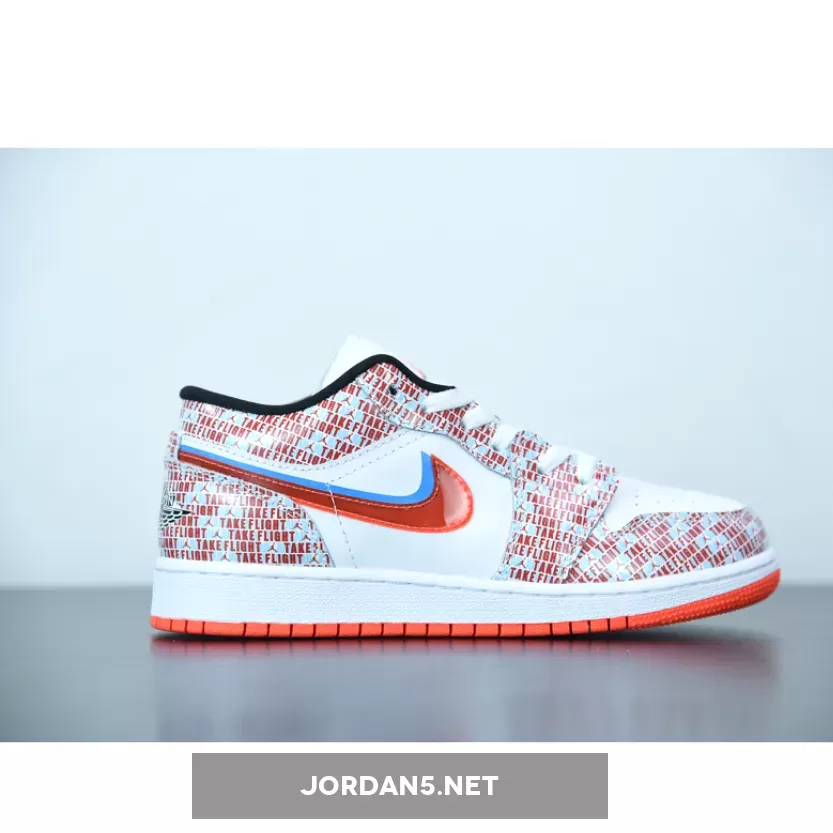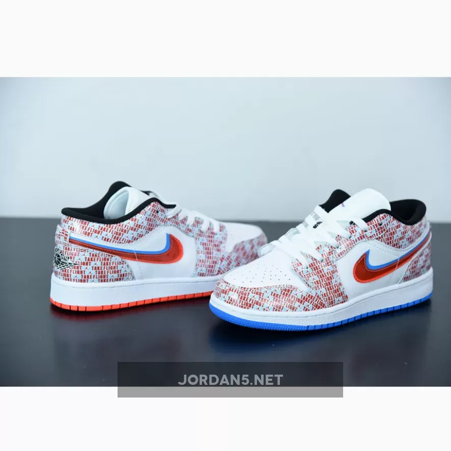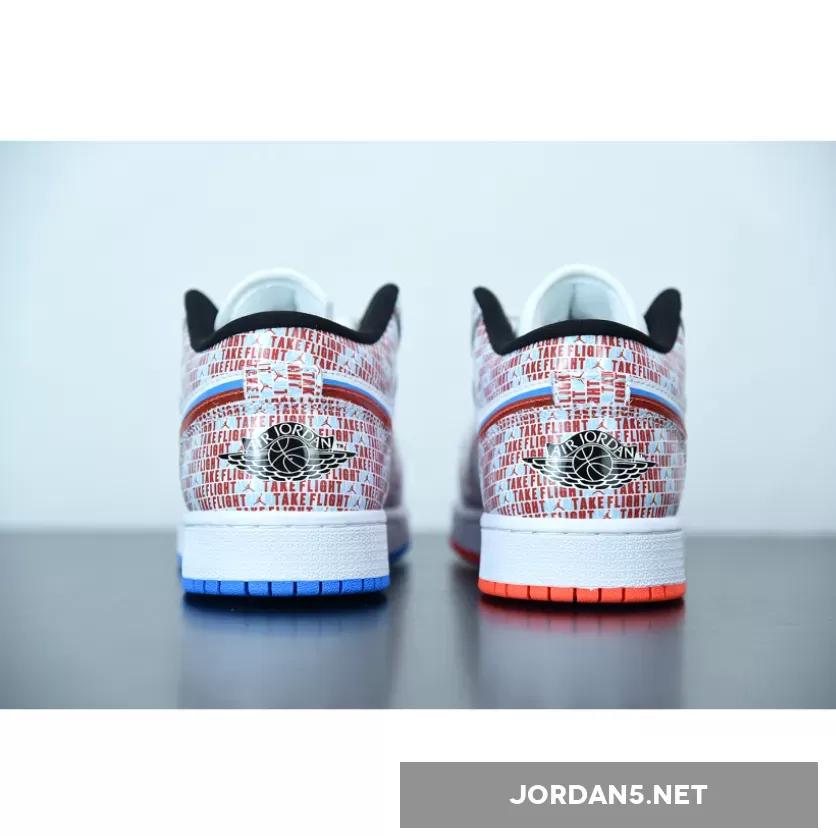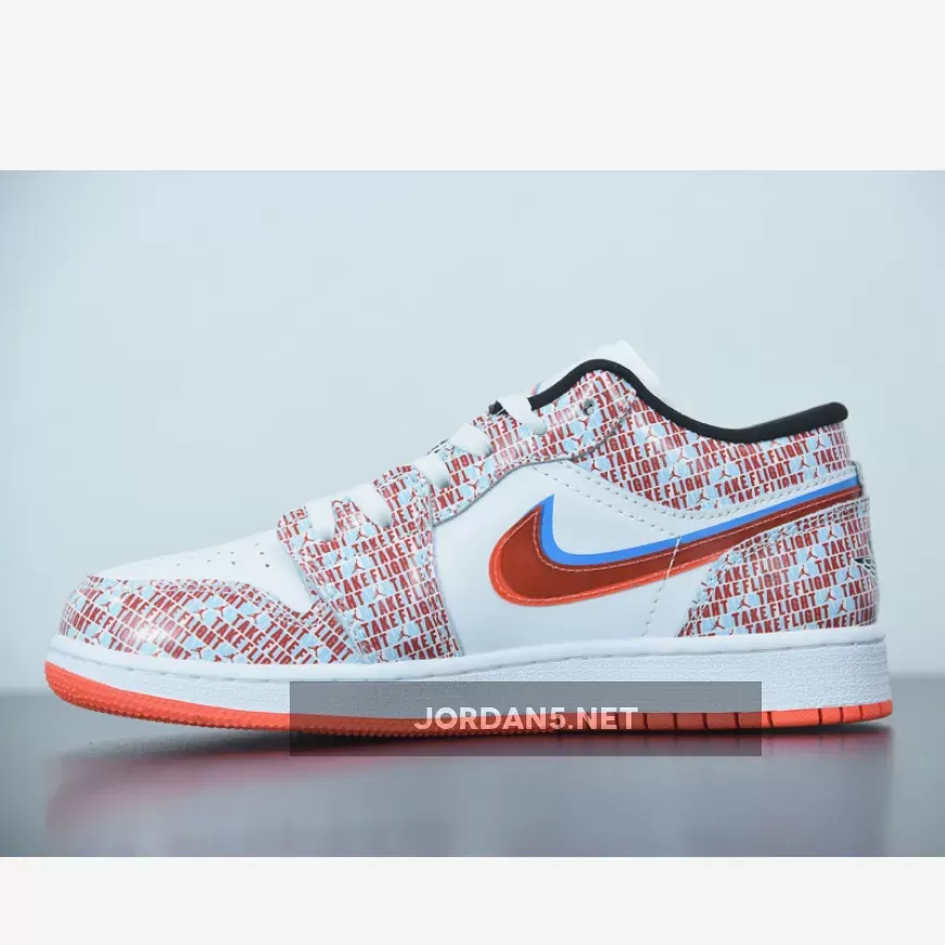 Dressed in a White Blue Hero, Bright Crimson, and Black color scheme. This offering of the Air Jordan 1 Low features a White leather base with an all-over “Take Flight” print used on the overlays.