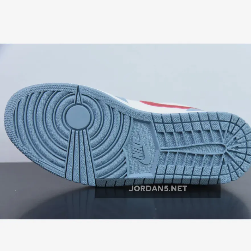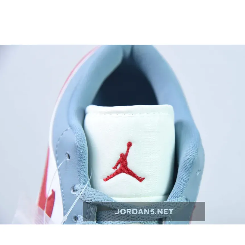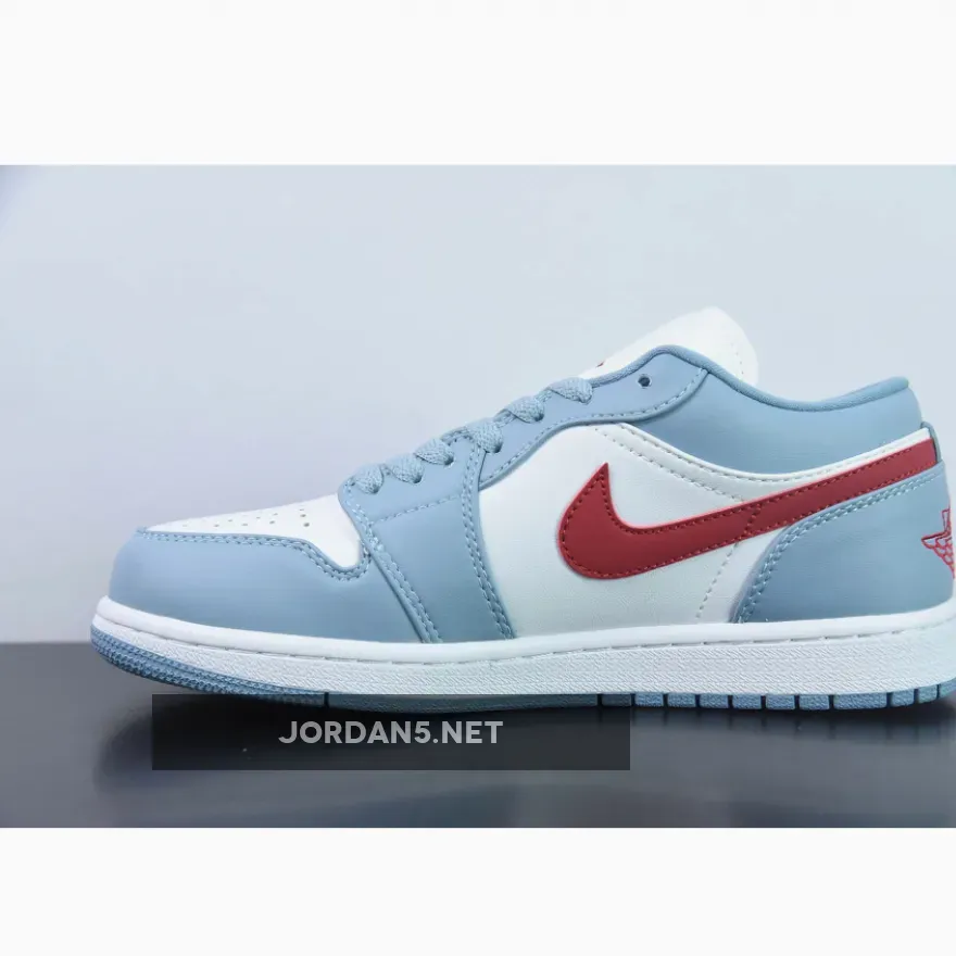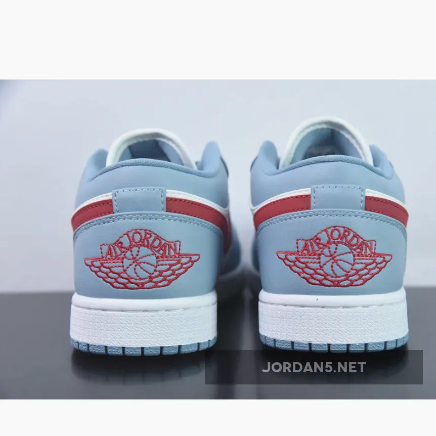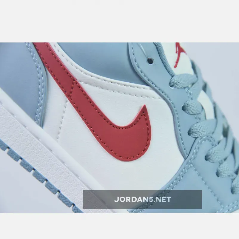 This Air Jordan 1 Low features an all-leather top in white, red, and light blue, similar to the Nike SB Dunk Low “Phillies” from 2022. The mudguard, eyestays, collar, and heel are all covered in a blue-grey hue, while a sail shade appears on the toe box, nylon tongue flap, and quarter panel.