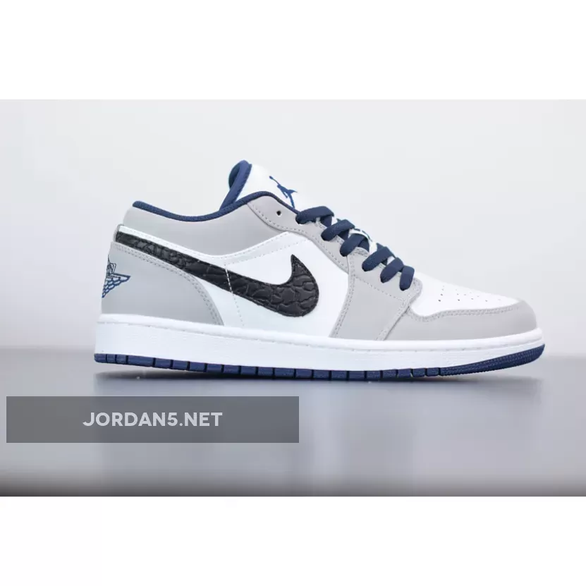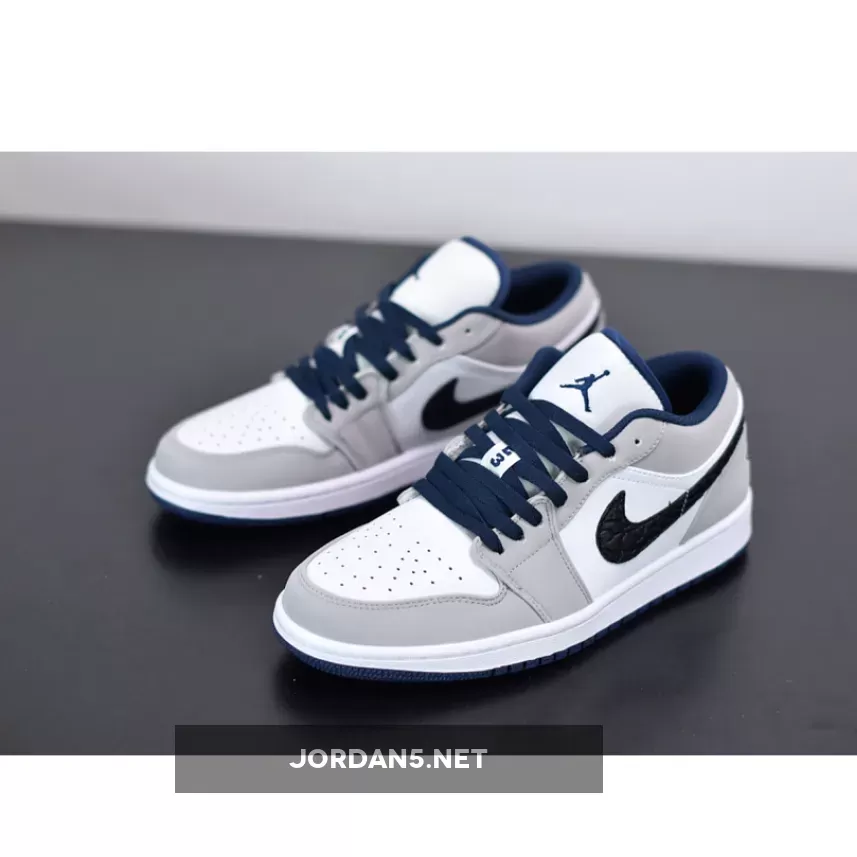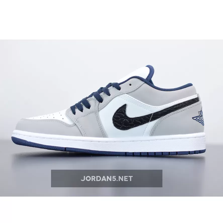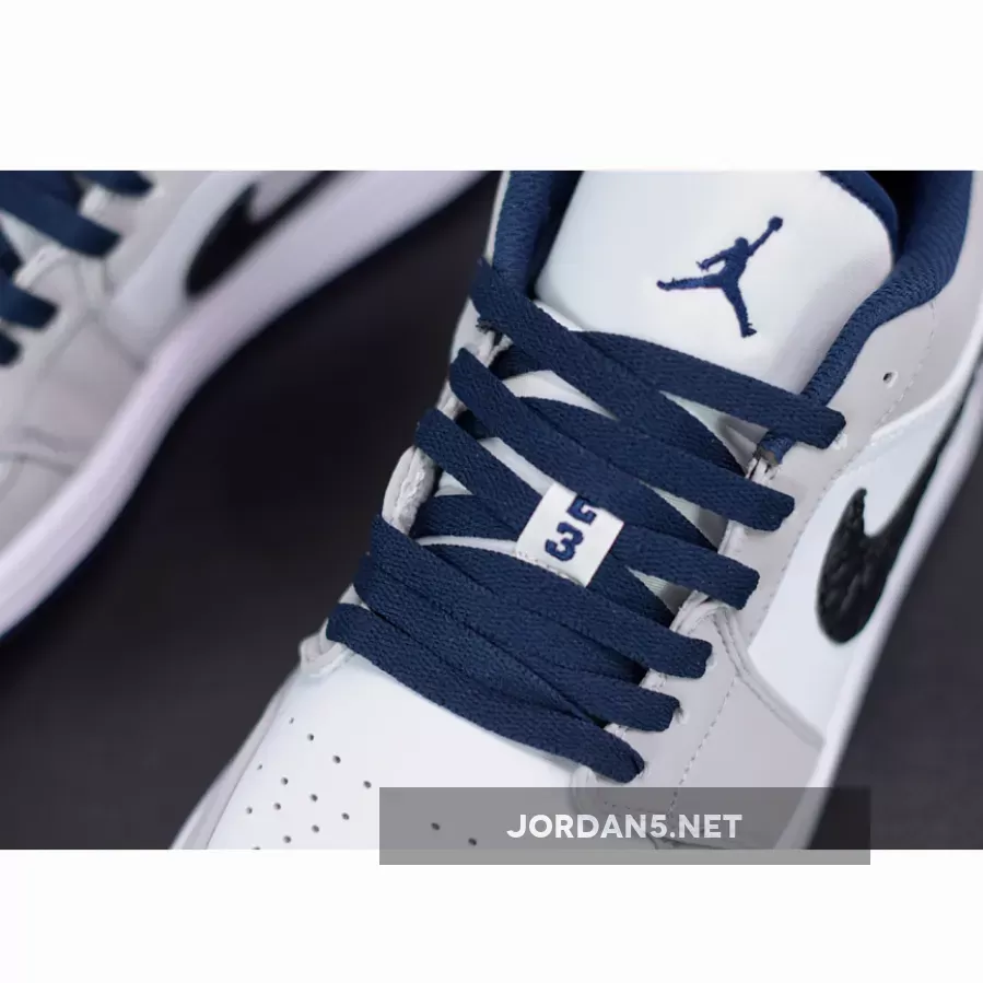 The Air Jordan 1 Low “True Blue” features a White leather base with Cement Grey trim and True Blue accents along with Black hints.
