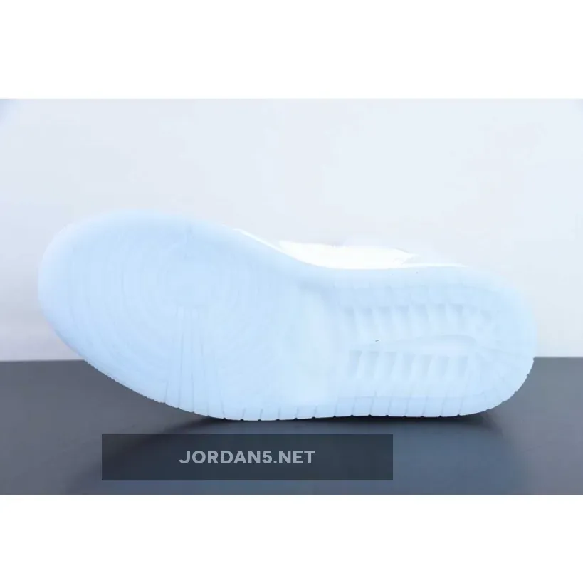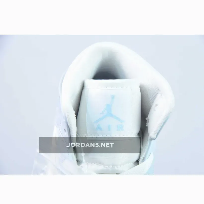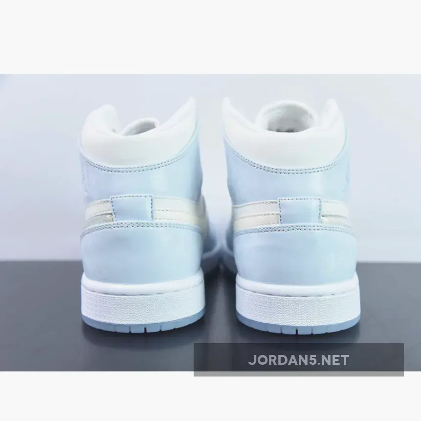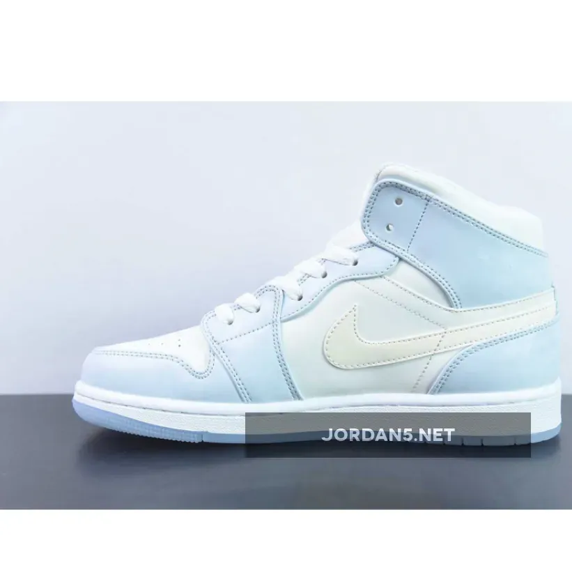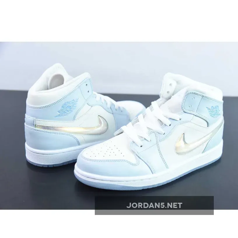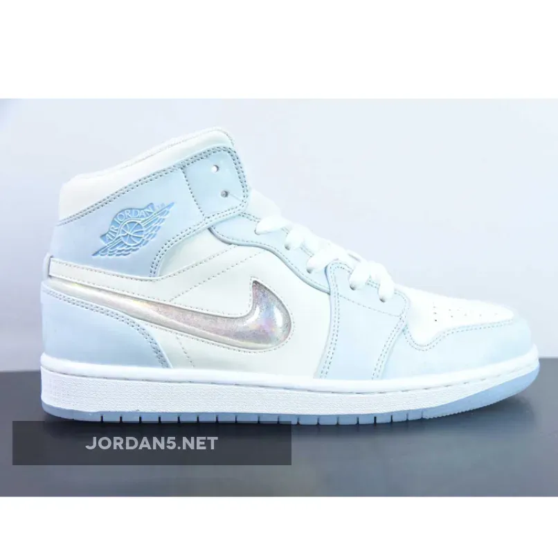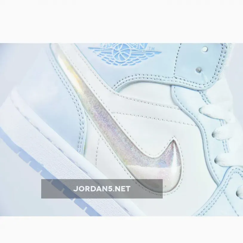 The Air Jordan 1 Mid sports a full leather construction that enhances comfort and durability. It incorporates toe box perforations for increased ventilation, mesh tongues, and a soft inner lining. Its foundation is a crisp White hue, while Light Blue accents adorn the overlays and branding on the ankle flaps and tongues. The recognizable Swoosh logo is prominently displayed once more, and this time it has been reimagined with a glitter-covered jelly sheen. This dazzling insignia on the Mid mirrors a beguiling palette of hues, making certain that every stride draws the eye as well as inspiring a sensation of amazement and ecstasy in the wearer.