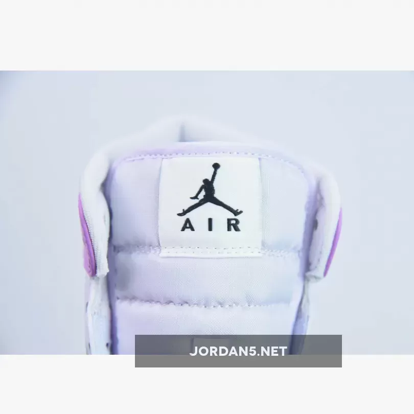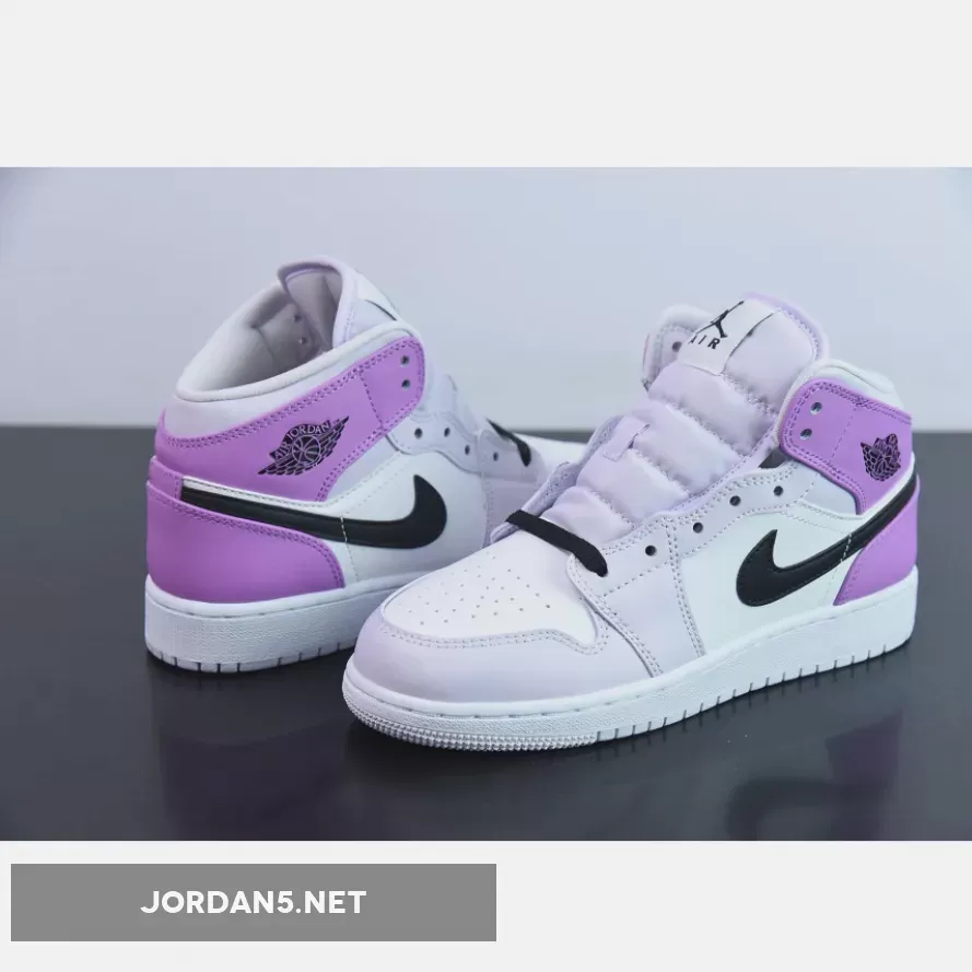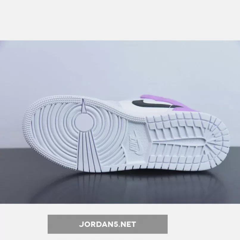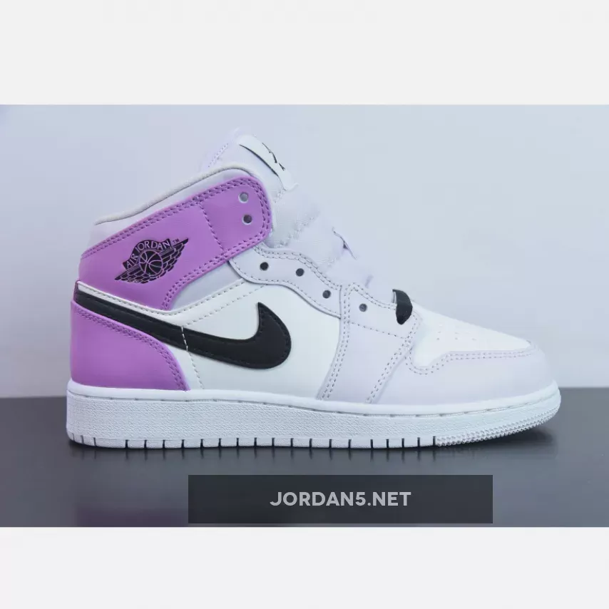 The Mid Barely Grape Jordan 1 (GS) features a white leather upper with purple and black accents. The Air Jordan Wings logo is embossed on the ankle, while “Jumpman AIR” can be found on the tongue. The Nike Swoosh is displayed on either side. The shoe sits atop a cushioned midsole, which provides cushioning and comfort. The rubber outsole offers durability and traction.