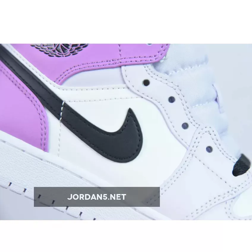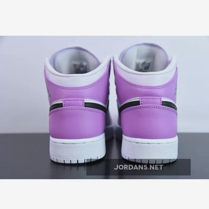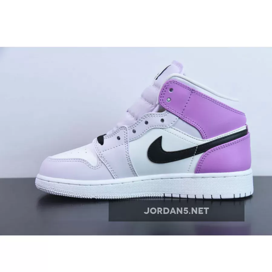 The Air Jordan 1 Mid Barely Grape (GS) comes in a barely grape, white, rush fuchsia, and black color palette.