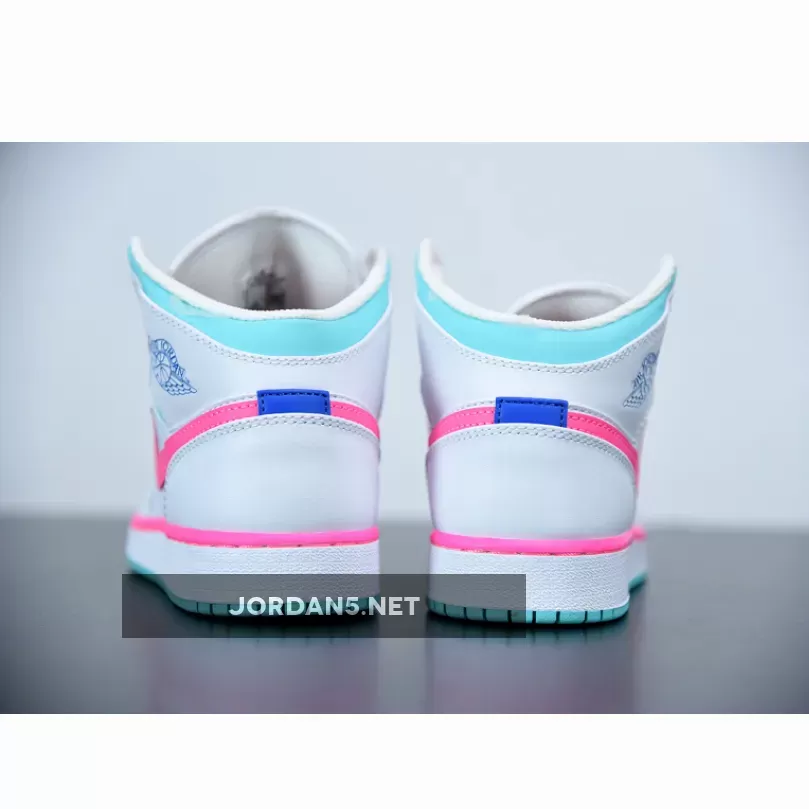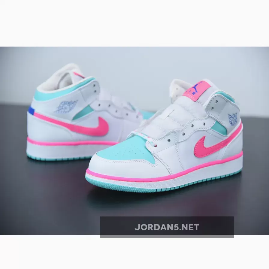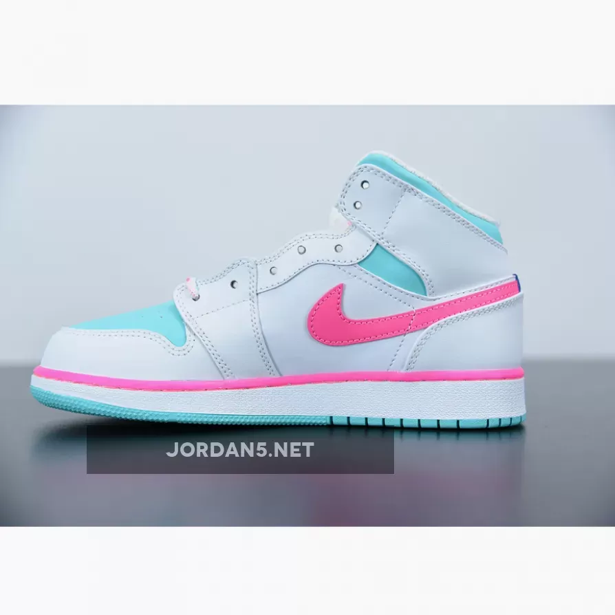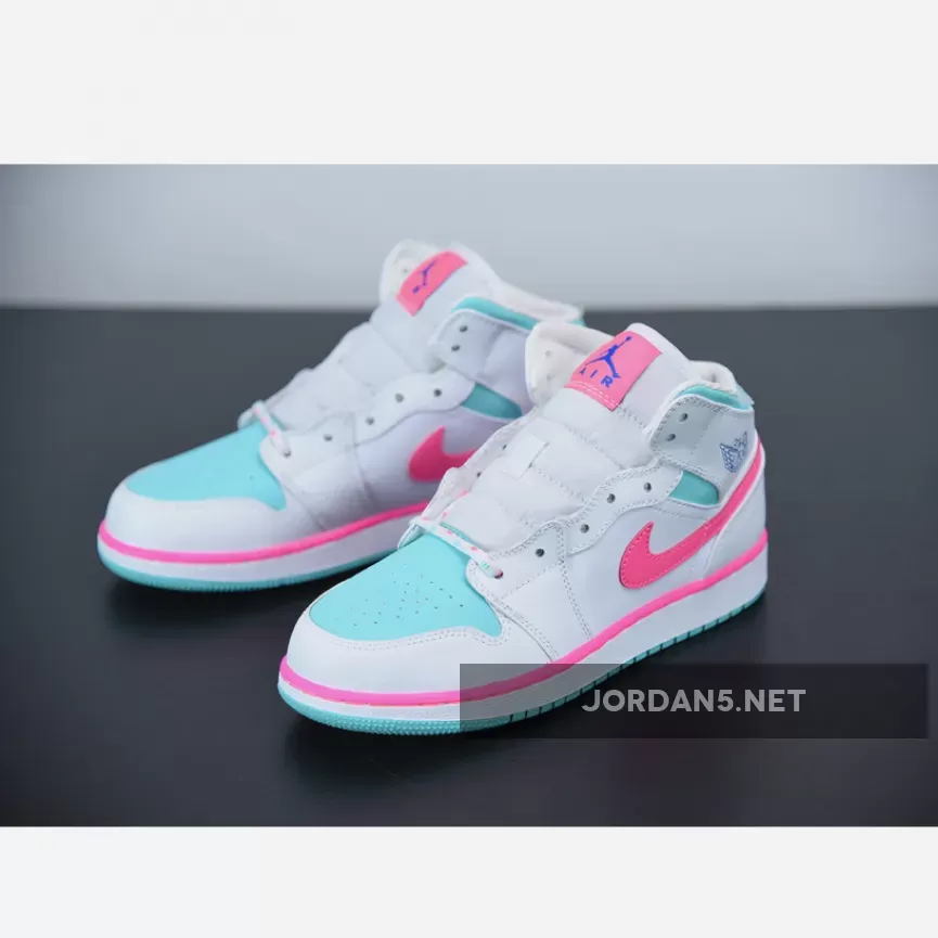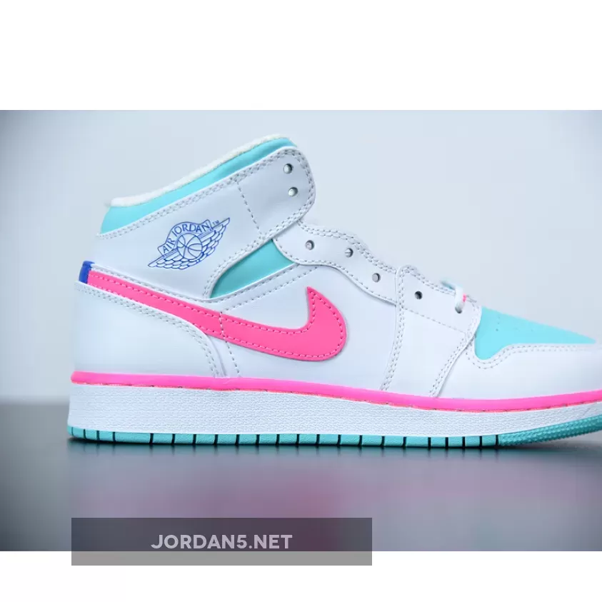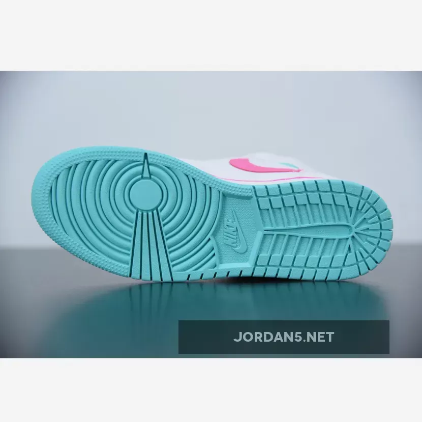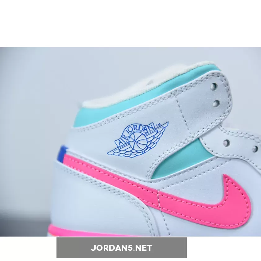 Step into the new season looking and feeling fabulous in this white, pink and blue Air Jordan 1. The clean white leather upper is contrasted with vibrant pops of colour including bright teal across the toe box and heel of the collar with accents of candyfloss pink around the trim on the midsole.