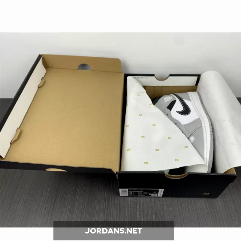 The toe cap, eye stays, collar flaps and heel counter are all in a buttery Smoke Grey leather. The base of the upper is a clean white leather peeping out of the toe box and mid-quarter panel. A pitch-black Swoosh is a striking contrast to the white mid-quarter panel. This black is repeated on the collar, the tongue, and the sock liner. A white Wings logo is embossed on the Smoke Grey collar flap and white Jumpman is featured on the Smoke Grey tongue tab.