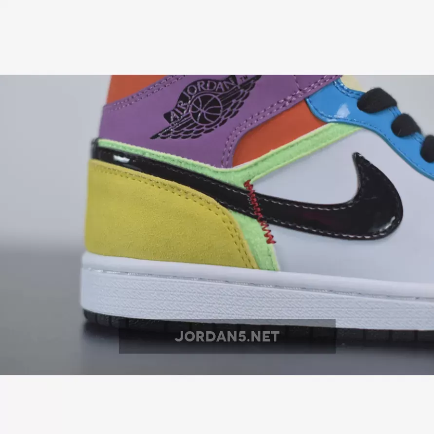 The Jordan 1 Mid SE Multicolor is a brand-new iteration of the classic Nike Air silhouette that has been a huge success since its introduction in 1985 alongside the high and low top versions. The Air Jordan 1 was Michael Jordan’s first ever signature shoe with Nike, and is often regarded as the best shoe of all time. This brand new rendition dresses the AJ1 Mid in a multi-coloured and vibrant look that’s sure to turn a few heads on the street. A combination of construction materials make up the uppers including leather, synthetics and hairy suede. Green, purple, orange, yellow and blue all feature here, with a white base layer housing features such as the black Swoosh that’s stitched onto either side. Classic AJ1 features such as the perforated toe box and wings logo are present as ever, while Jumpman branding is embroidered onto the tongue.