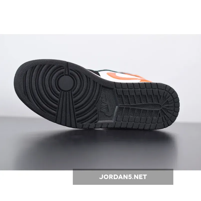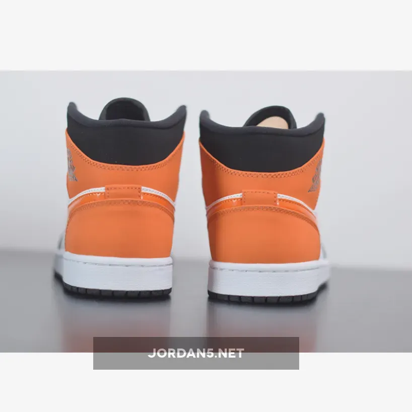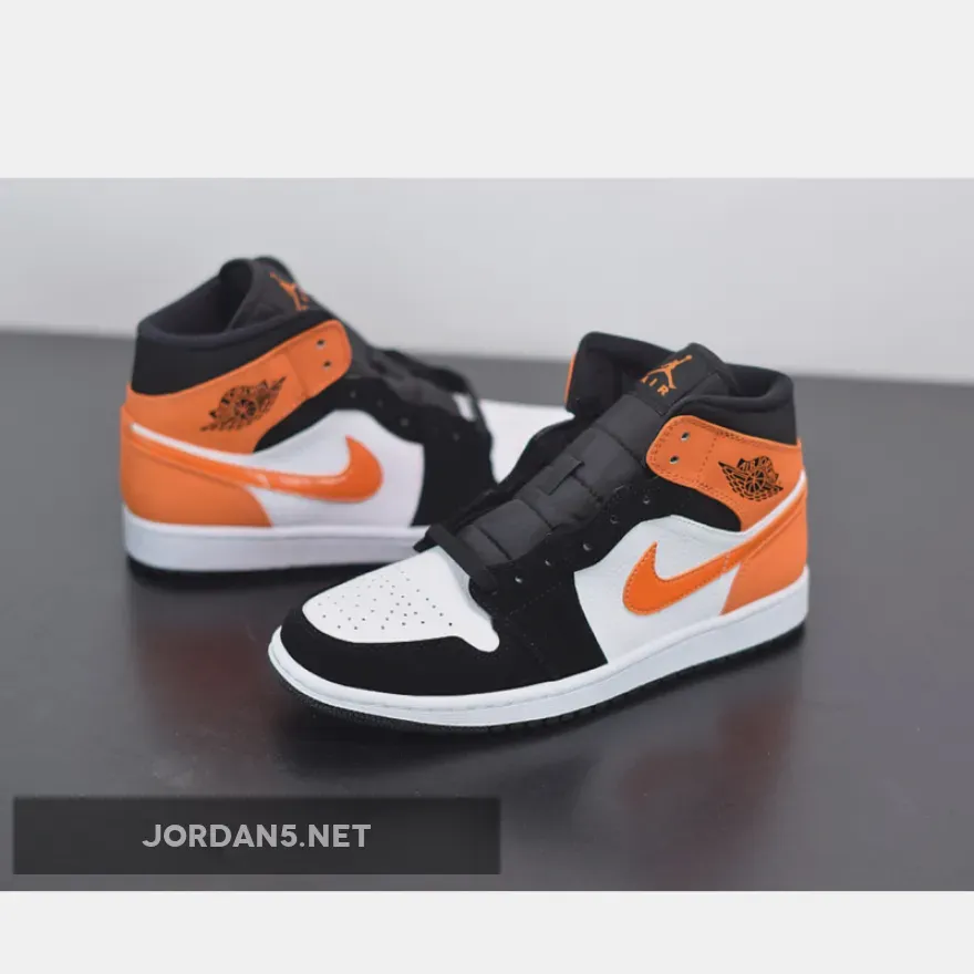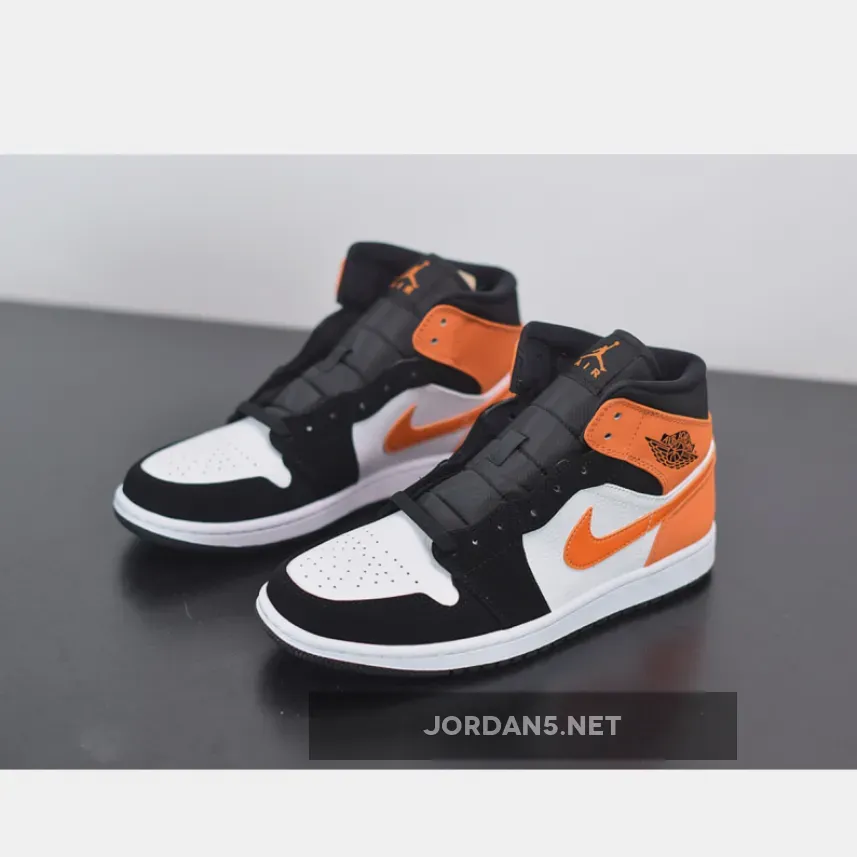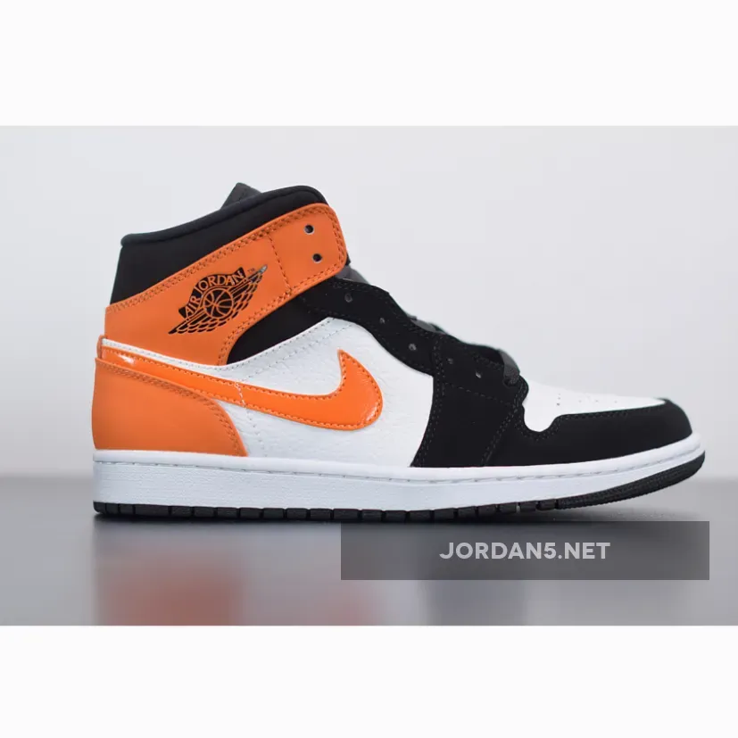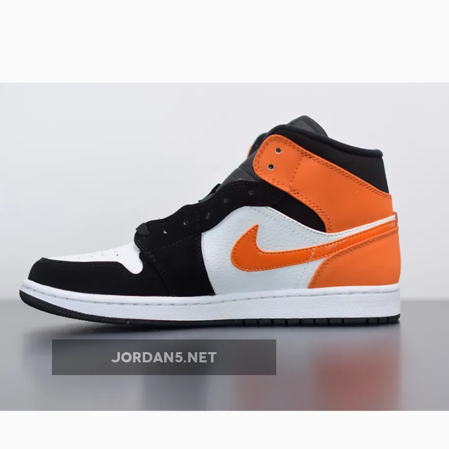 The Air Jordan 1 Mid Shattered Backboard is a stylis. It features a black and orange colorway that is inspired by the iconic Shattered Backboard colorway. This mid-top Air Jordan 1 features a White leather upper with Black nubuck overlays and Starfish leather on the collar, heel, and Swoosh. The midsole is made of lightweight foam, which provides cushioning and support. The outsole is made of rubber, which provides traction and durability. Nylon tongues atop a White midsole and Black rubber outsole completes the design.
