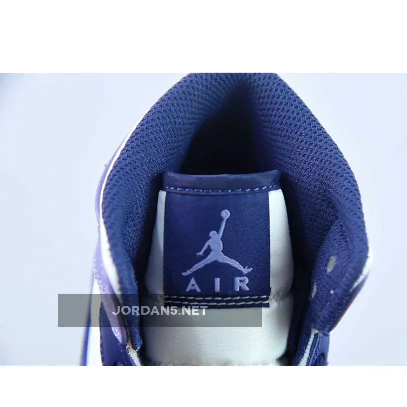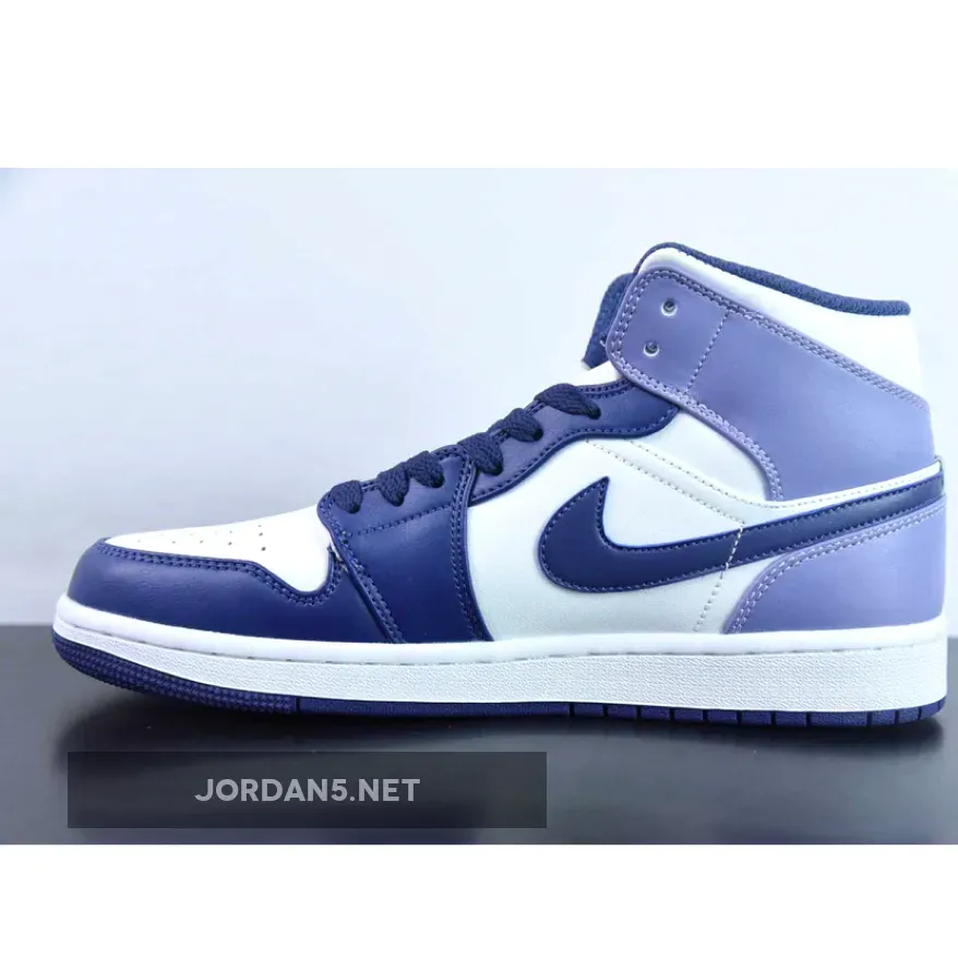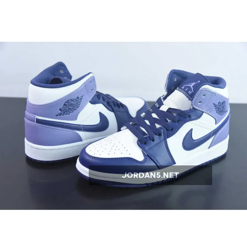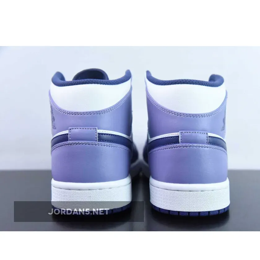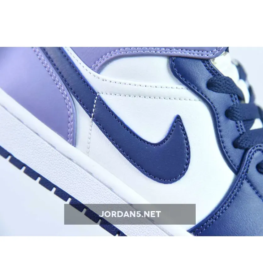 This offering of the Air Jordan 1 Mid features a full leather build on the upper with White serving as the base hue and two different shades of purple seen on the overlays.