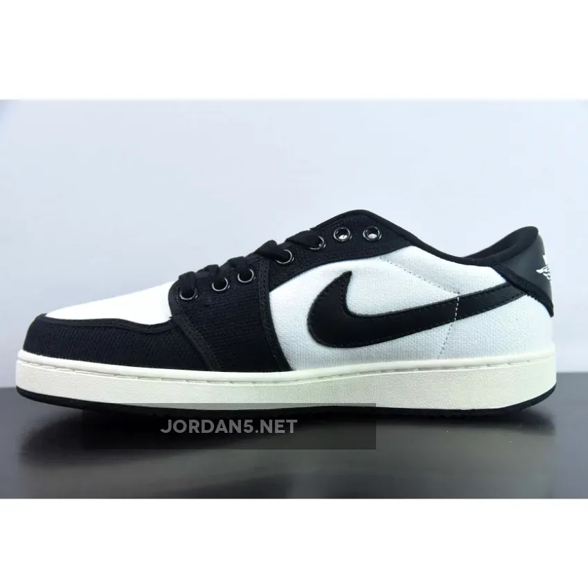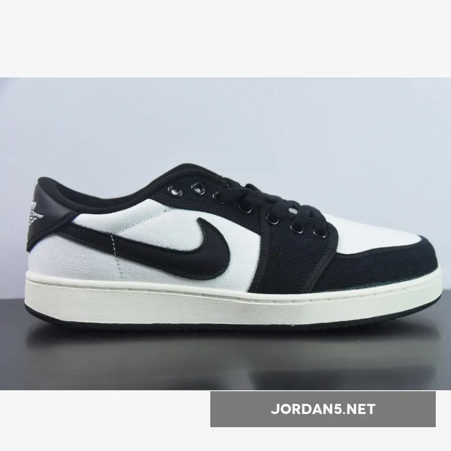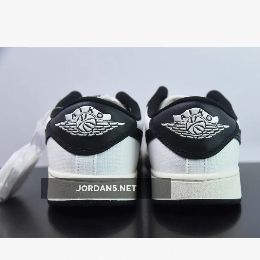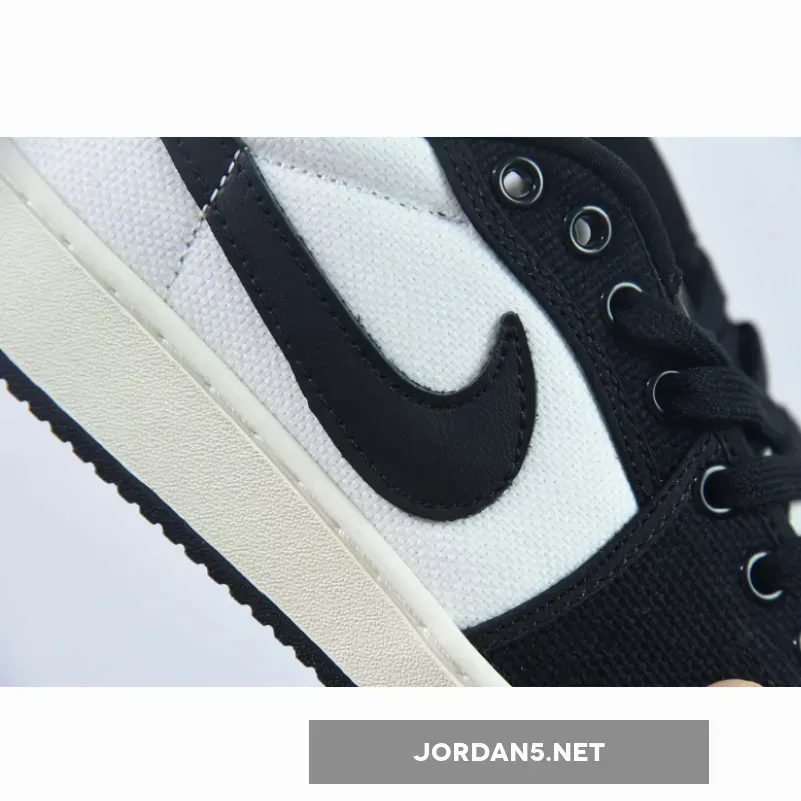 In terms of construction details, this AJ1 KO does not deviate significantly from its previous iterations. This offering of the Air Jordan 1 KO Low comes constricted in a full White and Black canvas base with Black leather Swooshes and heel overlay. The canvas overlays on the toe cap, the mudguard and the eye stay panels are also in black, just like the laces and mesh sock liner. and “Nike” logos on the tongue tags and insole with White Wings embroidery on the heels. Meanwhile, white claims its rightful place on the AJ KO emblems. A sail-coloured midsole and a black rubber outsole cap off the look of this shoe.