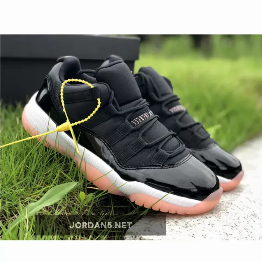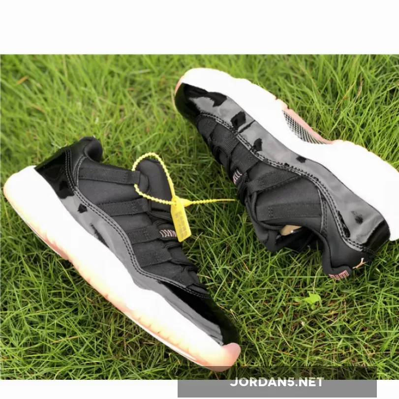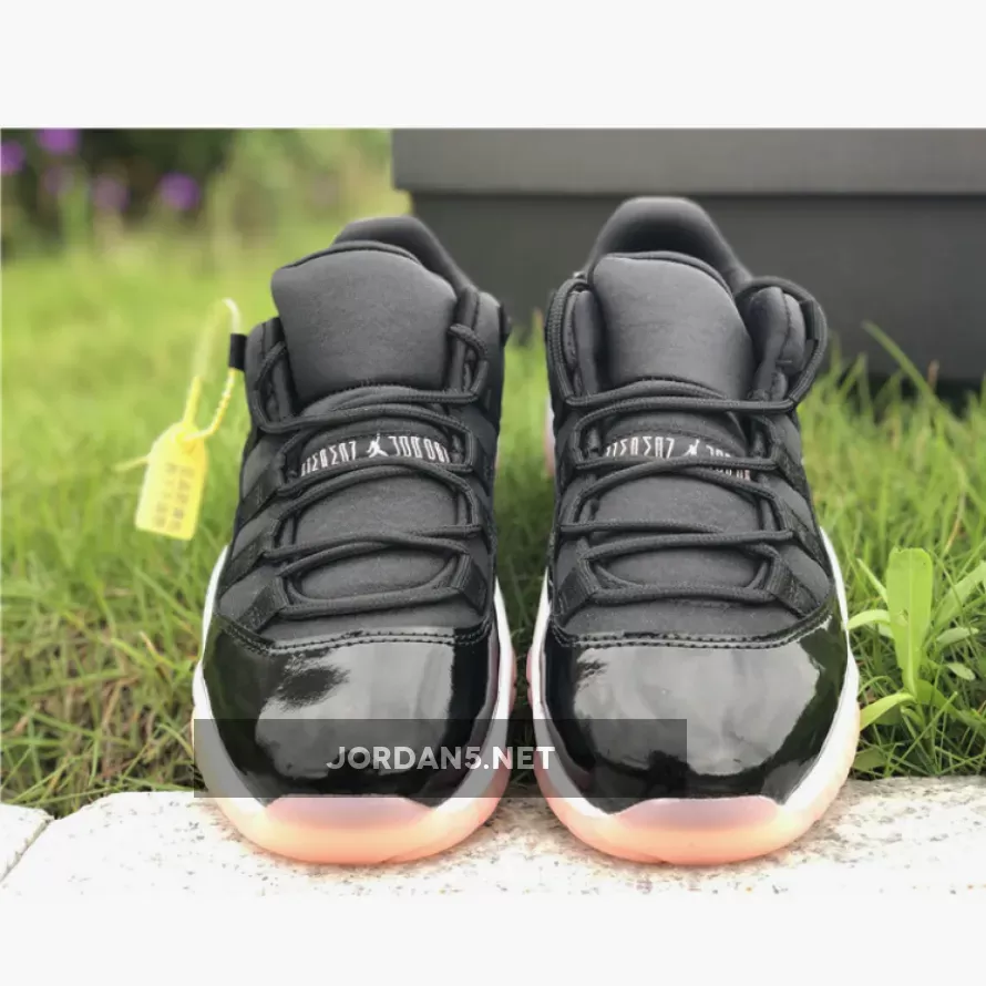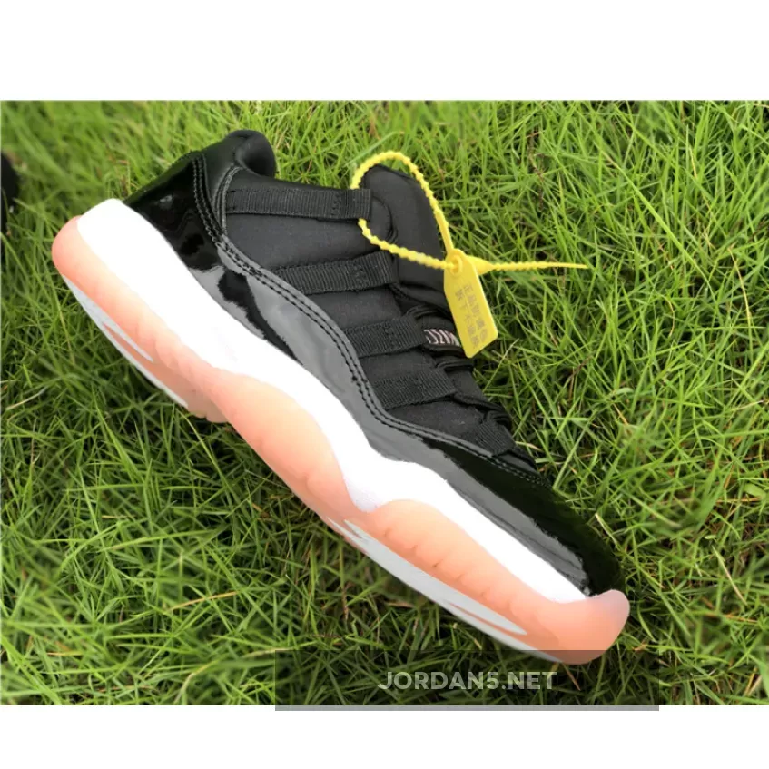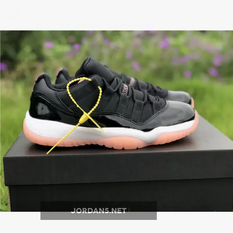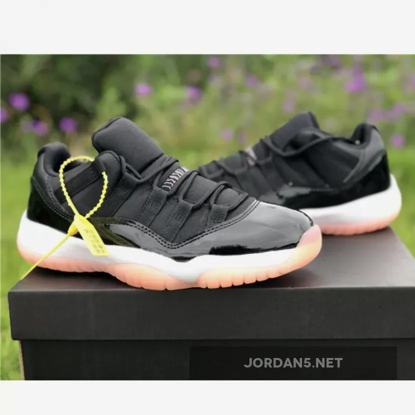 Jordan Brand launched this Bleached Coral colorway of the Air Jordan 11 Retro Low exclusively for girls in April 2018. This grade school edition features an all-black finish on the synthetic and patent leather upper. Full-grain leather detailing appears at the back of the collar, while nylon webbing eyelets add a decorative touch. Contrast coloring arrives via pops of Bleached Coral on the shoe’s branding elements and rubber outsole.