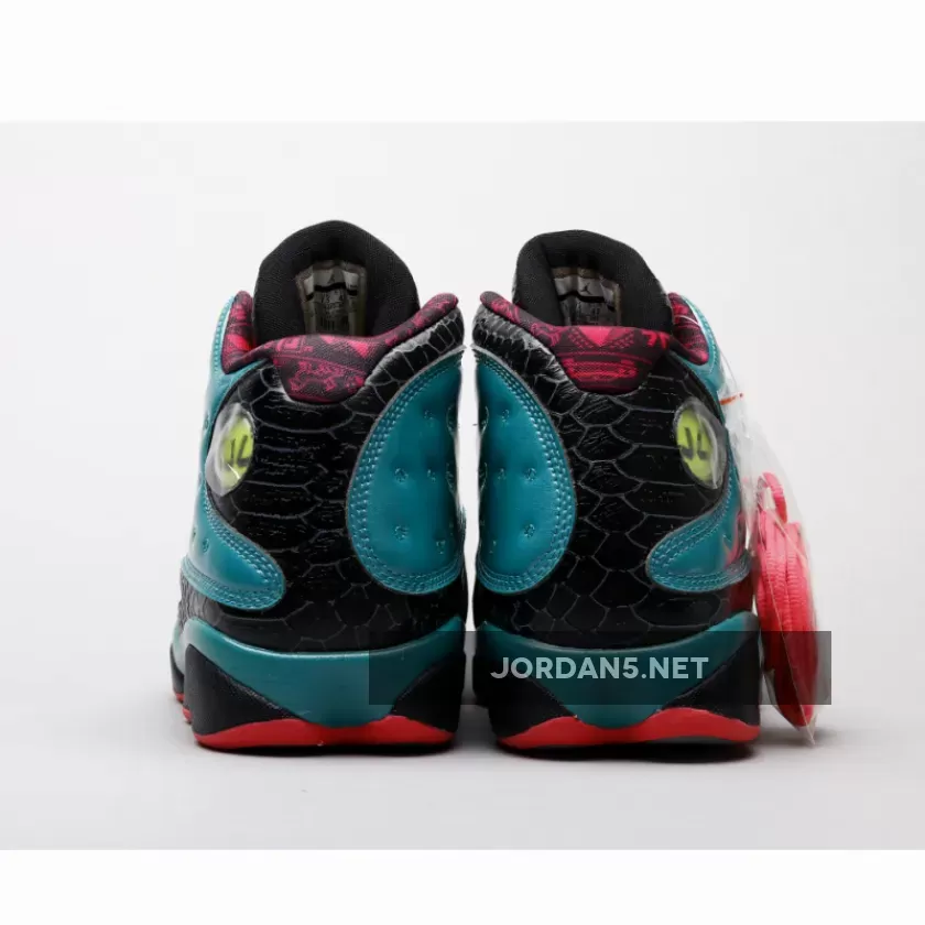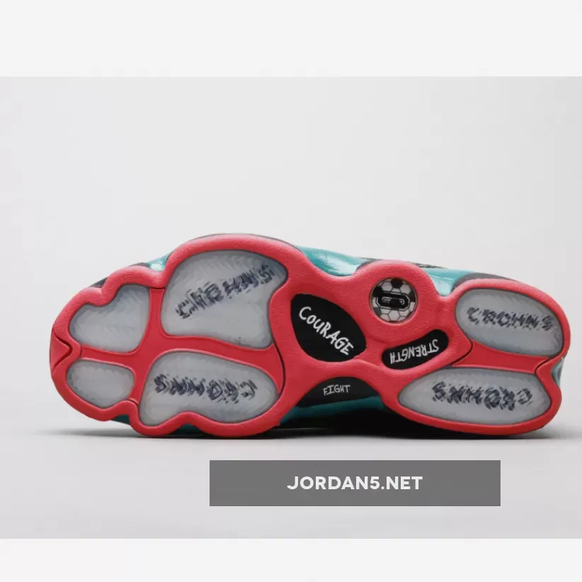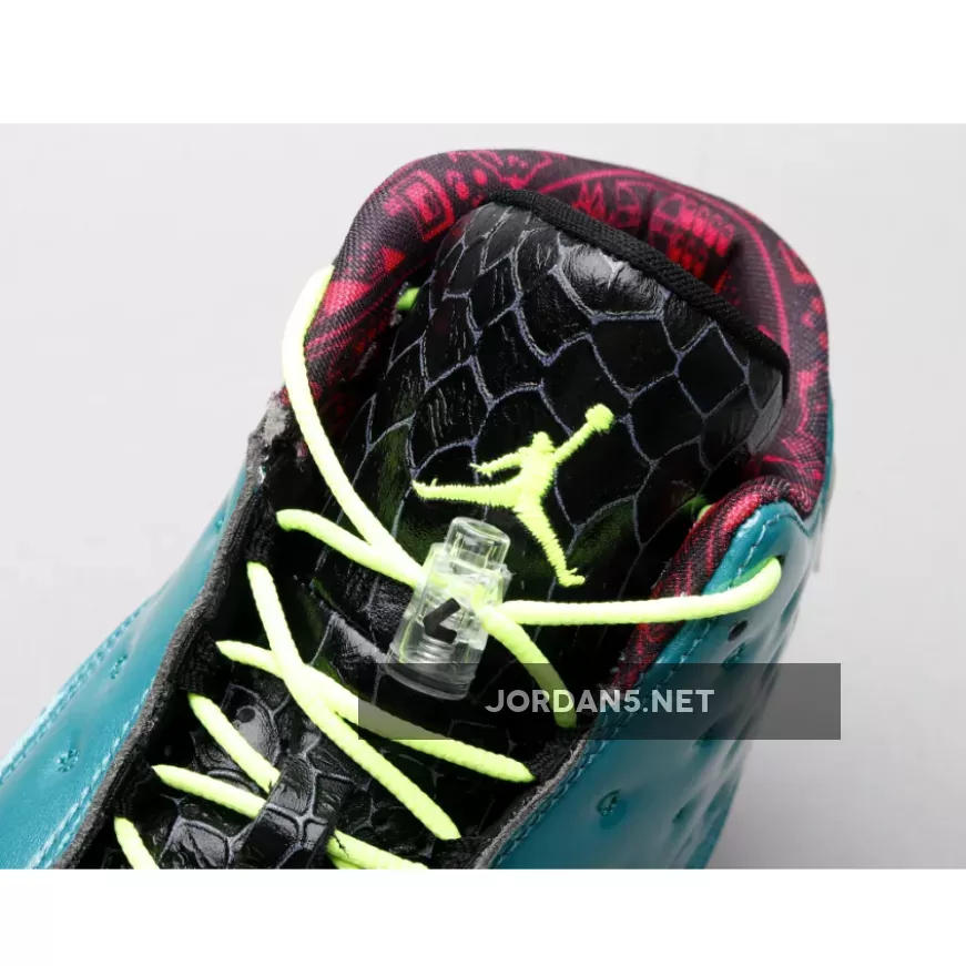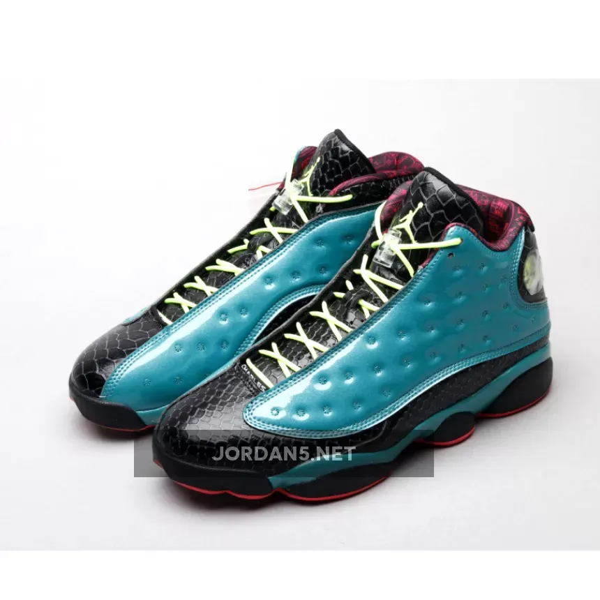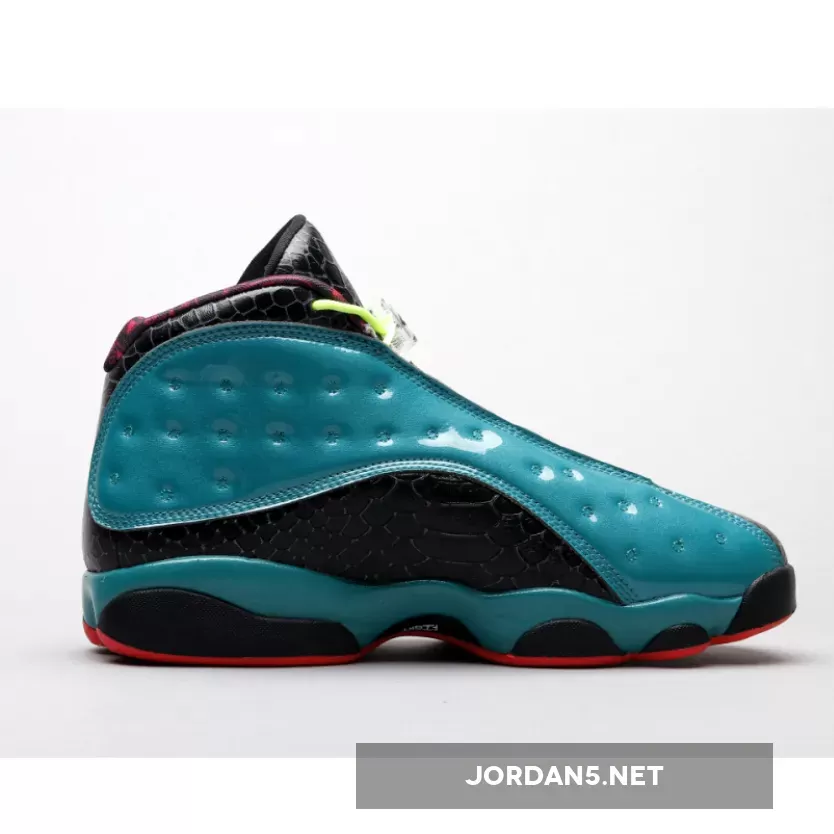 patient at the Doernbecher children’s hopsital battling Crohn’s Disease, John give the Air Jordan 13 a look quite unlike it’s ever seen before, featuring a glossy patent leather in snakeskin-embossed black and teal paneling.