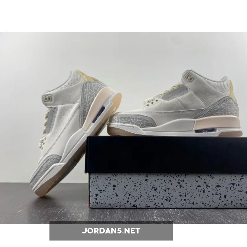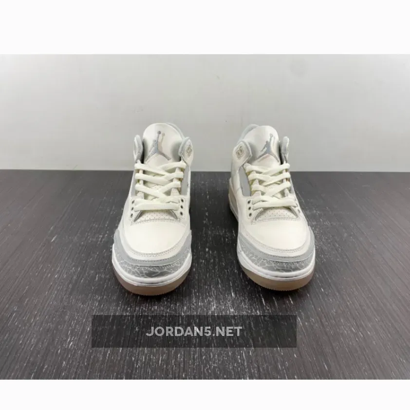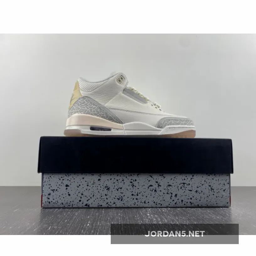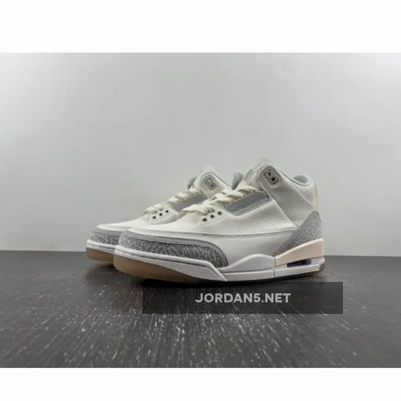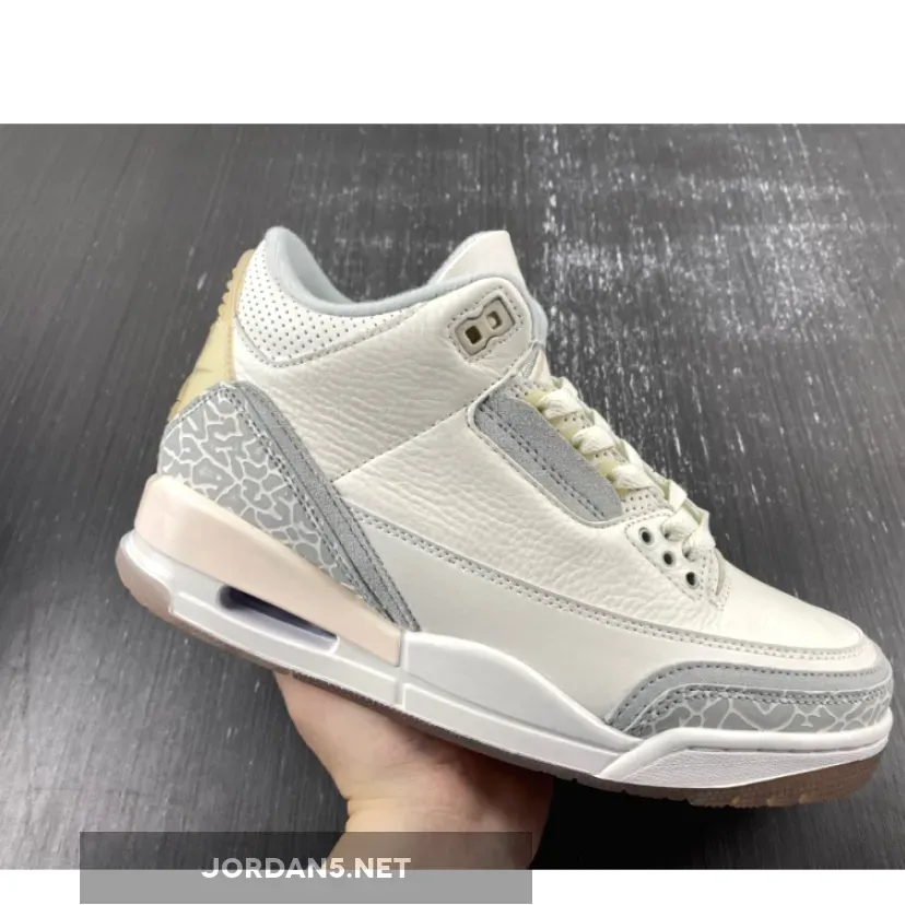 This particular rendition of the Air Jordan 3 showcases an elegant blend of Ivory, Grey Mist, and Cream hues. Its defining feature is the Ivory tumbled leather that envelops the upper, embellished with perforations encircling the collar. The smooth leather mudguards and suede overlays on the toe and heel introduce a tactile and visual contrast.