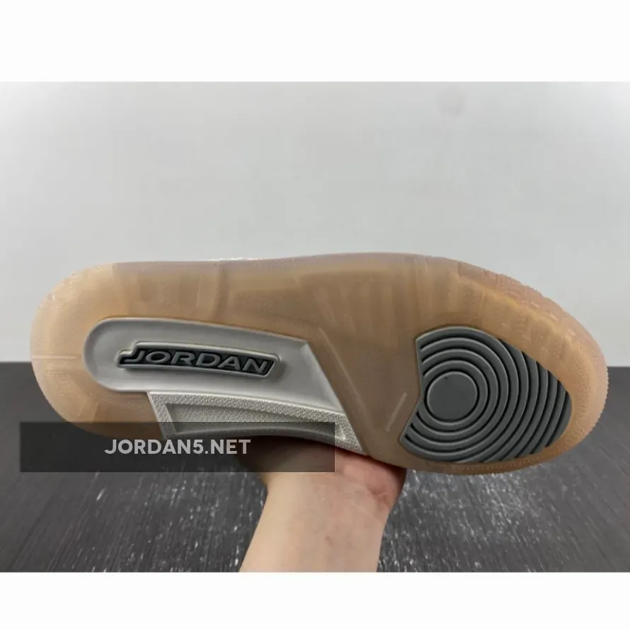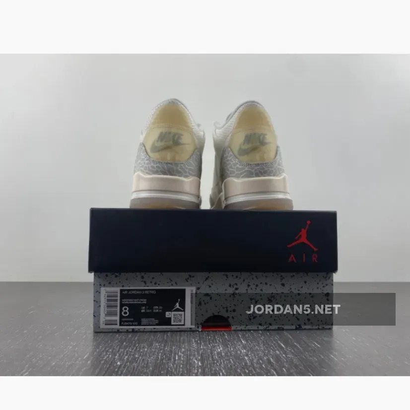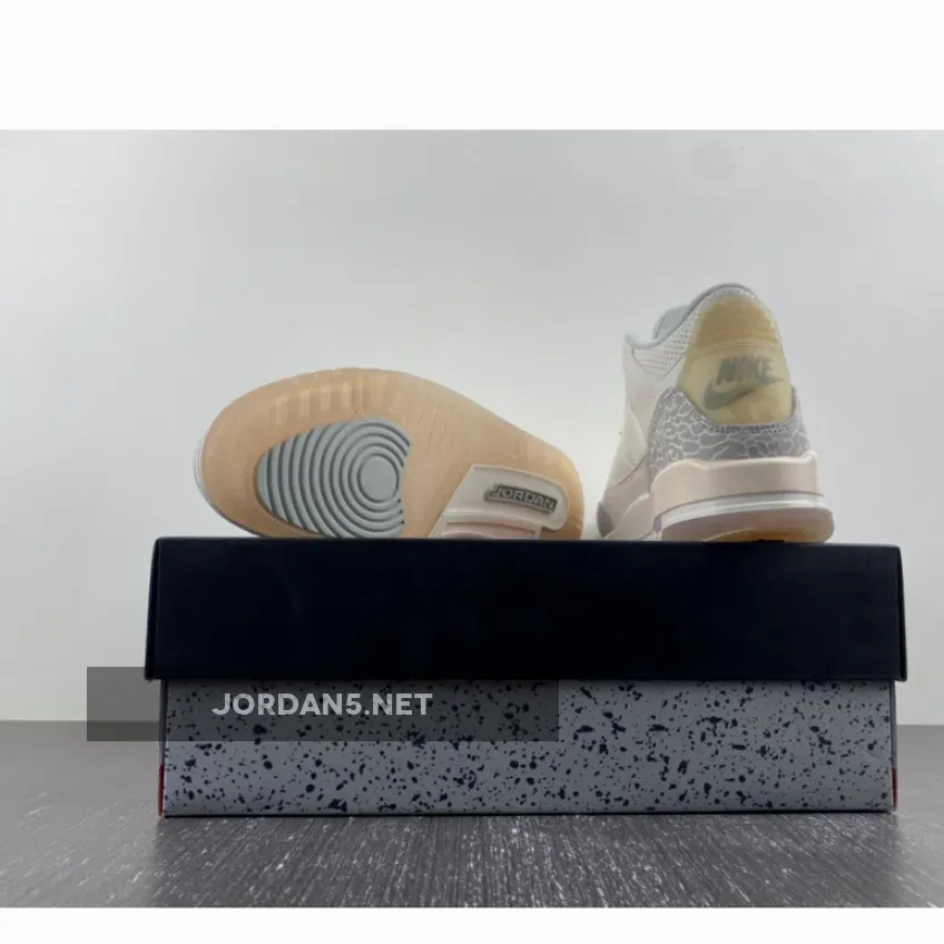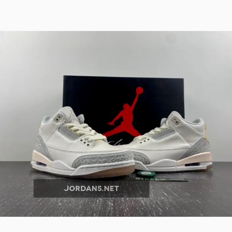 This particular rendition of the Air Jordan 3 showcases an elegant blend of Ivory, Grey Mist, and Cream hues. Its defining feature is the Ivory tumbled leather that envelops the upper, embellished with perforations encircling the collar. The smooth leather mudguards and suede overlays on the toe and heel introduce a tactile and visual contrast.