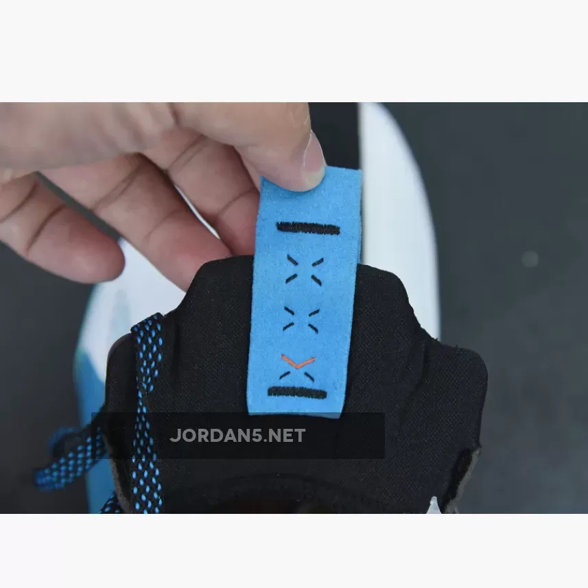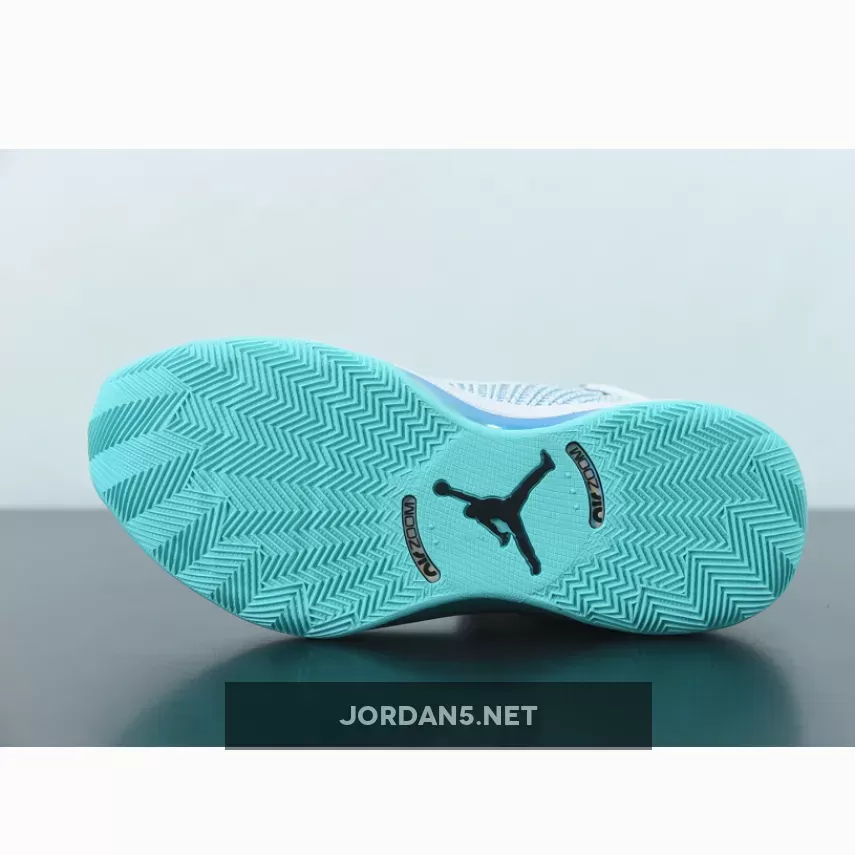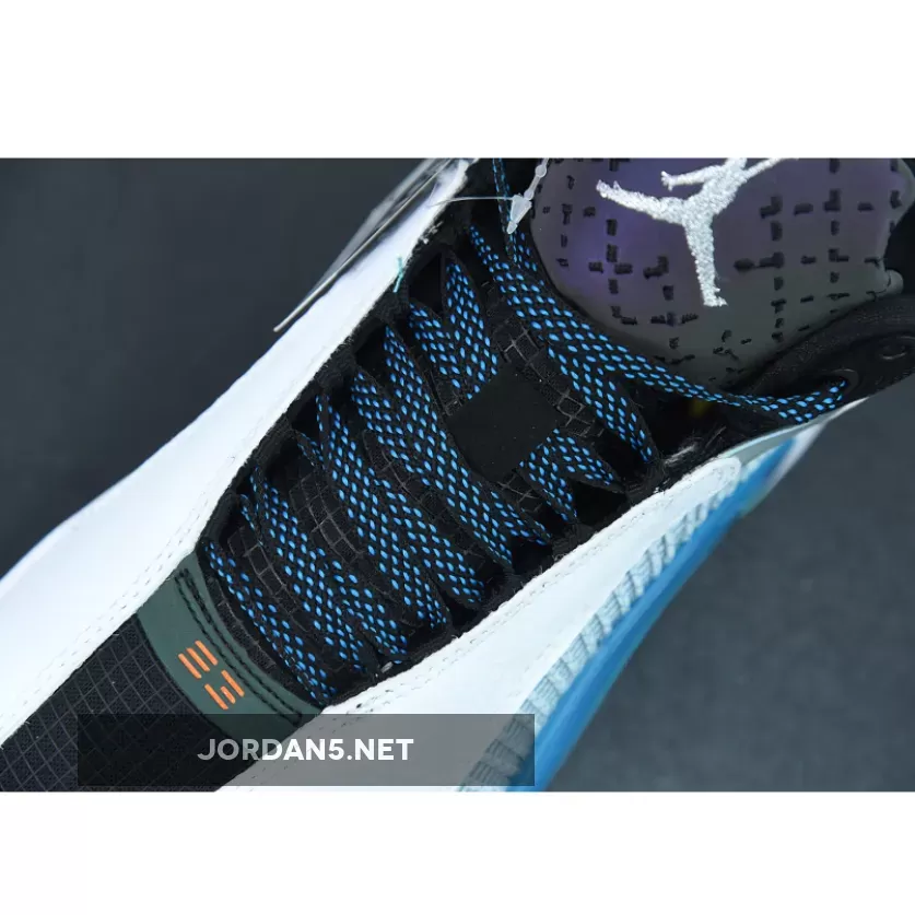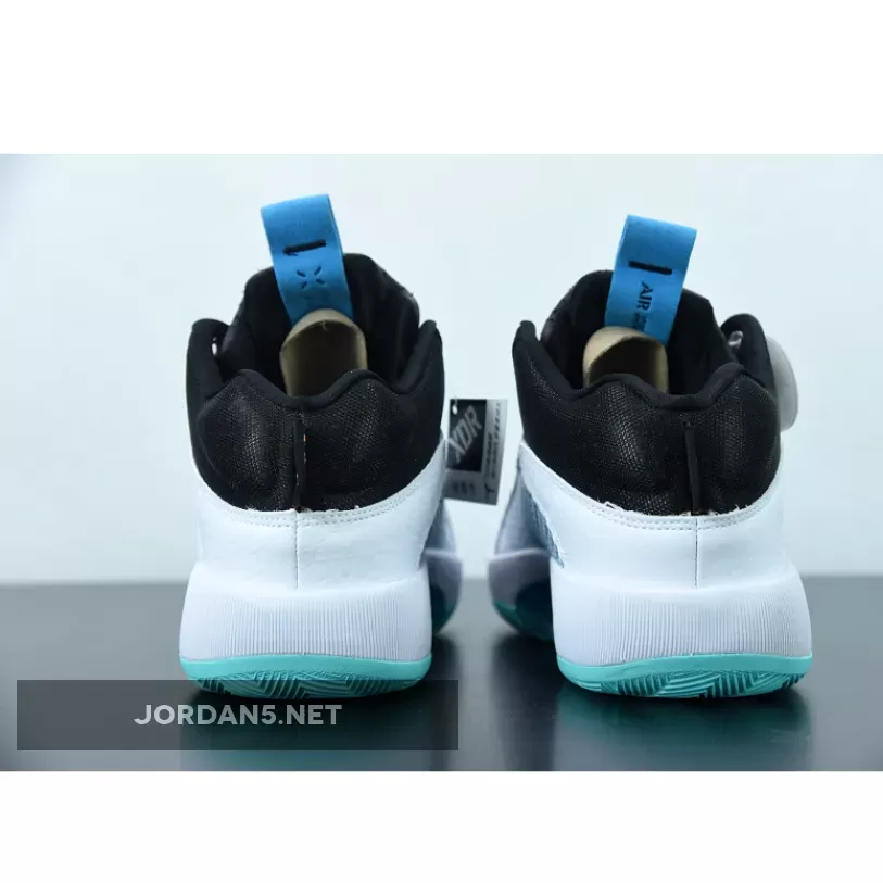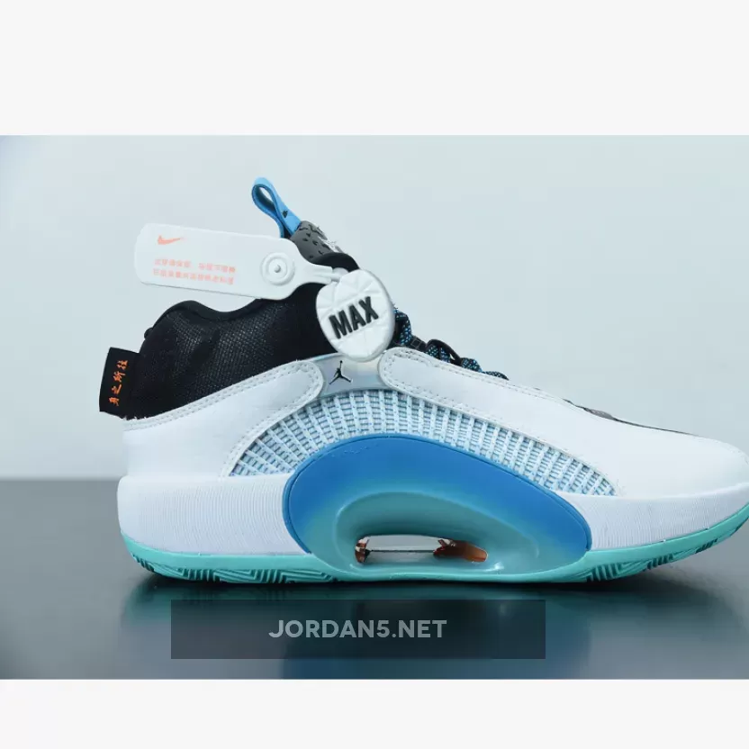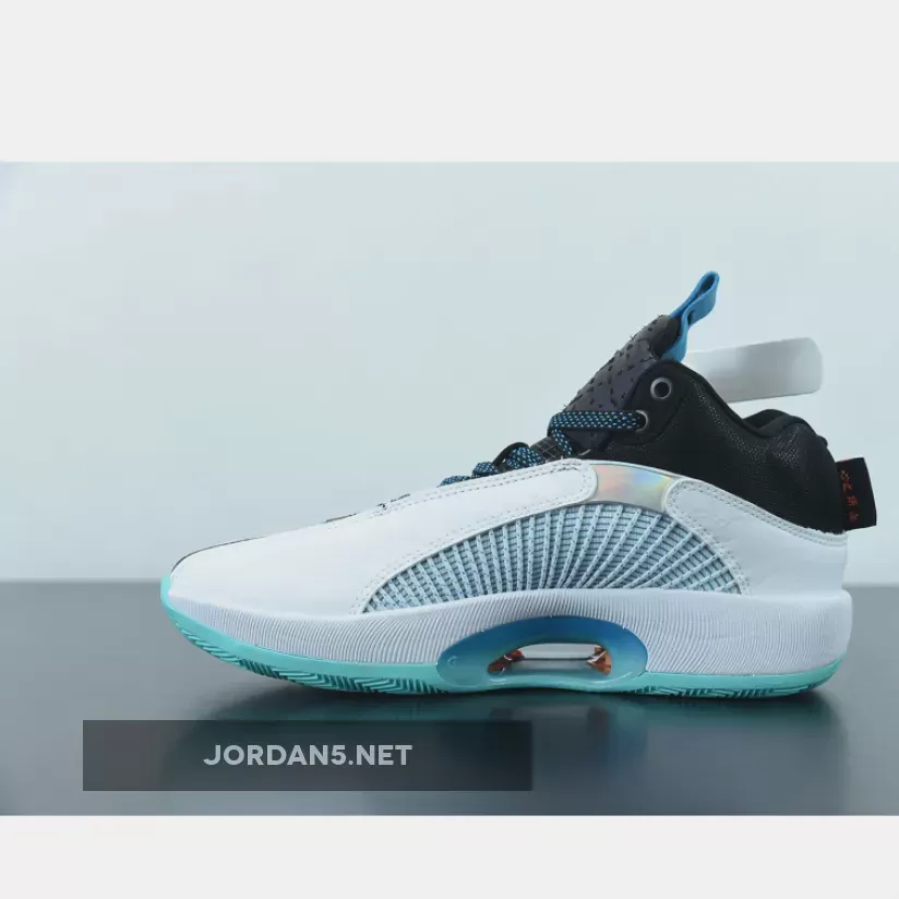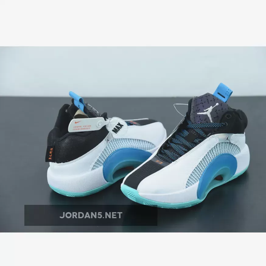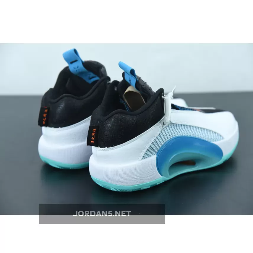 Going over this Air Jordan 35, it features both White and Black throughout the base. Next, we have Teal and Blue on the Eclipse plate, side panels, laces, tongue pull tab, and the rubber outsole. Guo Ailun’s logo adorns the right tongue while a Jumpman logo lands on the left. Following, the heel tag features Chinese characters in Red while more Red lands on some of the branding. Lastly, a unique graphic covers the insoles.