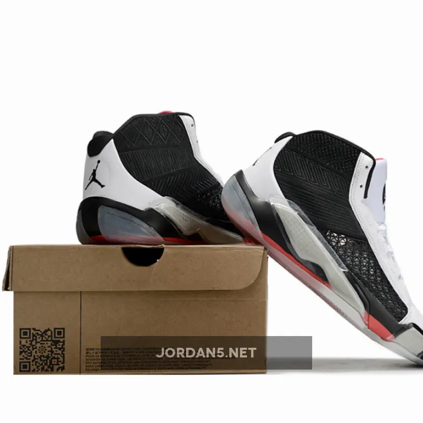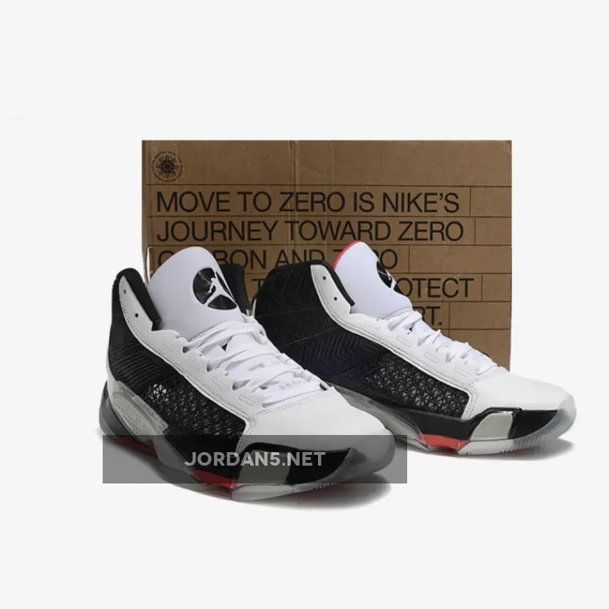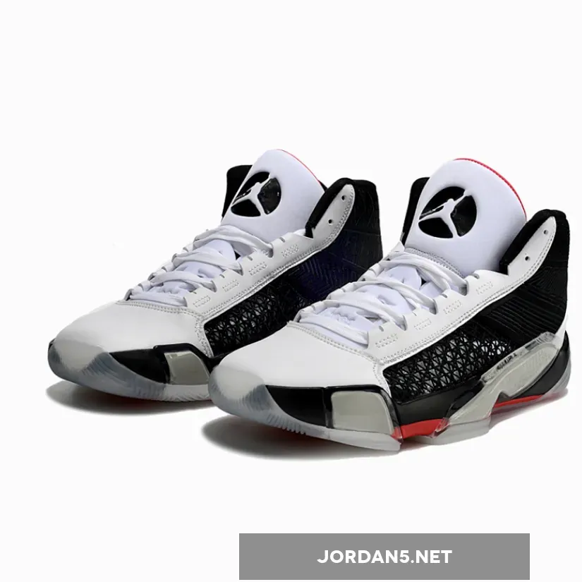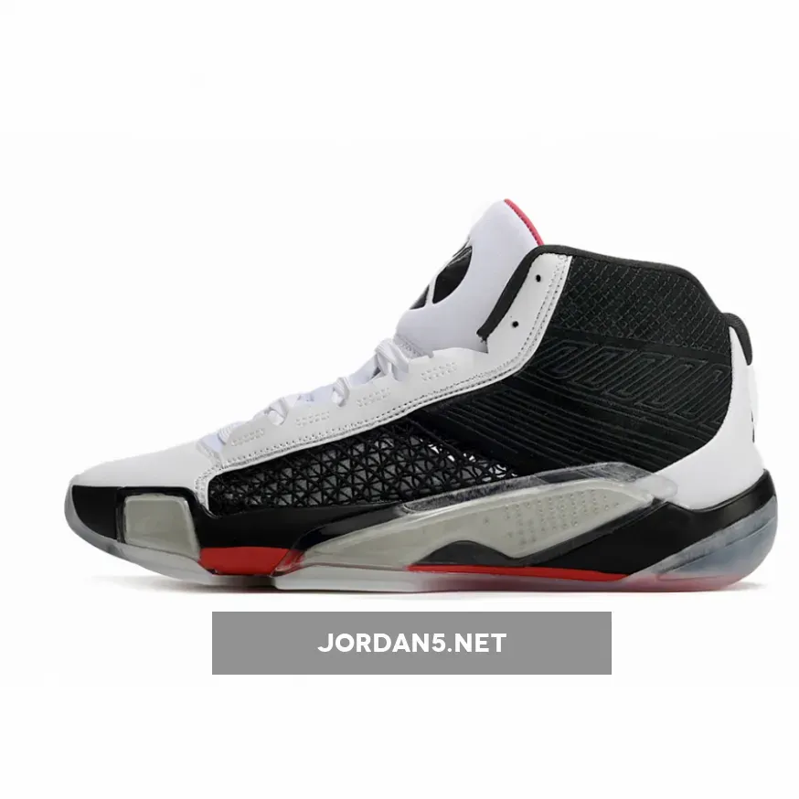 This offering of the Air Jordan 38 comes with a mid-top build features a White base with Black overlay panels along the mudguard and extended up to the ankle area. Along the toe box, tongue, and portions of the eyestays, we see white shades take over, with all but the tongue wrapped in leather.