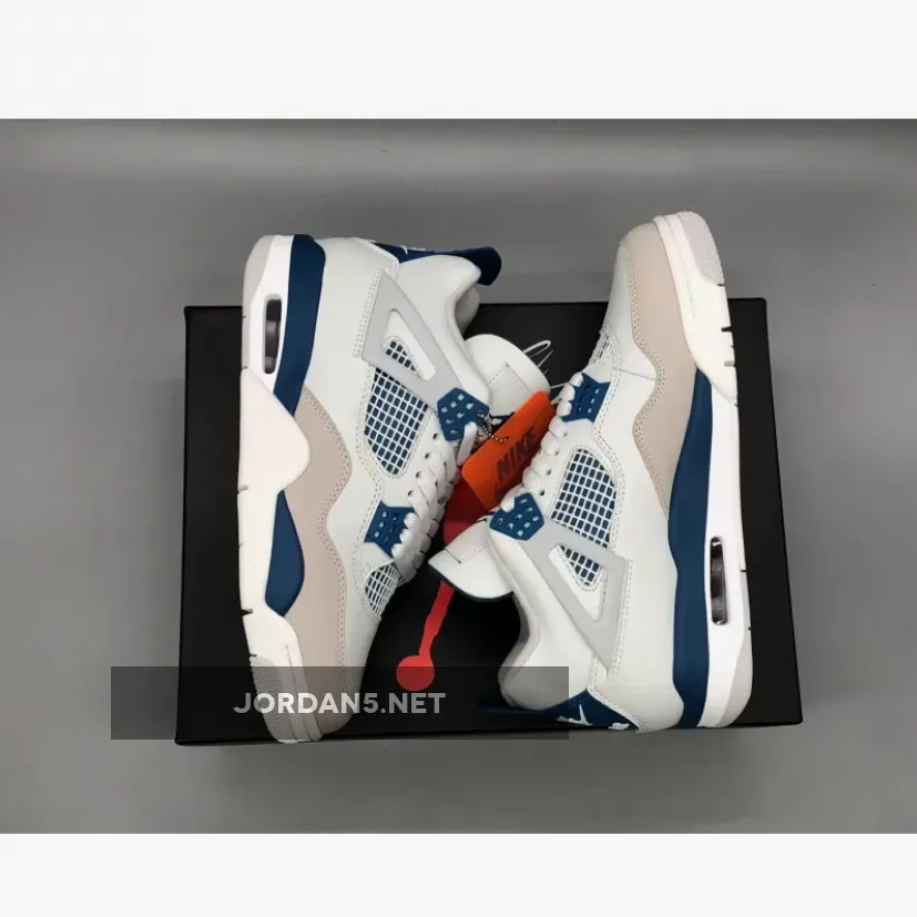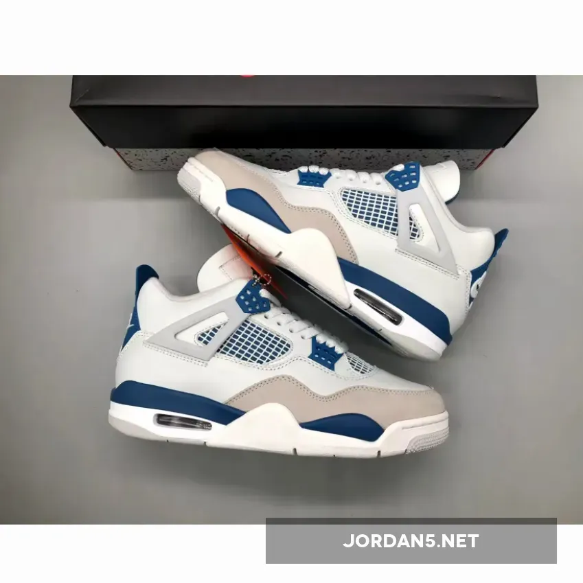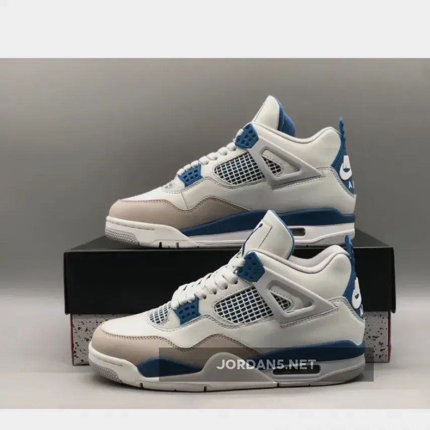 The Air Jordan 4 showcases a timeless color scheme consisting of Off-White, Military Blue, and Neutral Grey. Its upper is crafted from Off-White leather with overlays in Neutral Grey adorning the toe area. The quarter panel is equipped with a “Military Blue” underlay and topped off with the AJ4’s signature net. The design is elevated by Military Blue accents on the eyelets, midsole, heel tabs, and Jumpman logos on the tongues. Adding to the authenticity, the heels bear “Nike Air” branding in White, while a White, Blue, and Grey rubber outsole completes the overall aesthetic.