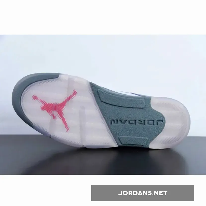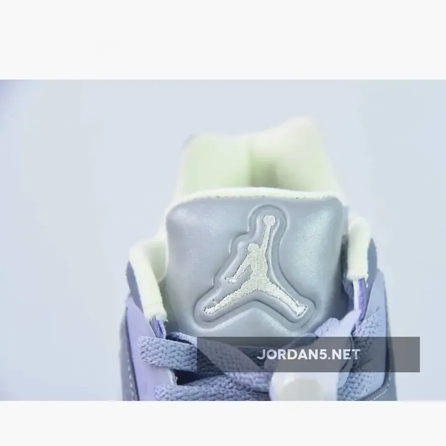 Off-white hits appear at the tongue’s Jumpman logo, the lining and Air Jordan 5’s signature wings at the midsole while an iridescent finish coats the remainder of the midsole.