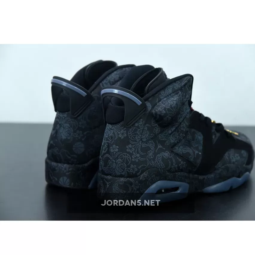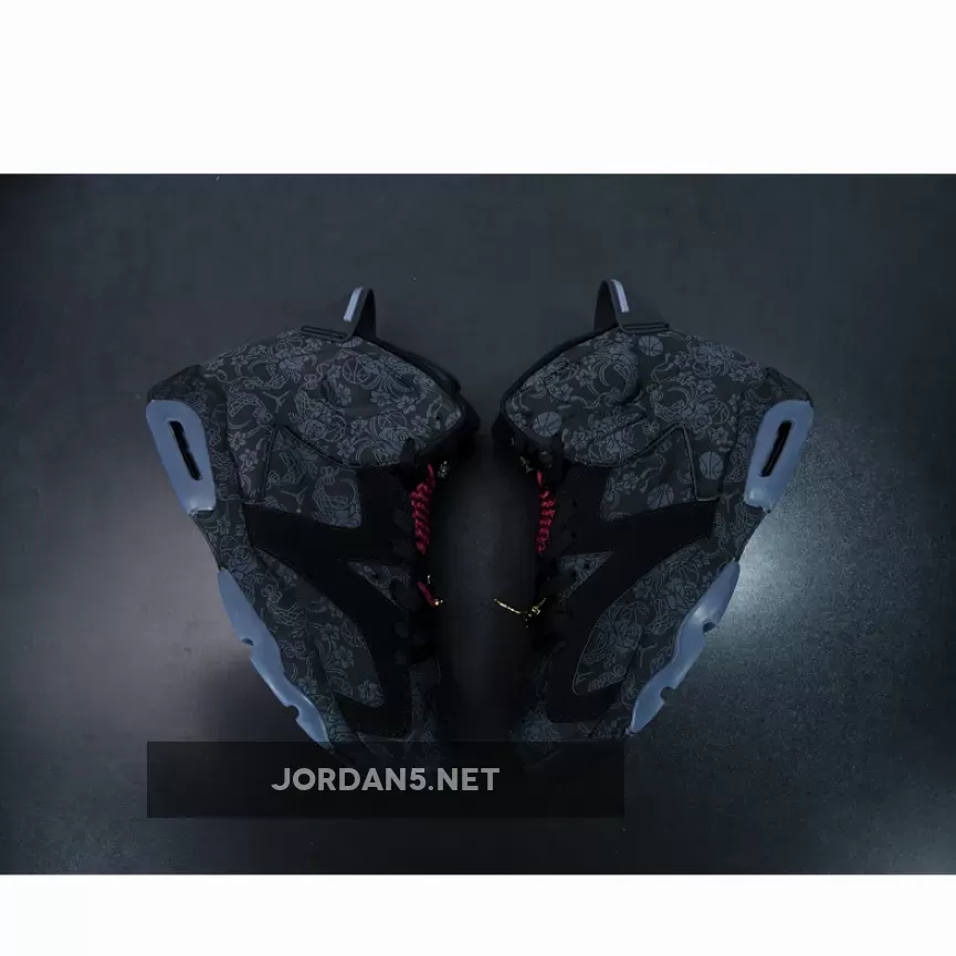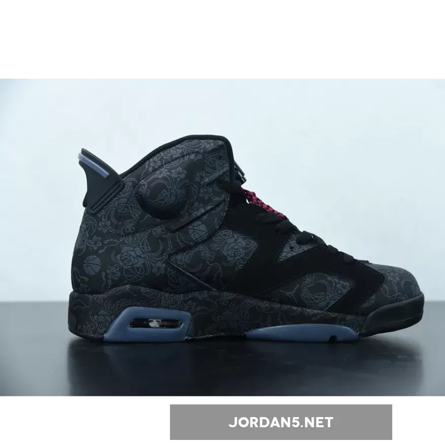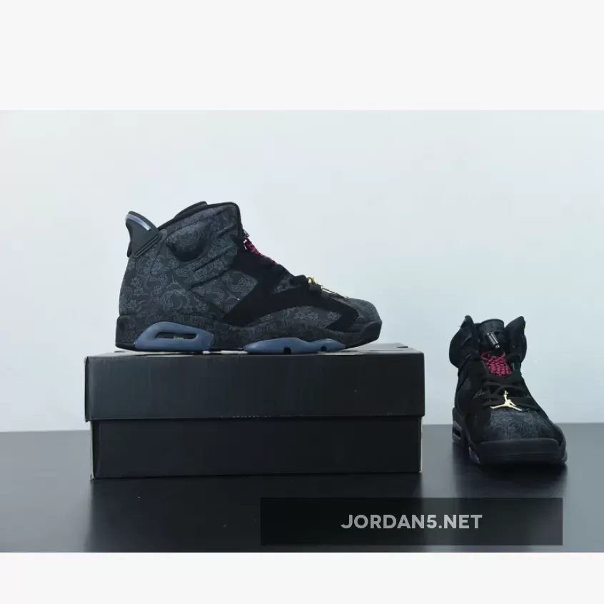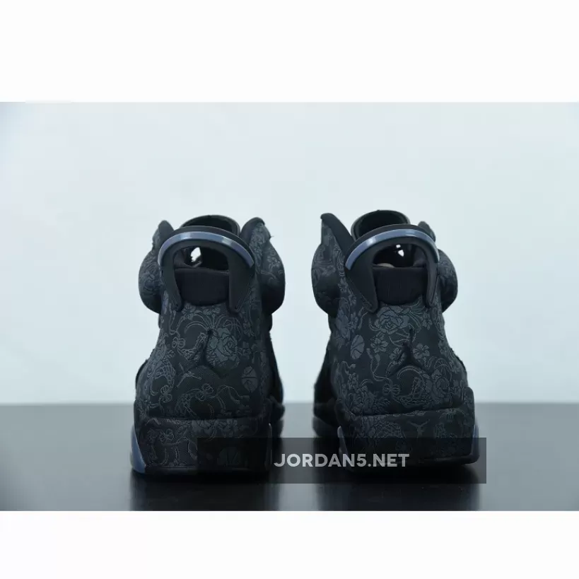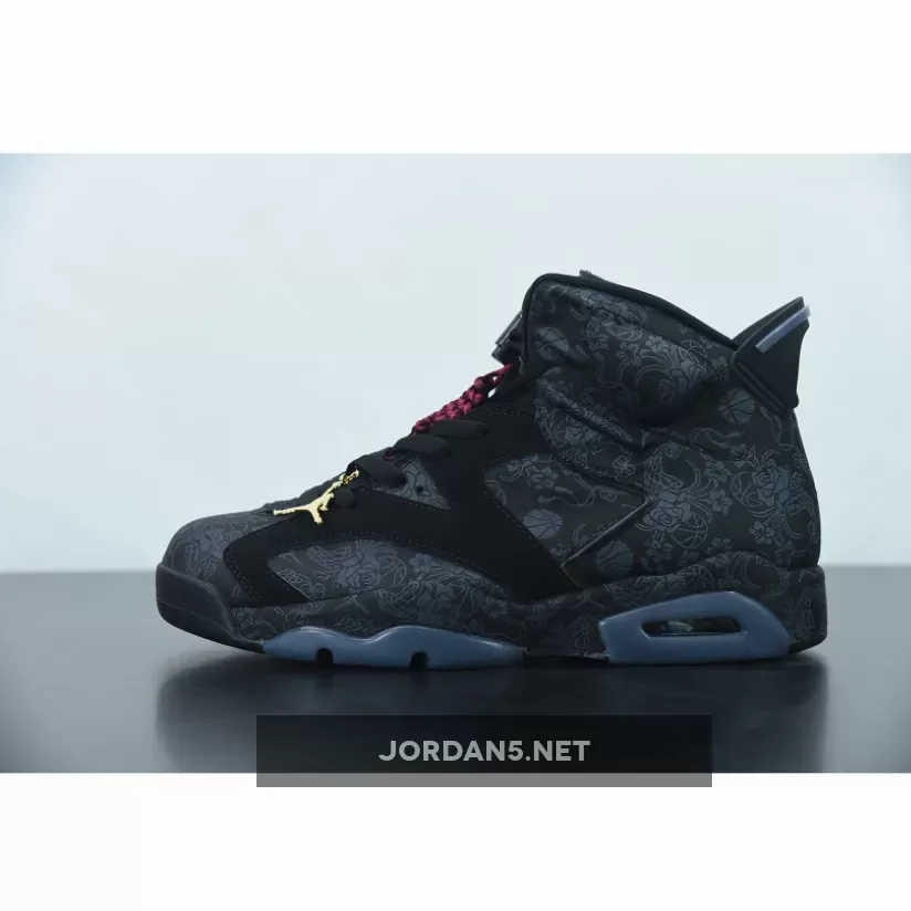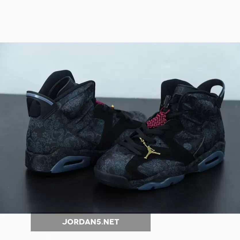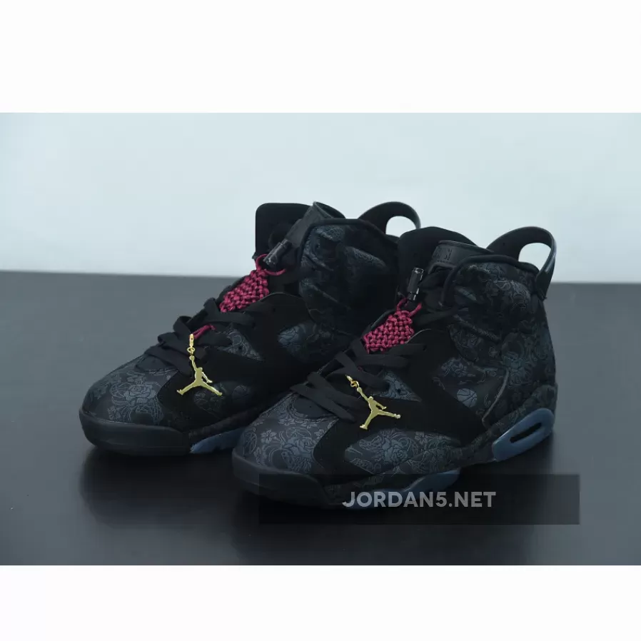 Highlighted with subtle graphics throughout, this Air Jordan 6 features a mostly Black theme. Firstly, the base receives the most attention from the textiles, while graphics of flowers, roses, and even basketballs subtly used. Additionally, Black nubuck then lands on the overlays and midsole, where the graphics placed again. Adding a splash of color is a heart-shaped lace lock-in Red and Metallic Gold on the hangtag. Finally, a Black rubber outsole completes the look.