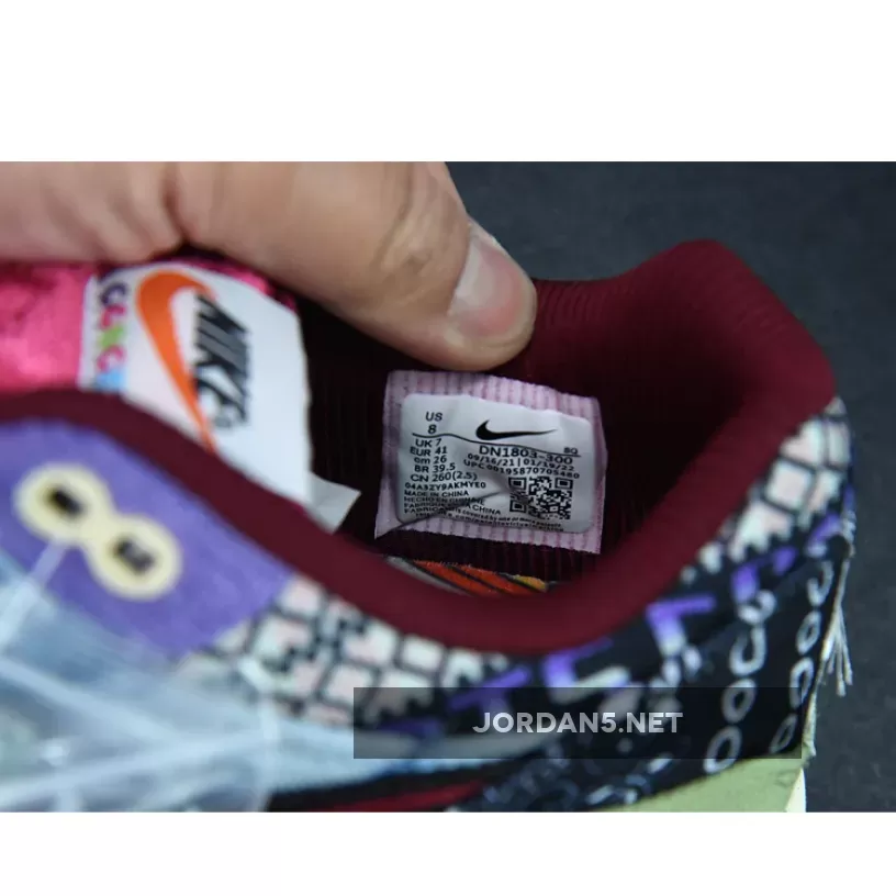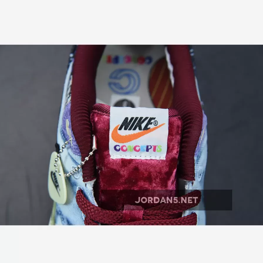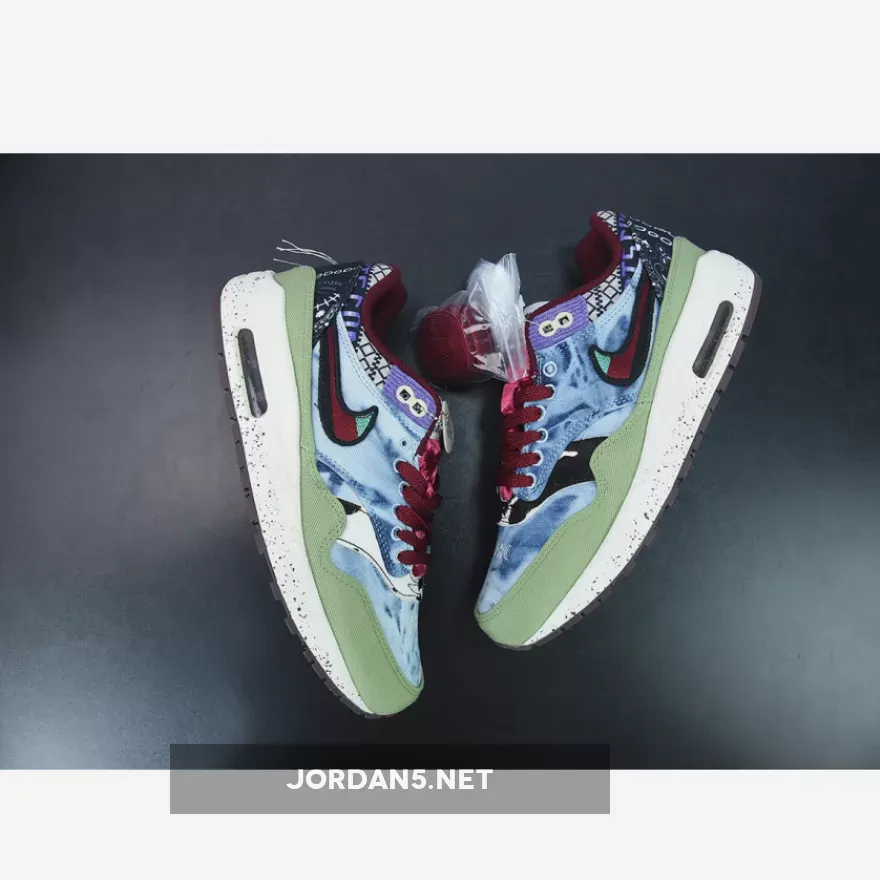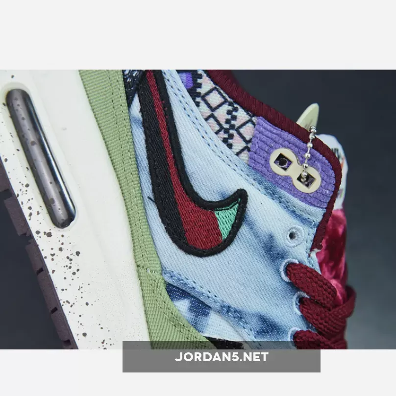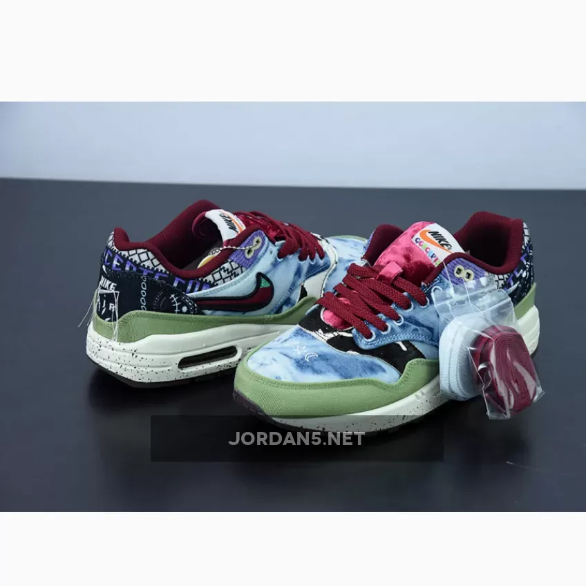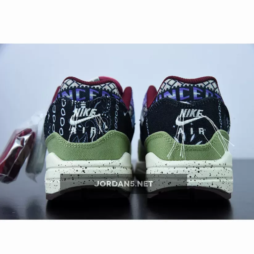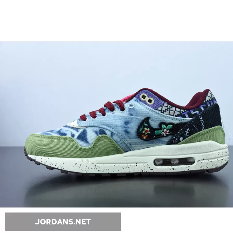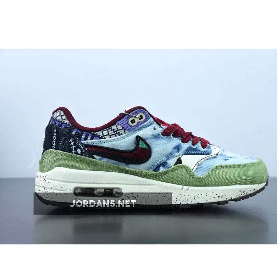 Streetwear and luxury brand based out of Boston, Concepts, teams up with Nike to celebrate the 35th anniversary of the Nike Air Max silhouette. Introducing the Concepts x Nike Air Max 1 Olive Canvas.The upper features various materials and a rich mix of colours. The toebox, eyestay panel and quarter are all in stonewashed blue denim. The titular Olive Canvas wraps around the toe cap, the mudguard and the heel. A dark grey star outline is embroidered on the lateral side of the toe cap. The signature profile Swooshes adorn the quarters. A red, black and mint green striped Swoosh outlined in black is on the medial side while a retro floral print Swoosh with embroidery is on the lateral side. A Mexican blanket print in black and white covers cupsole.The ankle collar shows off a Southwestern tribal pattern with pops of purple. The mesh sockliner and satiny tongue are all in rich burgundy. Co-branding appears on the tongue while Concepts branding in purple stands out on the white insole. A co-branded guitar pick hang tag is attached to the collar eyelet.