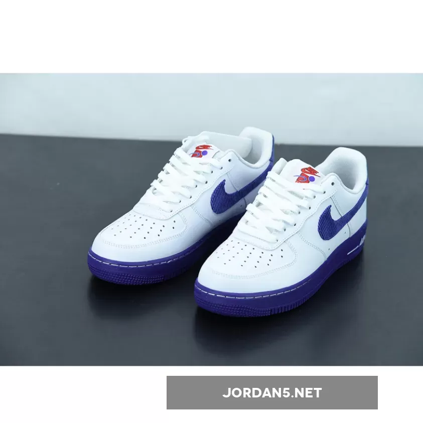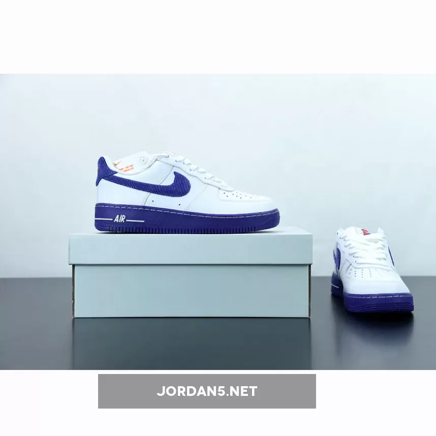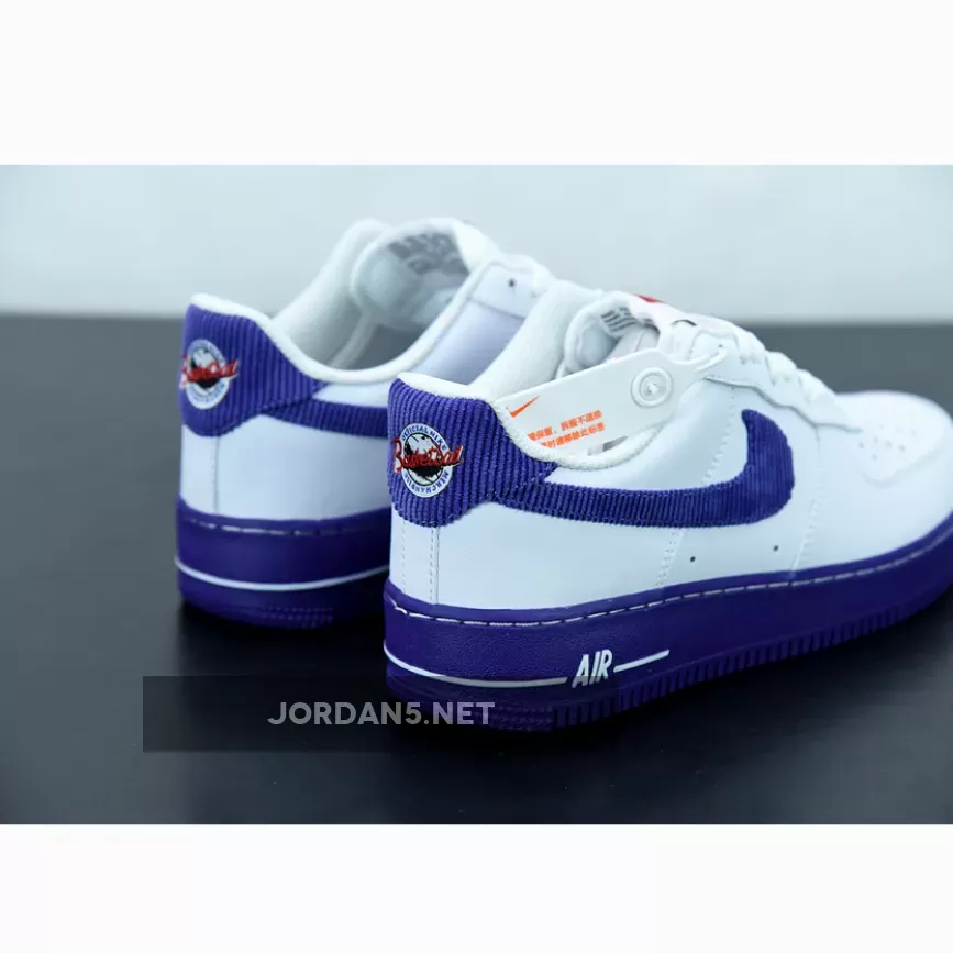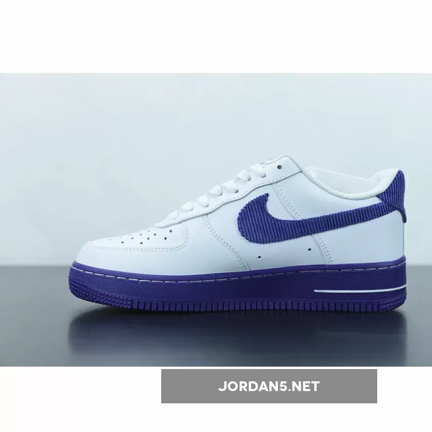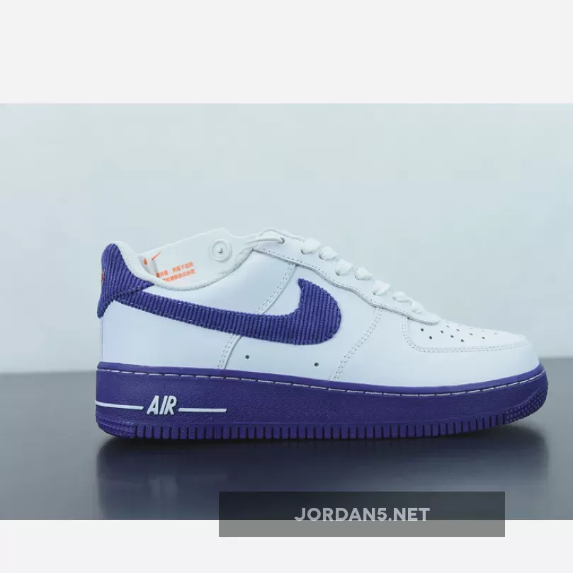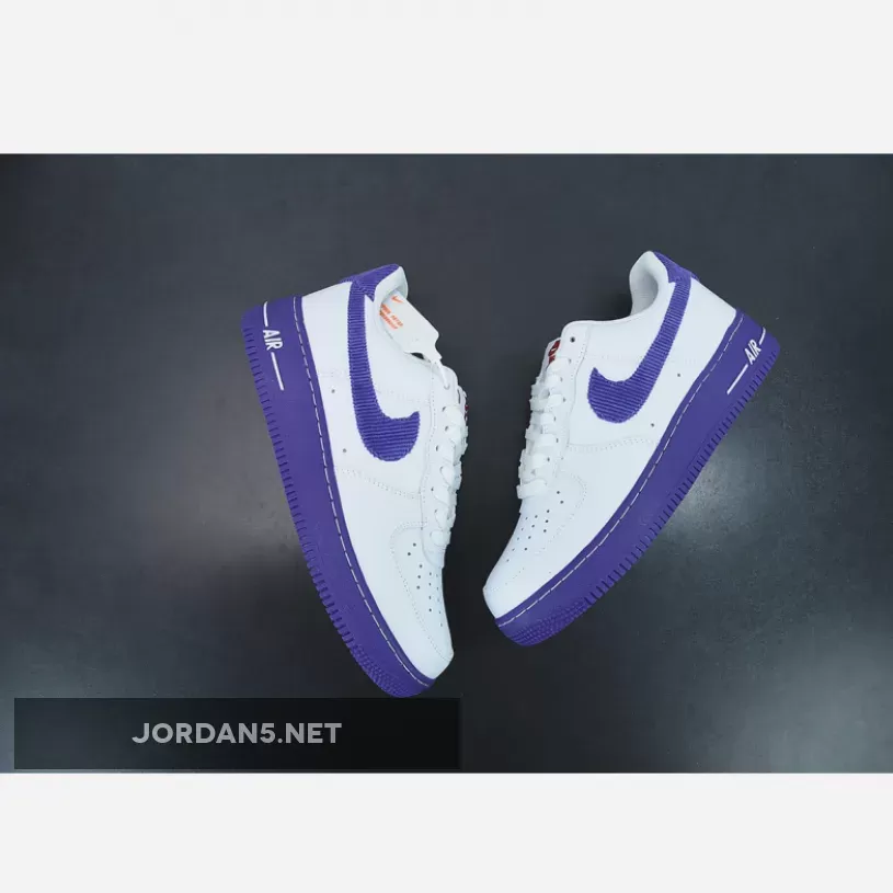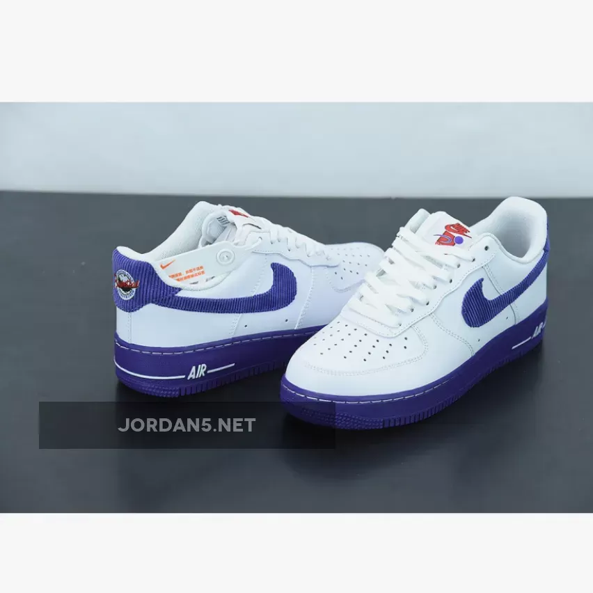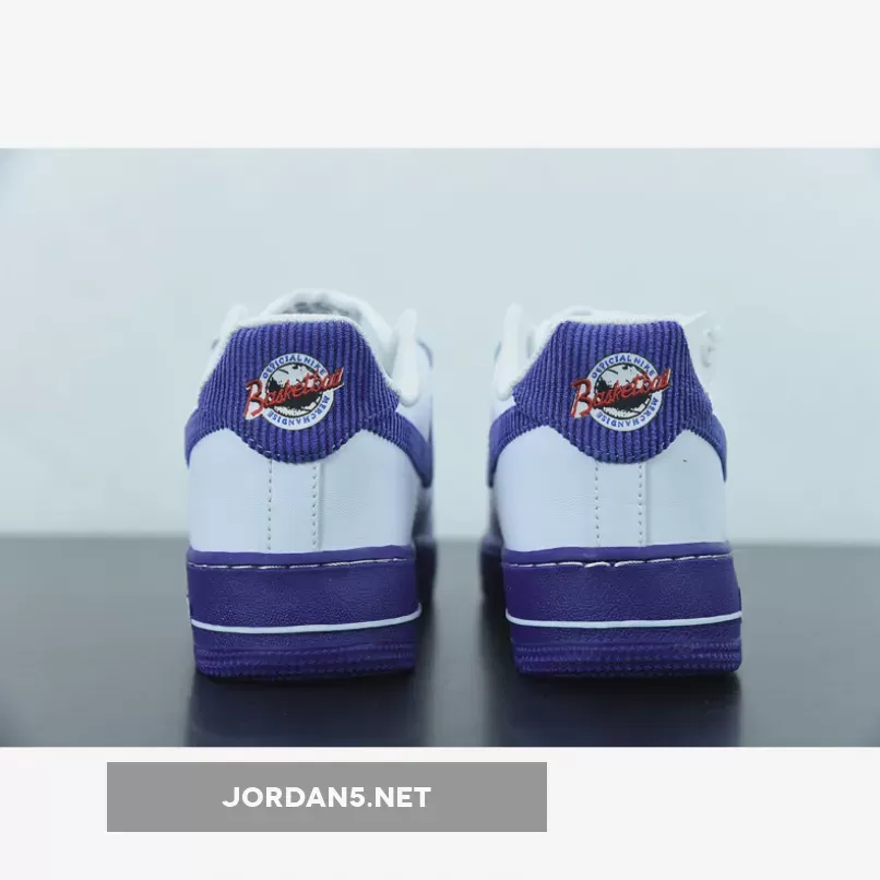 This offering of the Nike Air Force 1 features a White leather upper with Purple corduroy Swoosh and heel overlays and matching colored soles. Other details includes a patch on heels that read “Official Nike Basketball Merchandize”, while the tongue tag comes with the Sports Specialties logo and traditional Nike branding.
