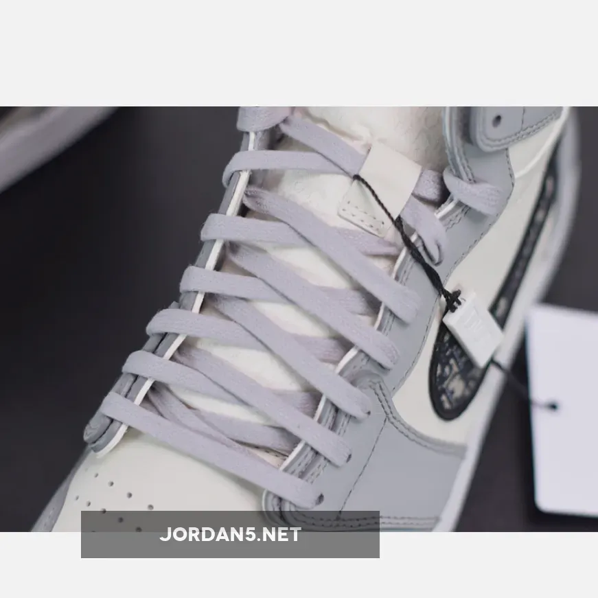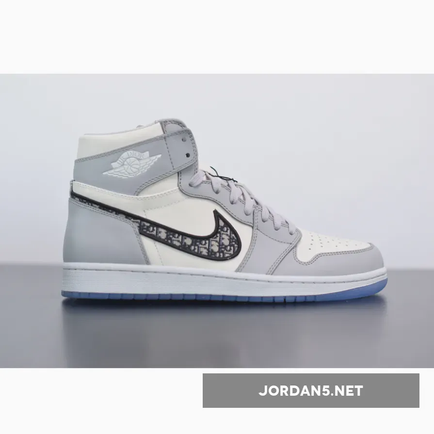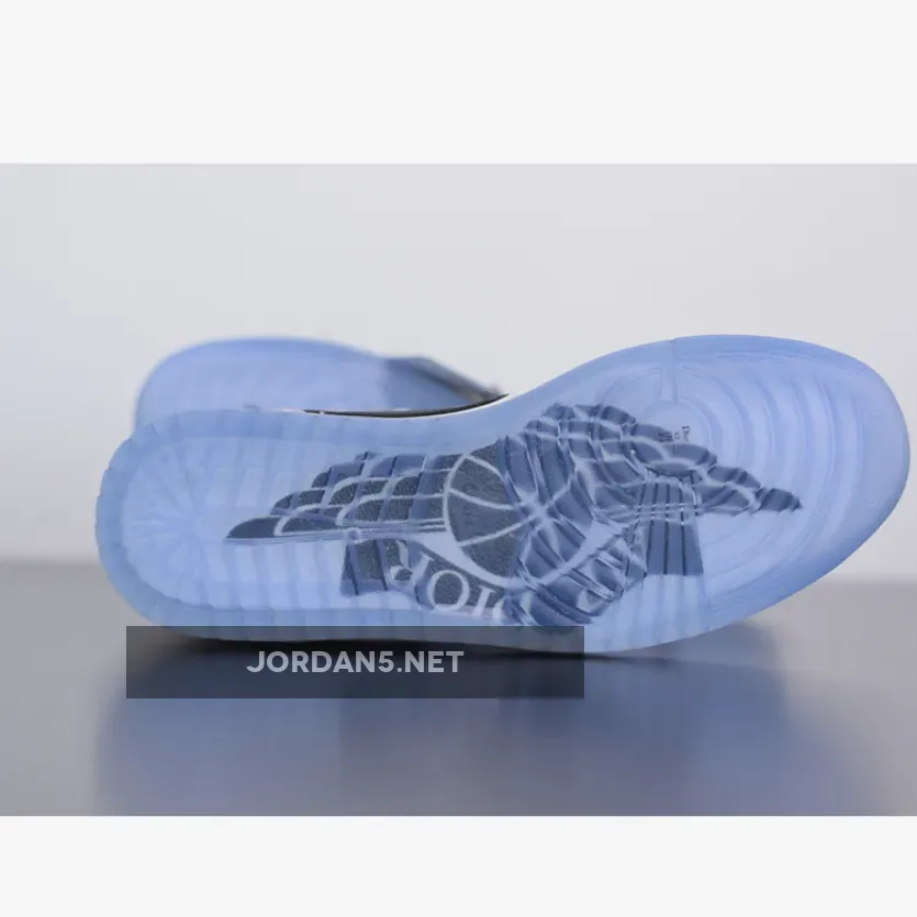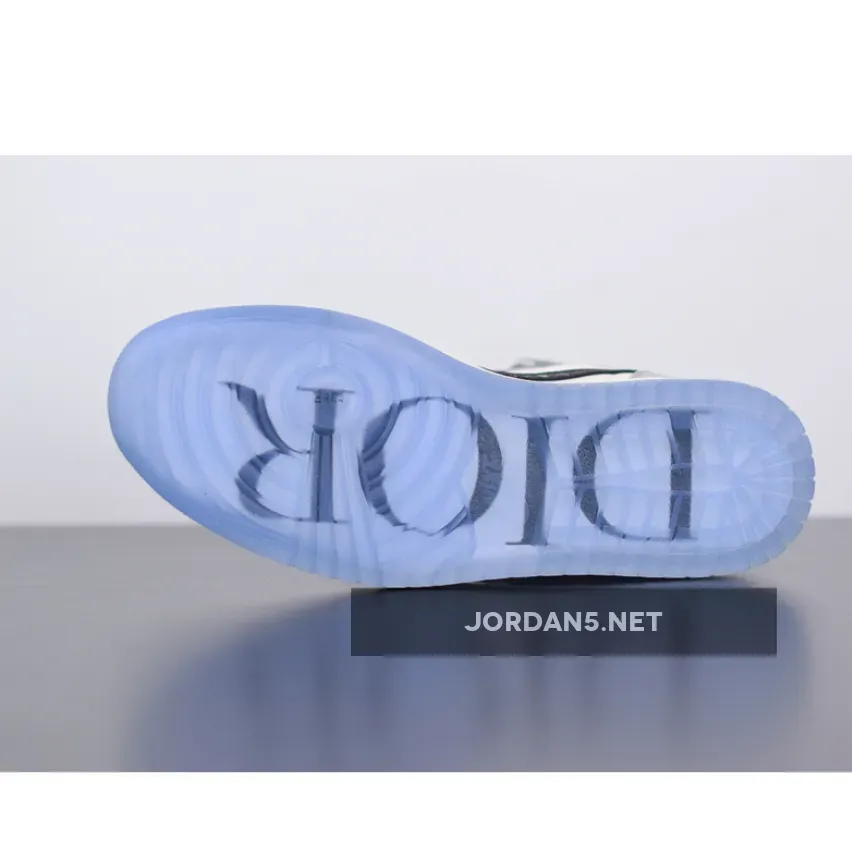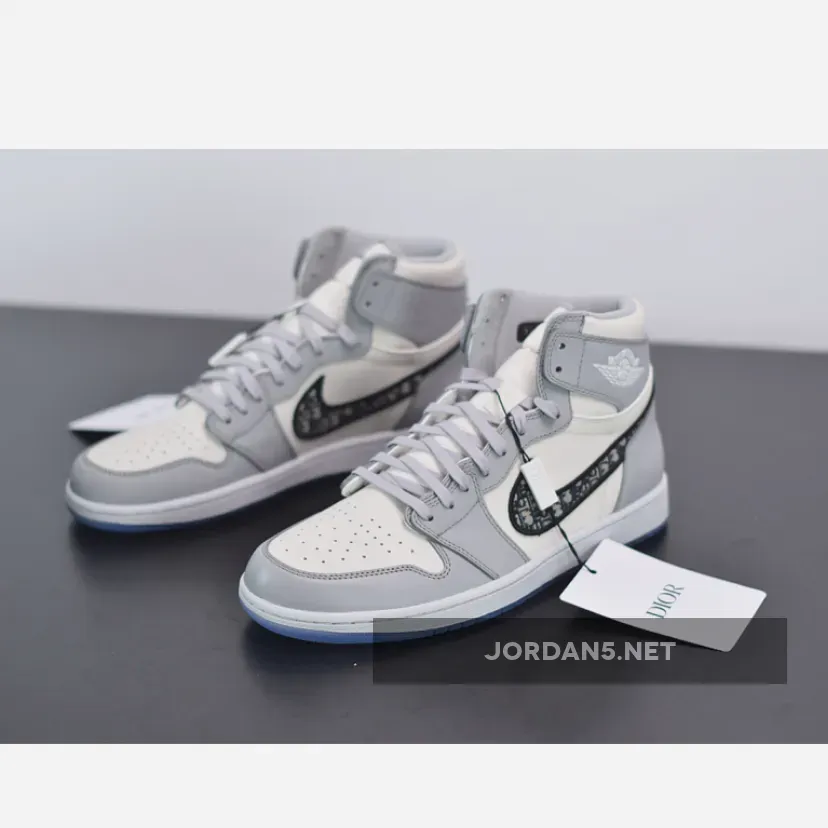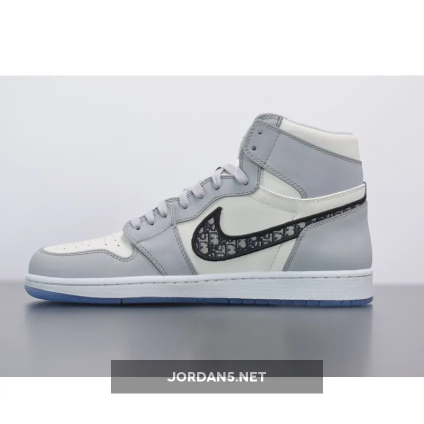 This Dior x Air Jordan 1 features a White and Grey upper with “Air Dior” branding on the tongues and above the Wings logo. An all-over printed Swoosh logo on the sides atop a co-branded icy translucent outsole with a Silver Jumpman and “Air Dior” Wings hangtag completes the design.