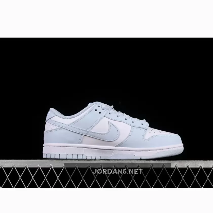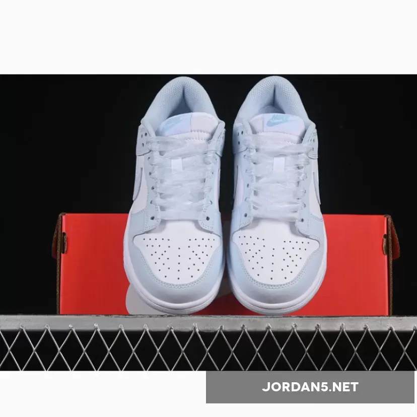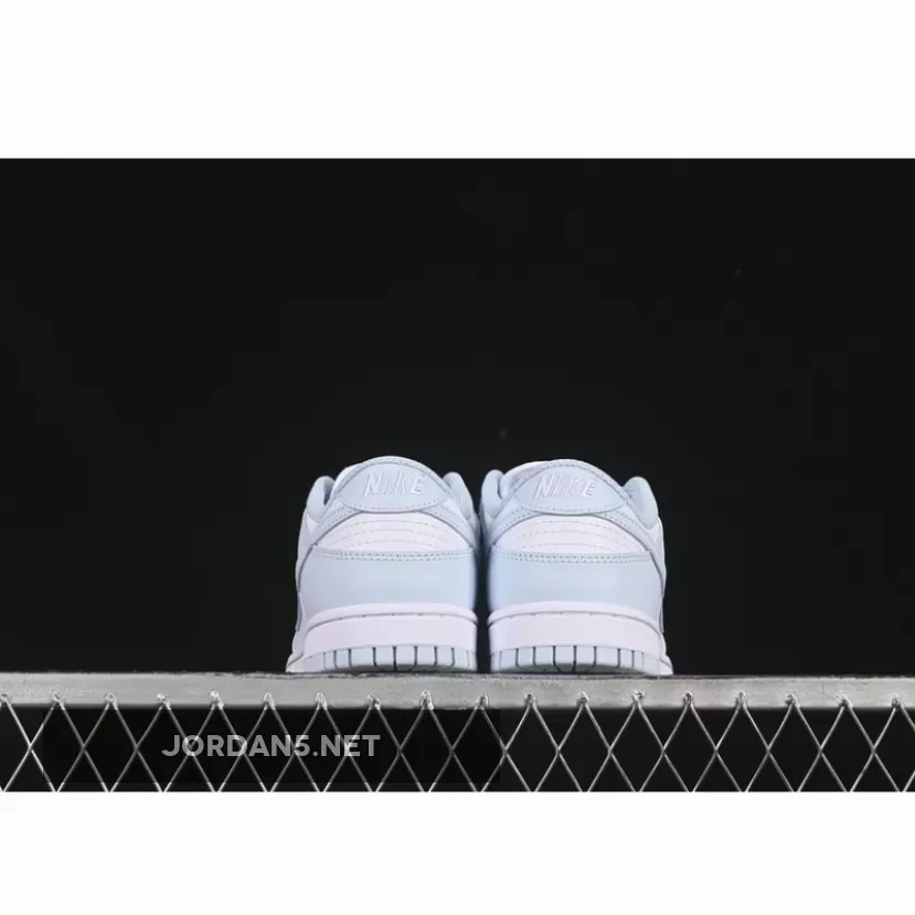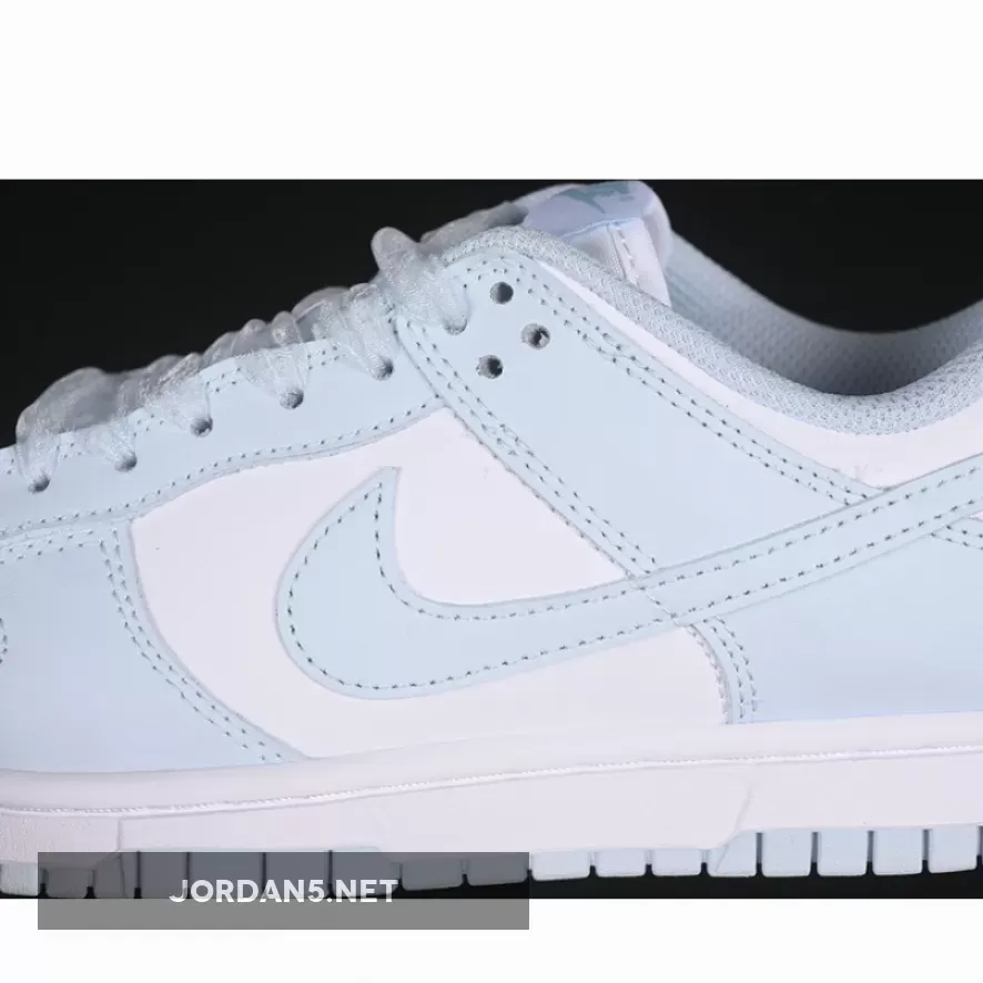 This classic low-top silhouette exudes simplicity while maintaining iconic DNA from the original Dunks. Clean lines dominate throughout—the sleek toe box transitions seamlessly into smooth lateral sides adorned by subtle perforations enhancing breathability. The signature Swoosh adorns both medial side and heel counter in matching light-blue tones harmonizing perfectly within this monochromatic palette.
