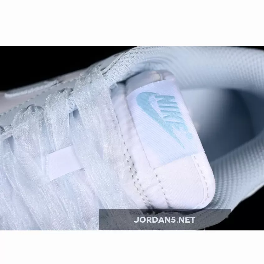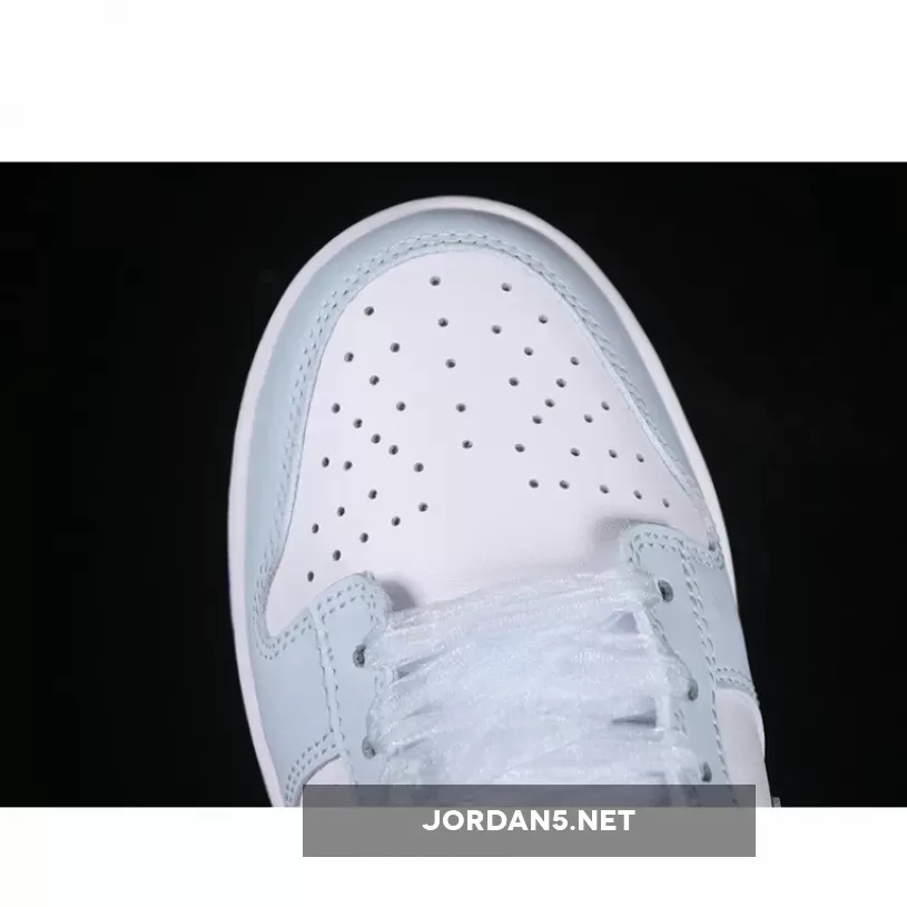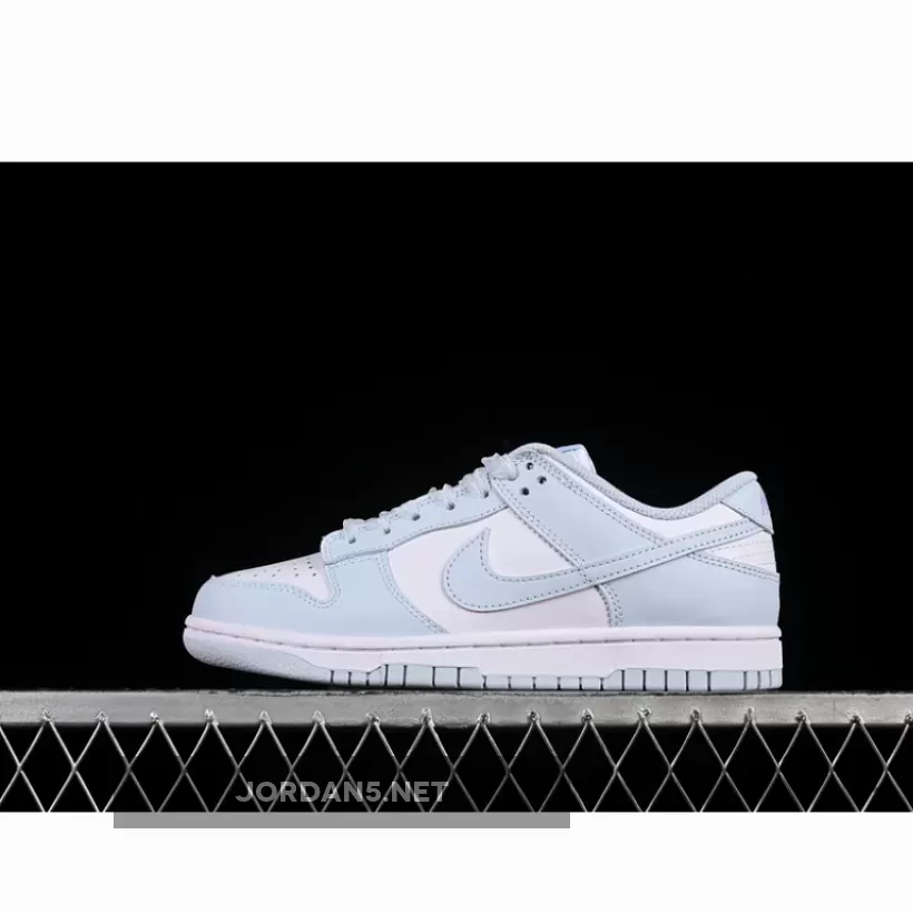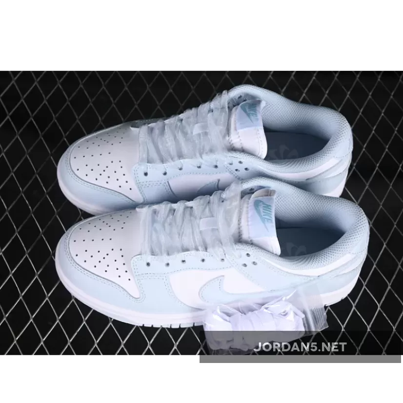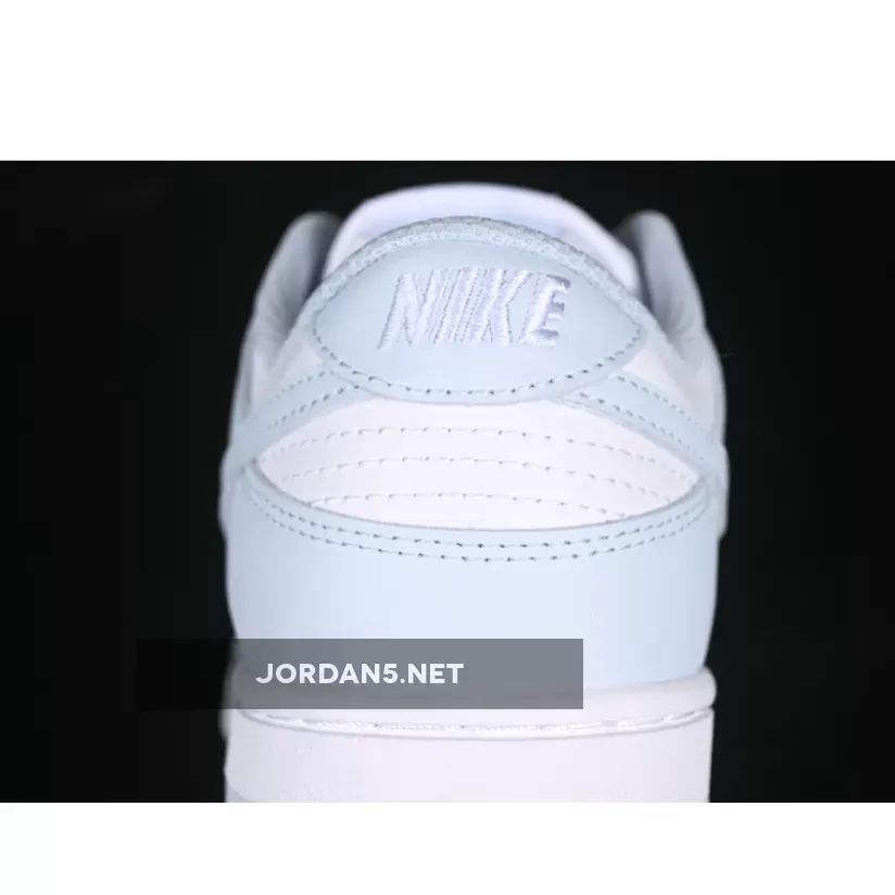 This classic low-top silhouette exudes simplicity while maintaining iconic DNA from the original Dunks. Clean lines dominate throughout—the sleek toe box transitions seamlessly into smooth lateral sides adorned by subtle perforations enhancing breathability. The signature Swoosh adorns both medial side and heel counter in matching light-blue tones harmonizing perfectly within this monochromatic palette.