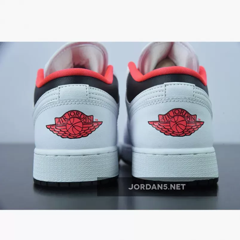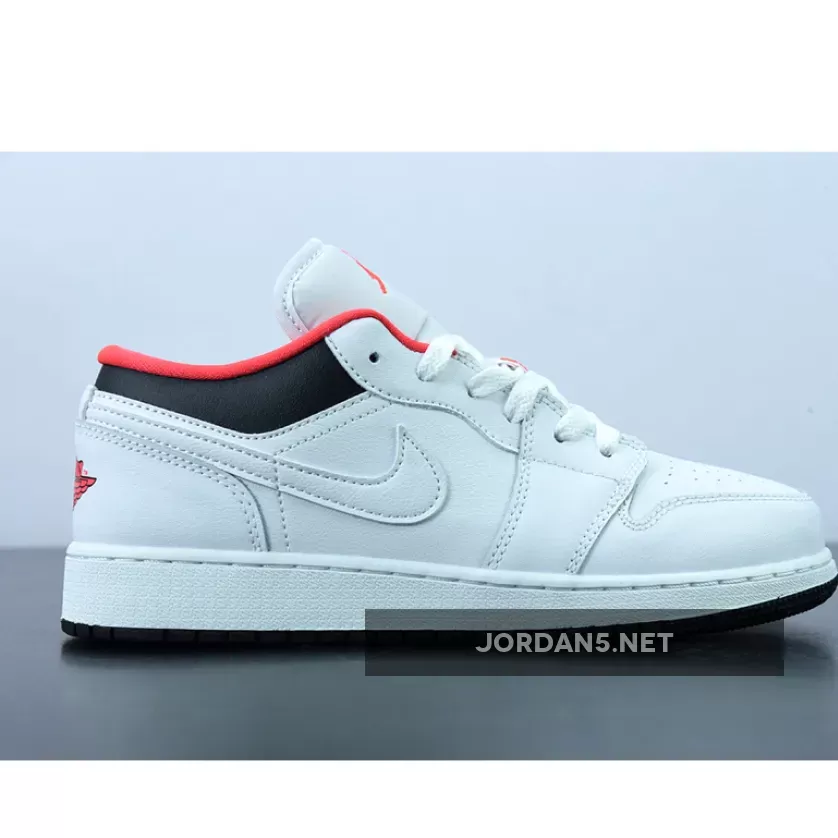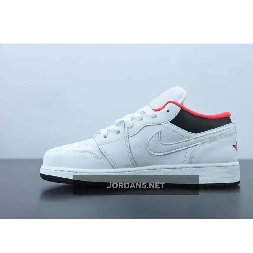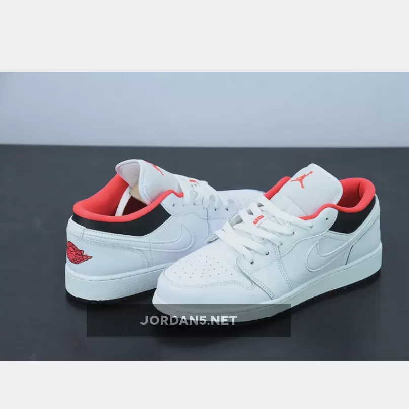 This Air Jordan 1 Low features White leather on the base while Black appears on the collar and rubber outsole. Following, White hits the Swoosh logos, laces, and midsole, with Red appearing in the tongue, liner, insole, and Wings logo.