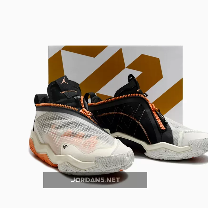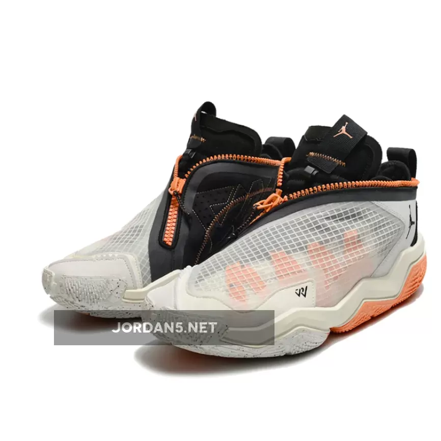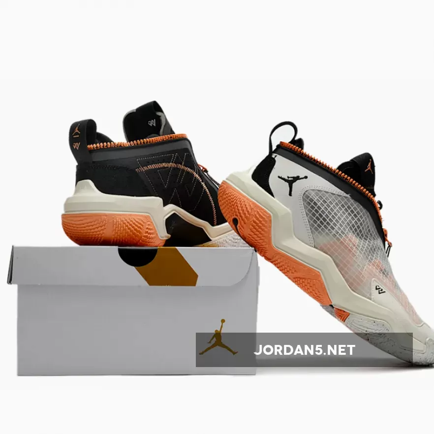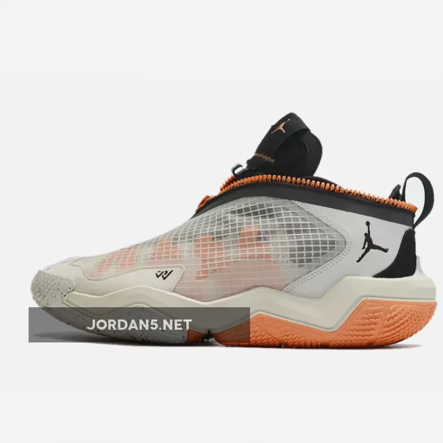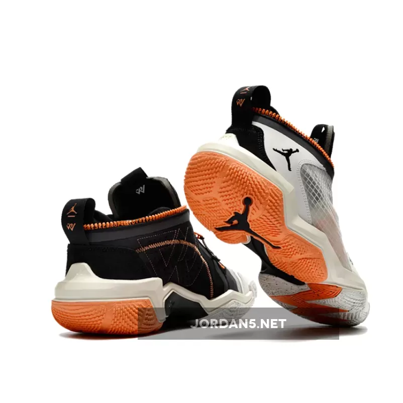 Crafted from suede and technical ripstop, The collar is decorated with a unique orange trance zipper design that spells out “Why Not,” and logos for Jumpman and Westbrook are finely stitched across the lateral sidewall.