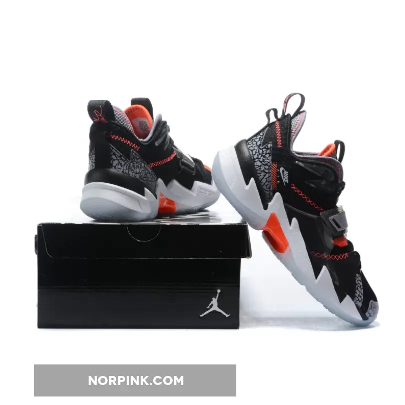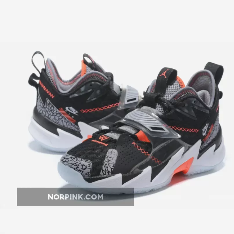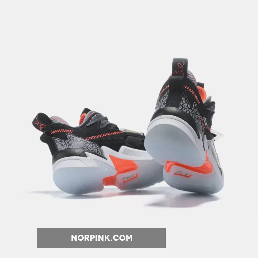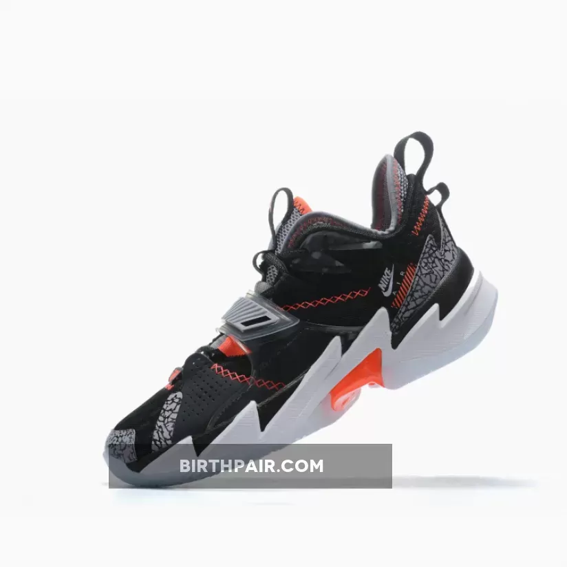 Dressed in a Black, Bright Crimson, Cement Grey, and White color scheme. This Jordan Why Not Zer0.3 features a Black base with elephant print overlays Crimson accents atop a White midsole. “Nike Air” tags on the lateral and a clear midfoot strap completes the design.