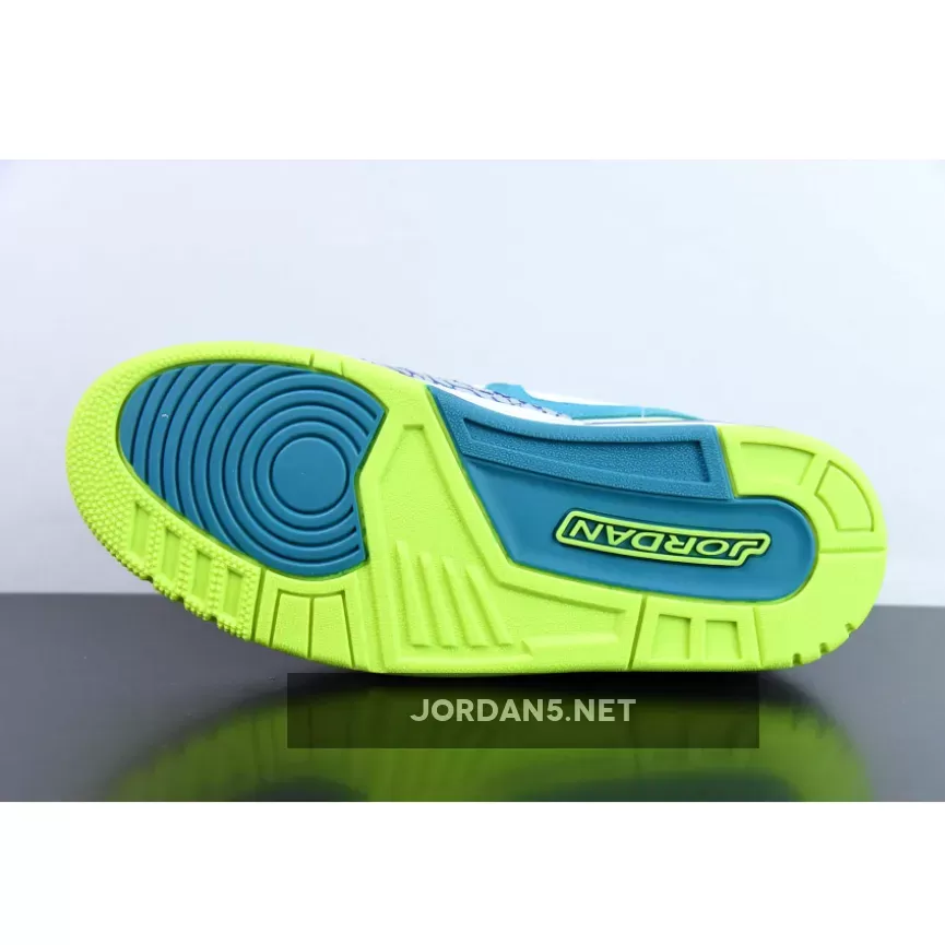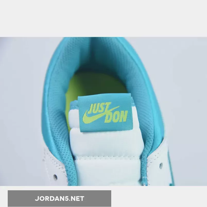This release features Summer vibes by utilizing bright shades throughout. Blindingly bright aqua tones find place across the lining, tongue tab, as well as the textural suede swoosh while volt green ornaments the heel wrap and outsoles entirely. Branding notes are true to form, with “Just Don” standing next to boldfaced font hits and the iconic Jumpman, though the insoles feature a small circular patch akin to vintage bottle caps or possibly sportswear-centric iconography.