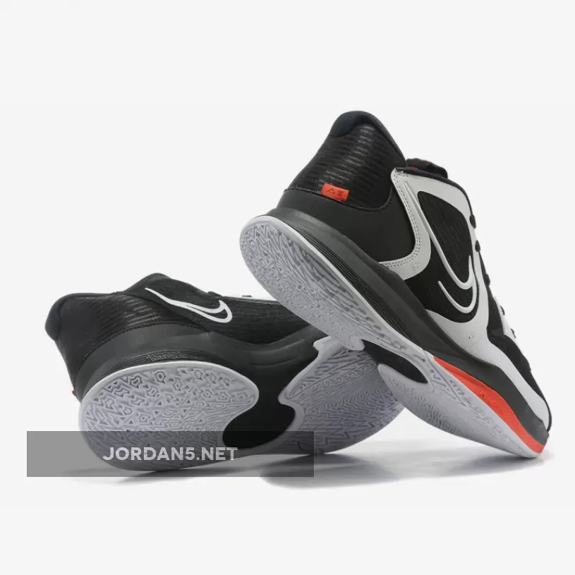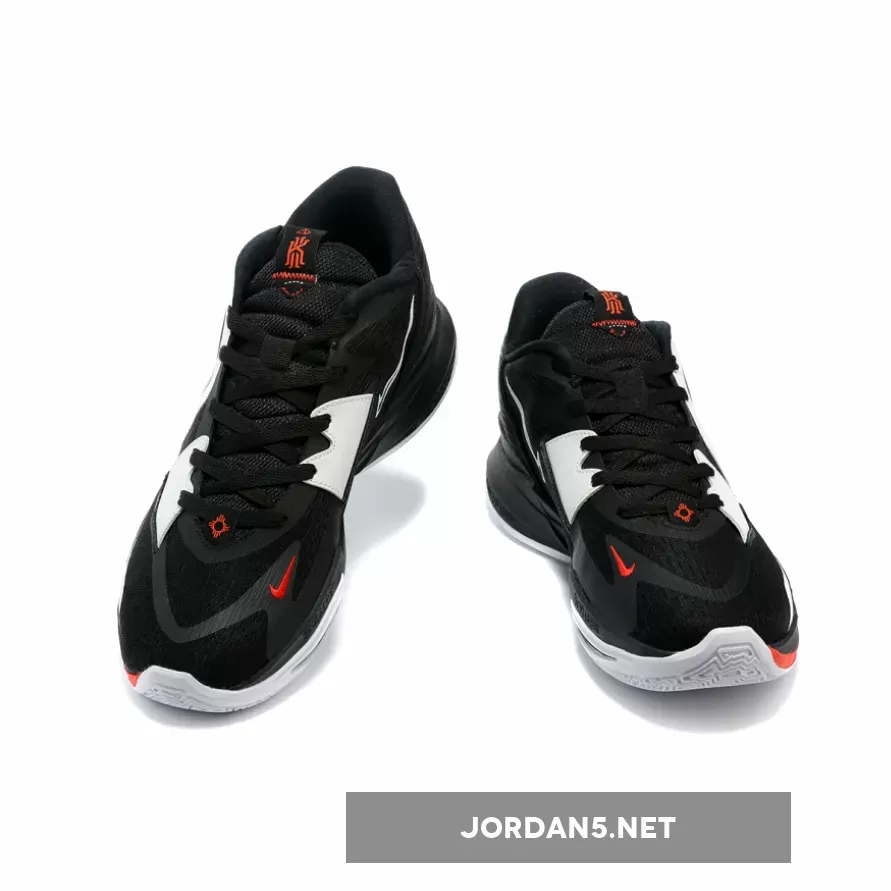 Though he’s been spotted with the model on the court, this fresh set of images — in a new colorway — give you your best look yet at the model, one which draws heavily from the design language of the Kyrie 8 (Infinity). You’ll notice a shape overall similar to the Infinity, with semi-translucent sheath uppers, wavy midsoles, and modified-yet-similar rear ends. Overall, though, the pair is more lightweight and low-key, with compressed soles, sleeker ankles, and less bulk. It’s color scheme is something of a staple for the Kyrie linage, with a mostly-black build met with hefty pops of white, and striking red accents throughout to complete the design.