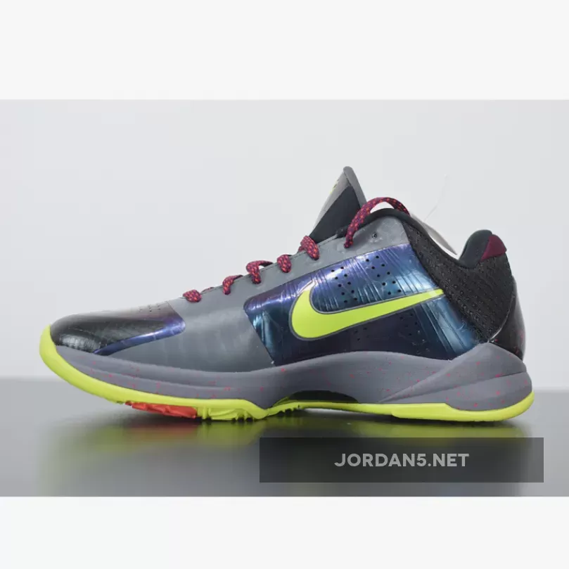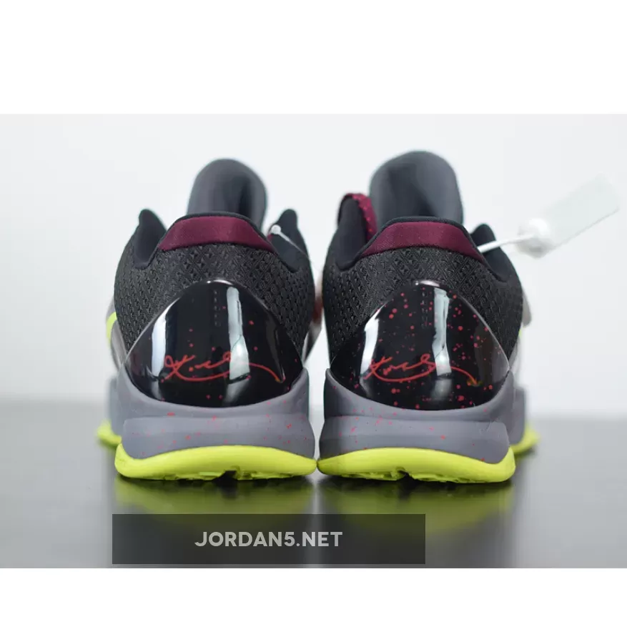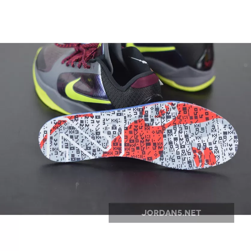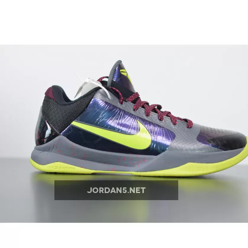 From a design standpoint, these Kobe 5s feature a classic “Chaos” color scheme, but switch out the OG design’s white accents for dark grey hues while leaving the signature purple, red and volt base fully intact. A darker shade of Grey is also added to its midsole, which is different from the original.