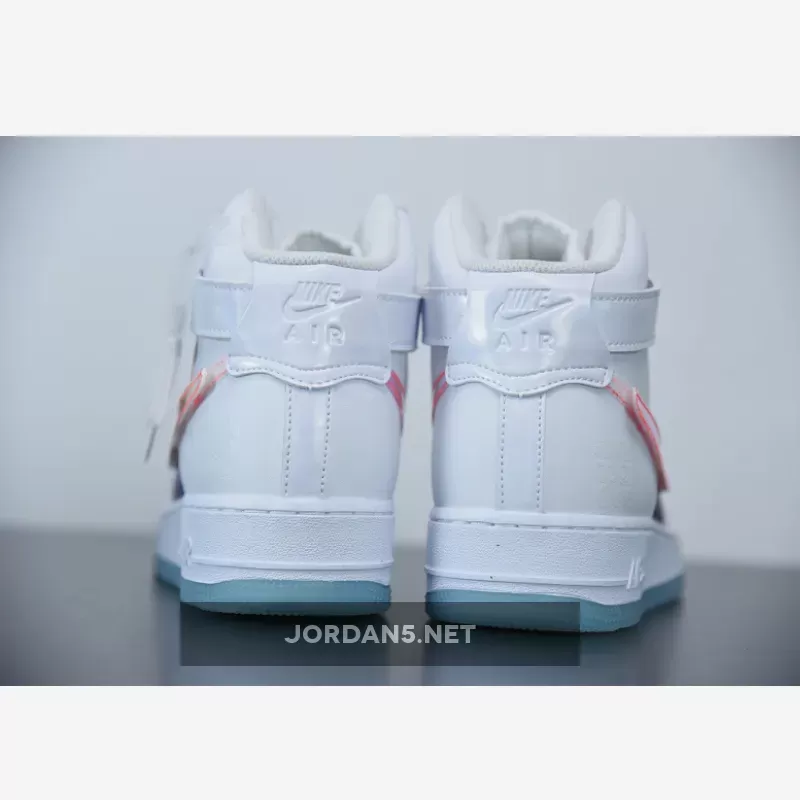 his rendition is swathed with bright white uppers and midsoles, as well as icy blue treading. However, the most attention-grabbing features of the pair are the iridescent accents that shimmer through various territories such as the ankle straps, quarter panels, lower throat overlays, and Swooshes which happen to be removable. Packaged with these sneakers are velcro patches such as this 8-bit heart that hosts the Nike logo pictured below