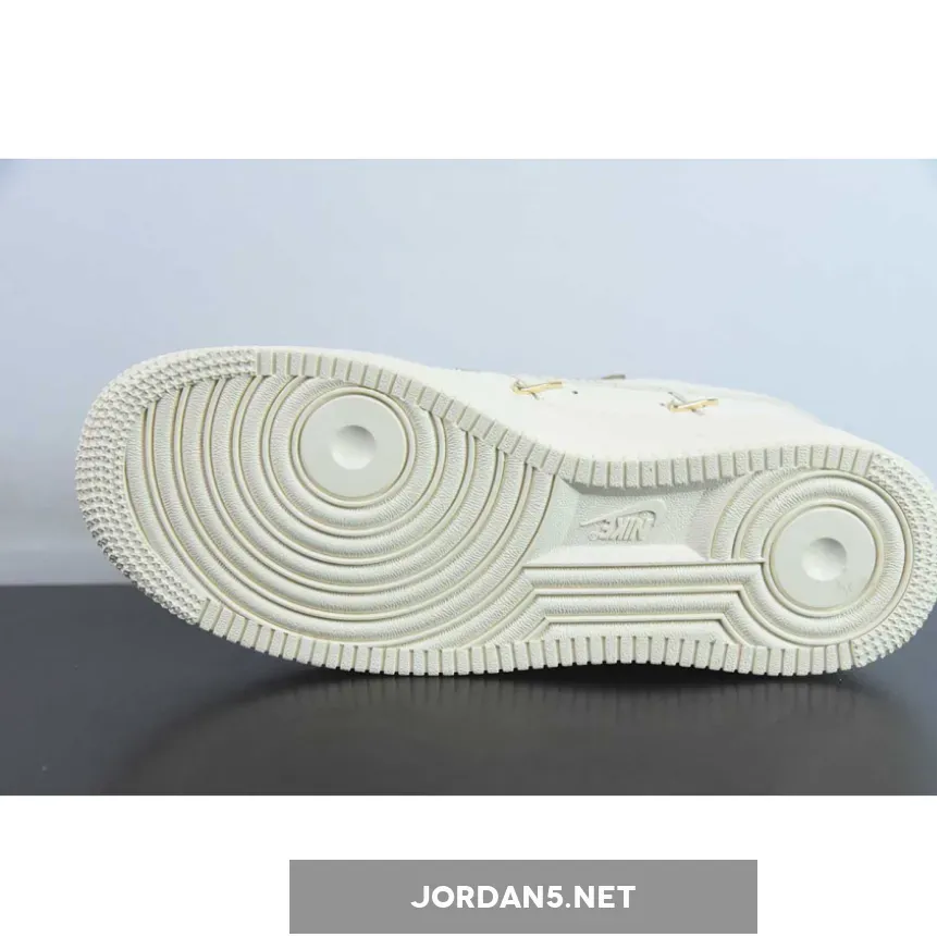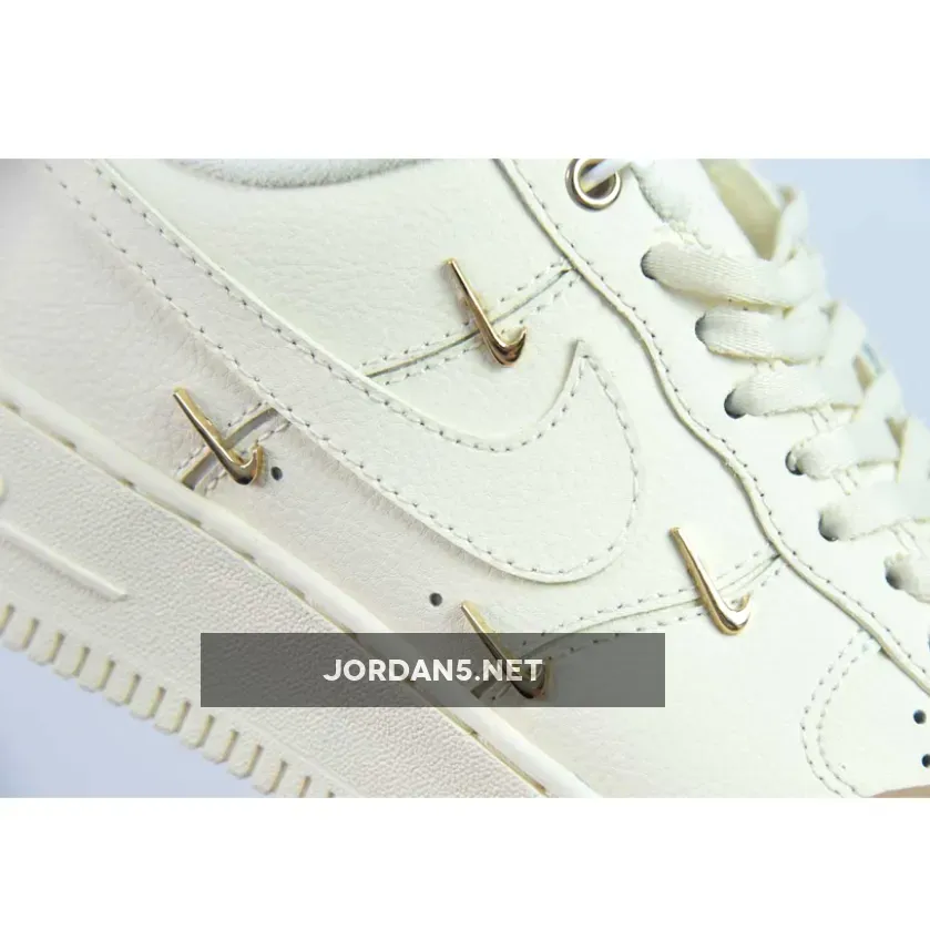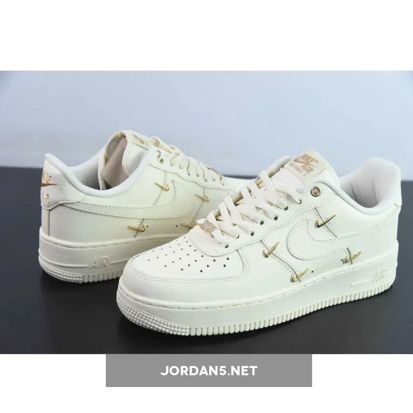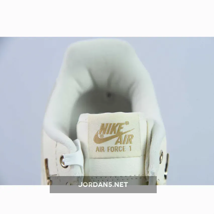 The Nike Air Force 1 Low Sail Metallic Gold represents a stylish and highly sought-after sneaker. Though largely reserved in its colorway, the pair does feature a number of bold, expensive looking details. For starters, It showcases a unique blend of colors and metallic accents. This particular colourway brings together an off-white sail upper with intricate metallic gold detailing . The topmost eyelet, dubraes, and branding are dressed to complement, adding dollar signs to what would otherwise be a simple, “Sail” dominant make-up.