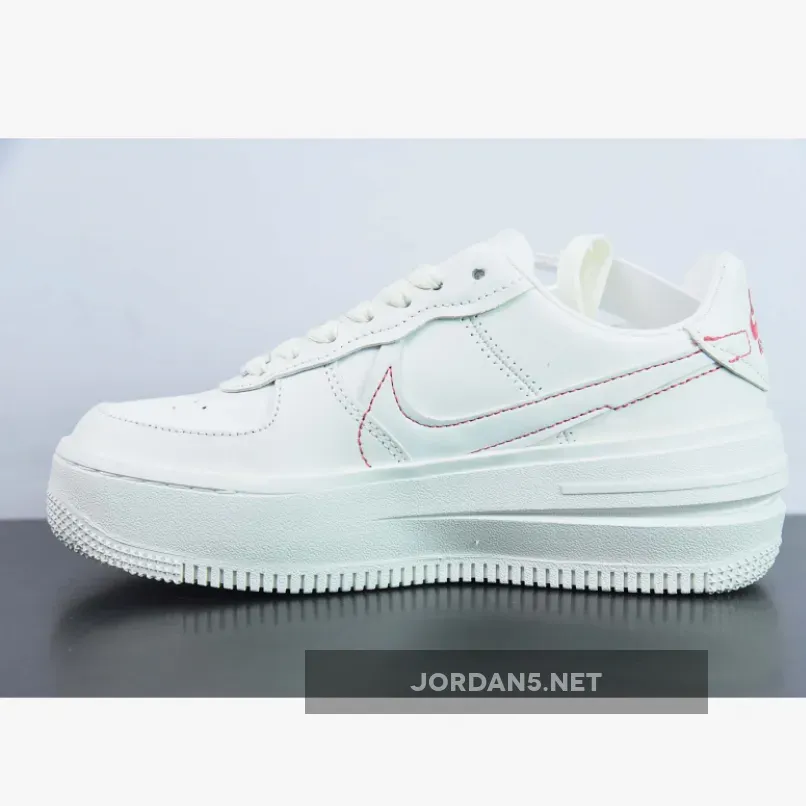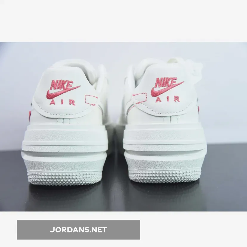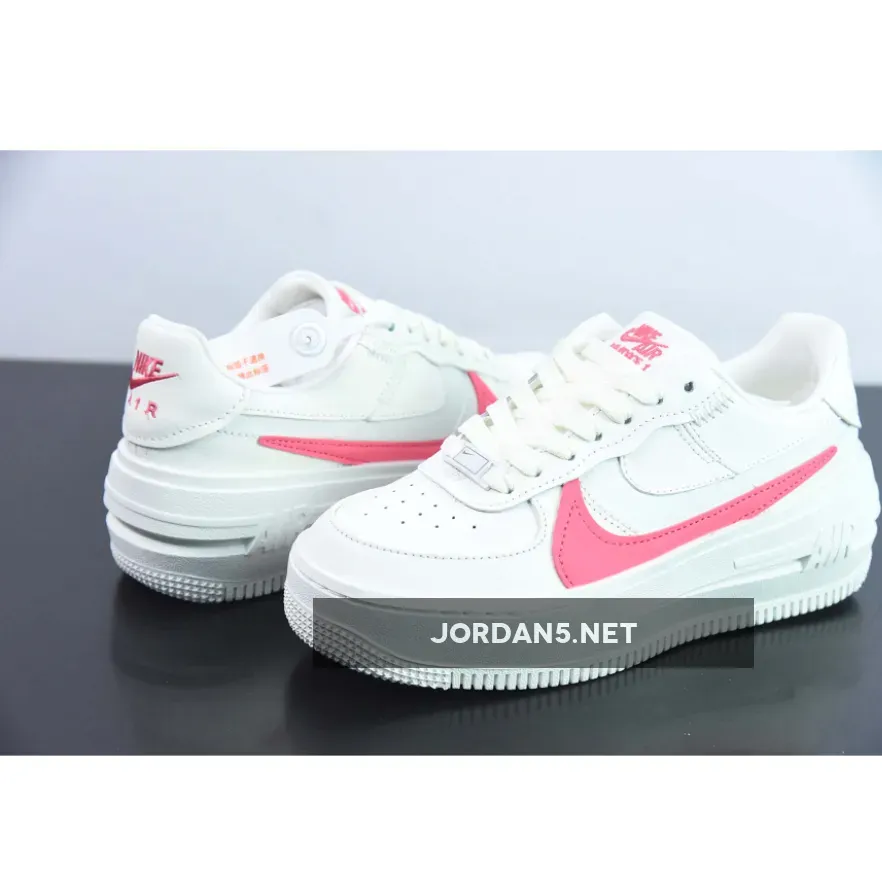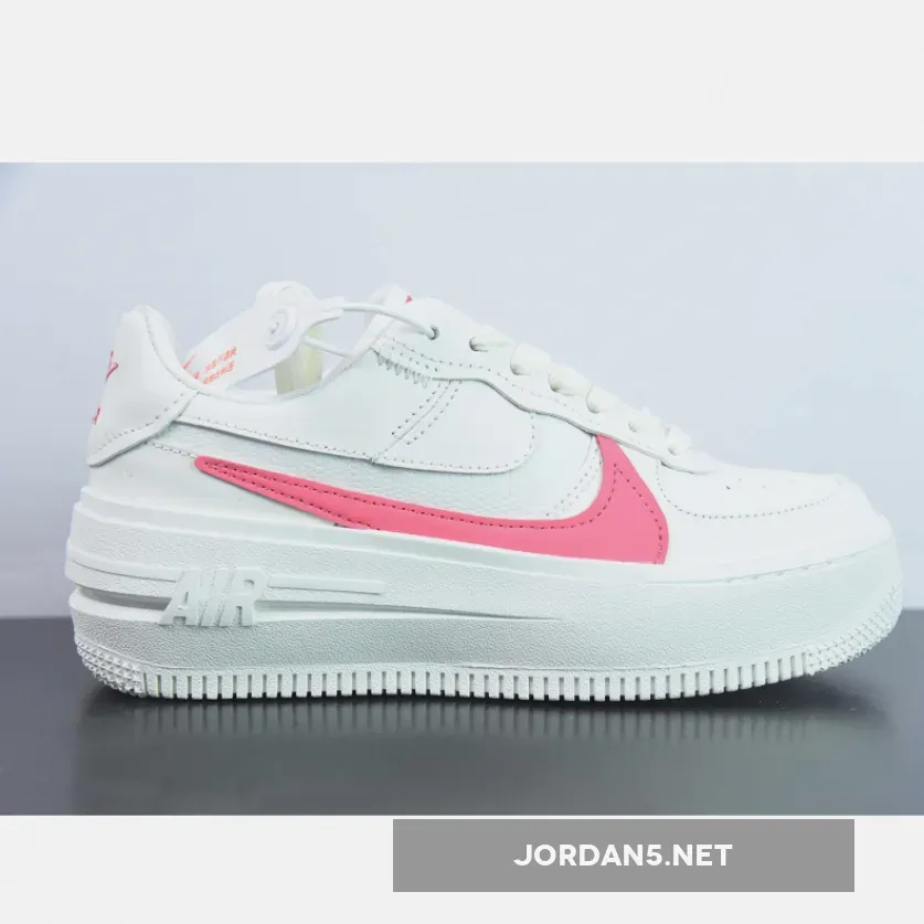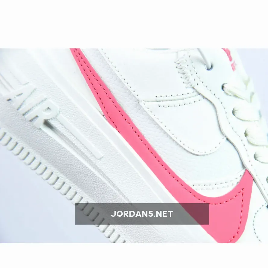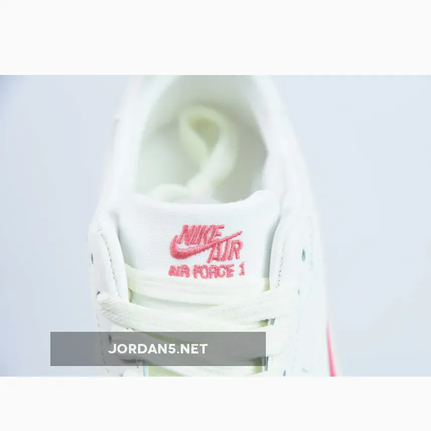 The iconic silhouette of the Air Force 1 is given a modern update with the Sail Sea Coral colourway, featuring a white upper with a pink Nike swoosh and logos.