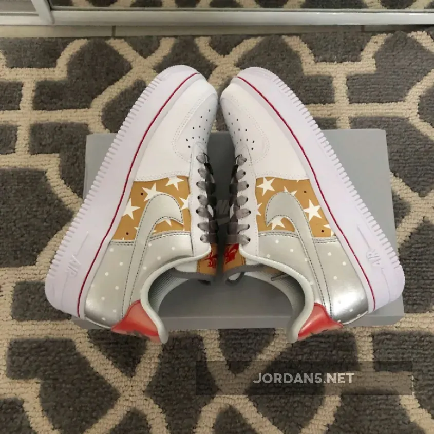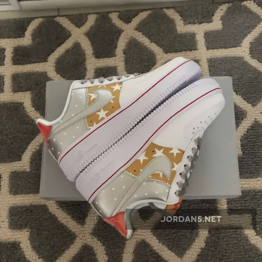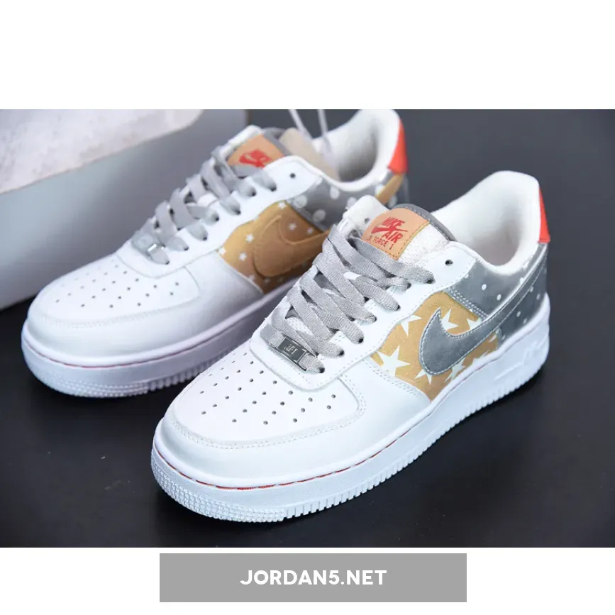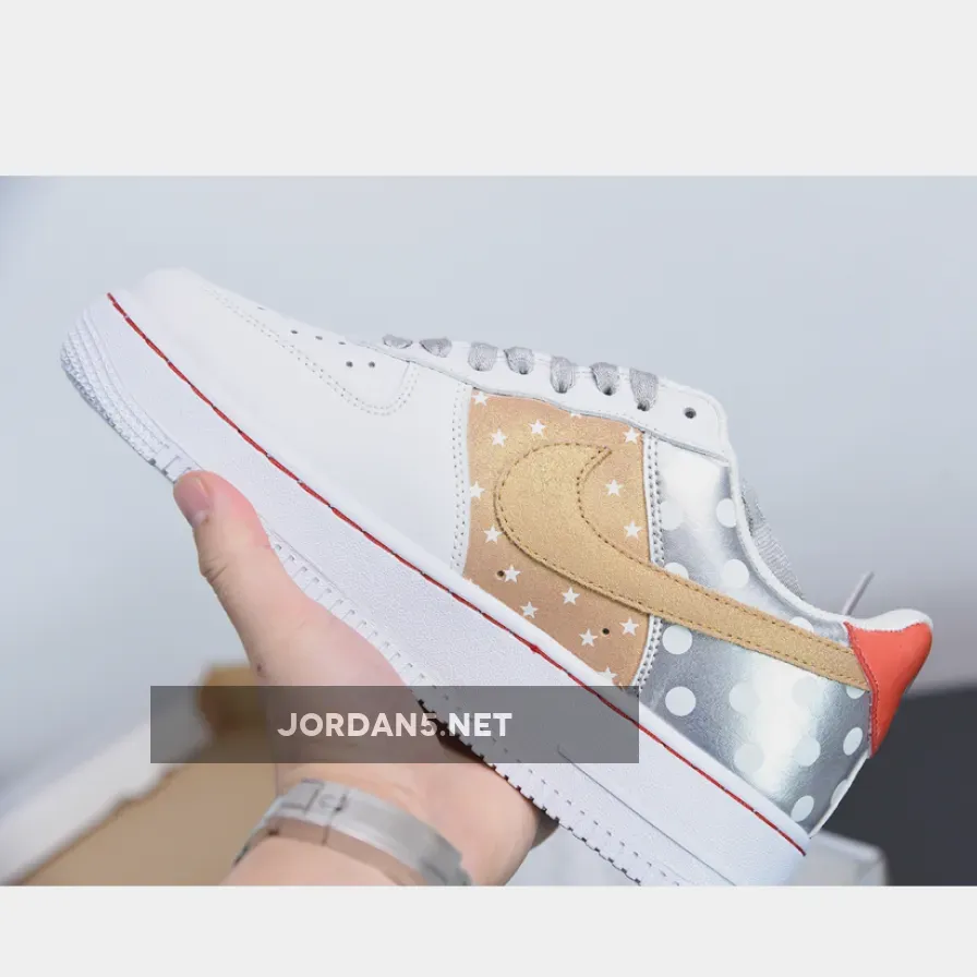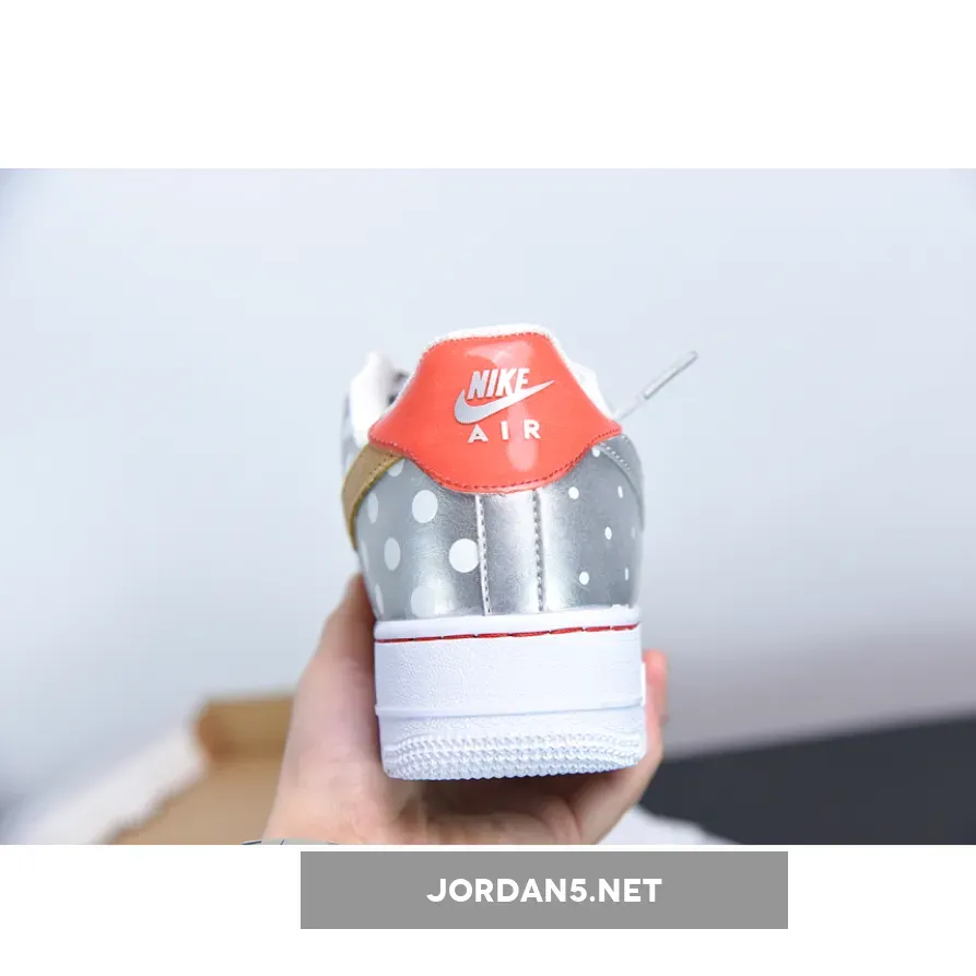 the pair shows off a mostly reserved palette with unassuming tans and oranges sitting at both edges of the more standout silver metallic plastered along the heel wrap and swoosh. These, which bear an almost foil-like texture, are emblazoned with polka dots throughout, lying adjacent to a similarly fashioned graphic with stars in replacement. Forefoots as well as the eye stays, tongue, and sole take on the mostly ordinary, preferring a bleached white smooth leather with the center line opting for a more textural mesh. Stitching along the foxing match the aforementioned warm tone while not taking on the same holographic finish that houses the inner Nike Air logo.