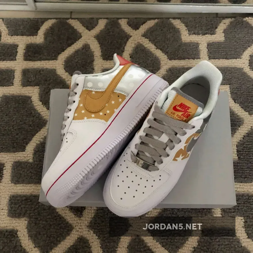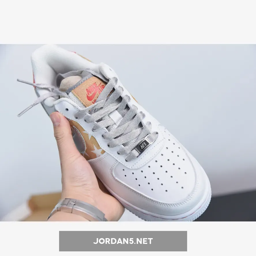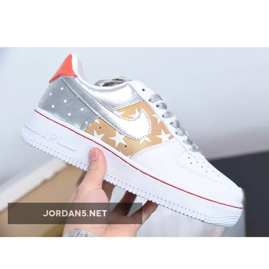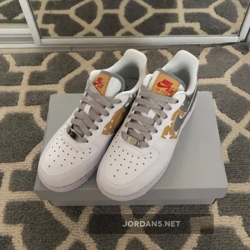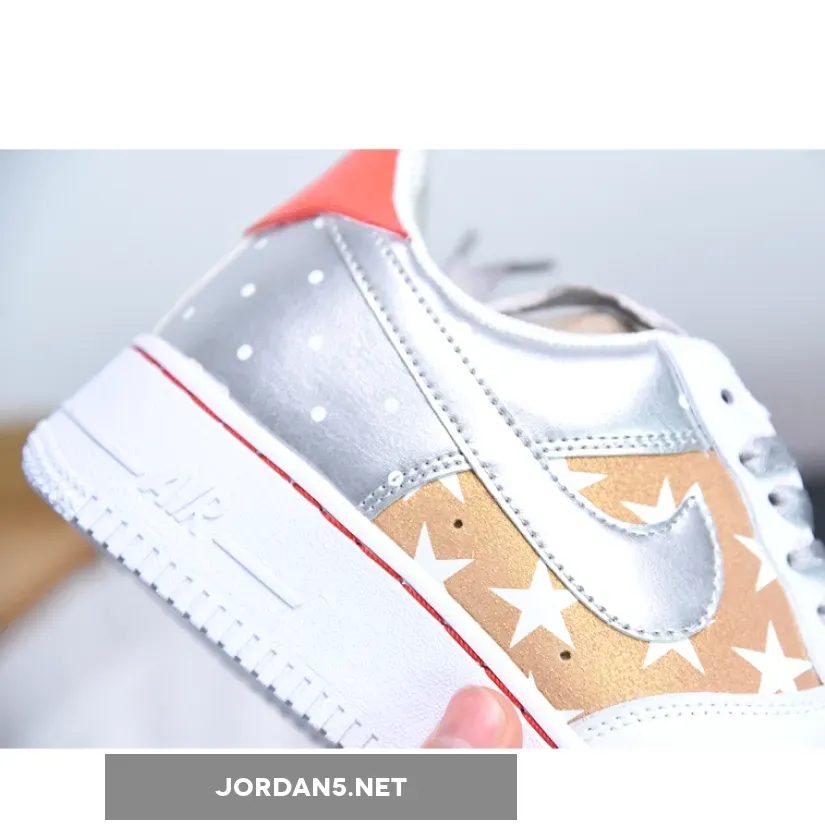 the pair shows off a mostly reserved palette with unassuming tans and oranges sitting at both edges of the more standout silver metallic plastered along the heel wrap and swoosh. These, which bear an almost foil-like texture, are emblazoned with polka dots throughout, lying adjacent to a similarly fashioned graphic with stars in replacement. Forefoots as well as the eye stays, tongue, and sole take on the mostly ordinary, preferring a bleached white smooth leather with the center line opting for a more textural mesh. Stitching along the foxing match the aforementioned warm tone while not taking on the same holographic finish that houses the inner Nike Air logo.