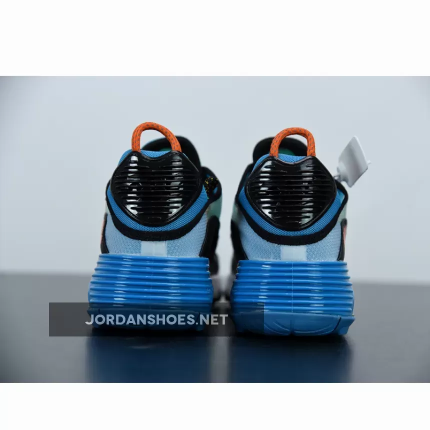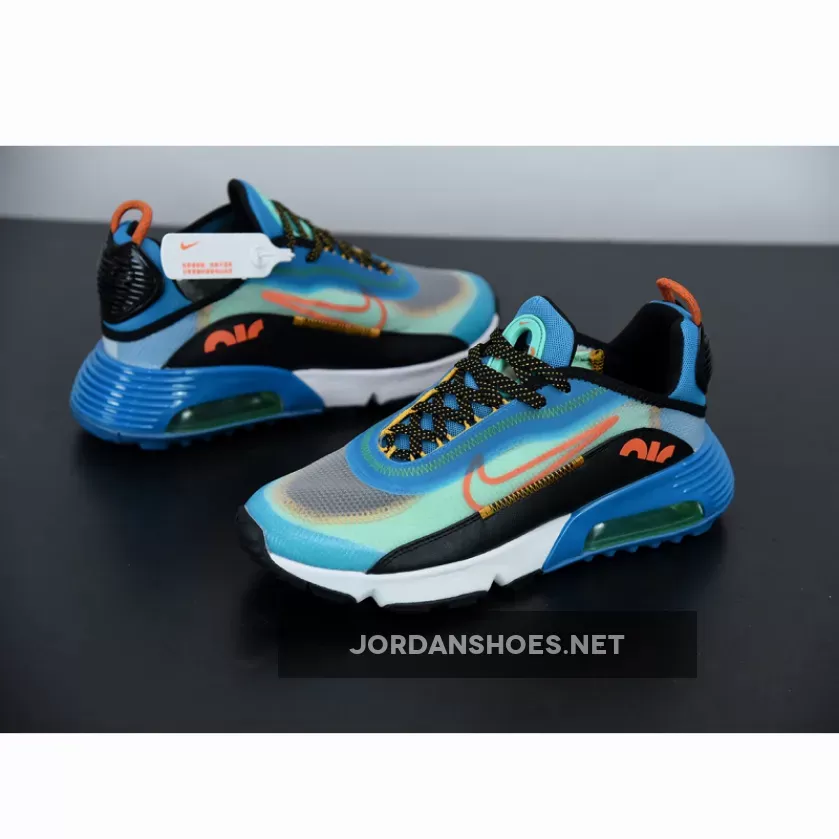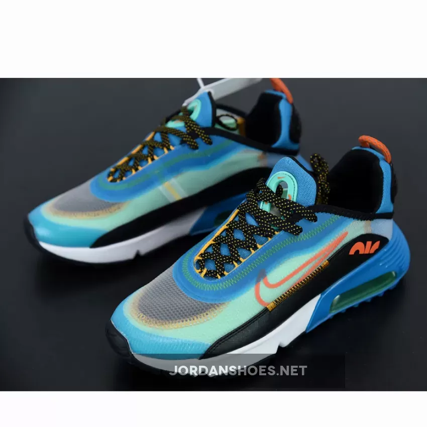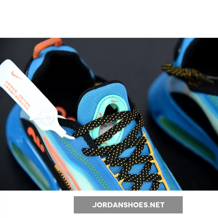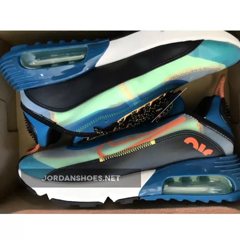 In color blocking galore, teal translucent overlays sit atop a mint green base. Bright oranges and yellows are used for the swoosh, lace loops, heel loops, and contrast stitching details to add warmth to the color palette. These bright hues are balanced by a jet black Air Max 90-inspired mudguard. For final, hiking-inspired flair, the black shoelaces have orange stitchings reminiscent of the durable laces on other hiking shoes.