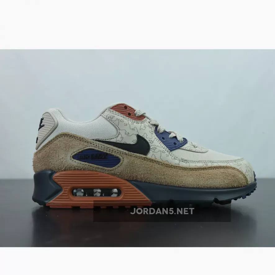 The Nike Air Max 90 Camowabb features a beige and sand upper with suede overlays and a multicolored lacing section. From there, graphics on the midfoot and visible stitching along the toes complete the design.
