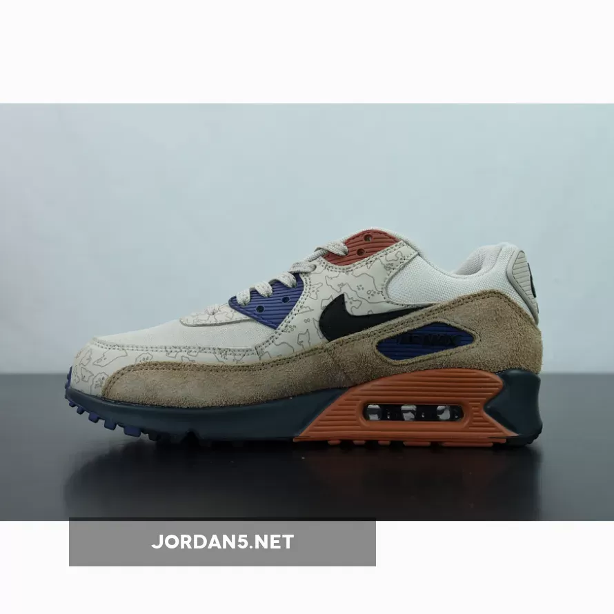 This offering of the Nike Air Max 90 features natural Sand shades throughout its upper with hits of Burnt Orange and Purple to give off that ACG vibe. Highlighting the shoe is the subtle engraving across the leather panels, reminiscent of terrain patterns seen on maps.