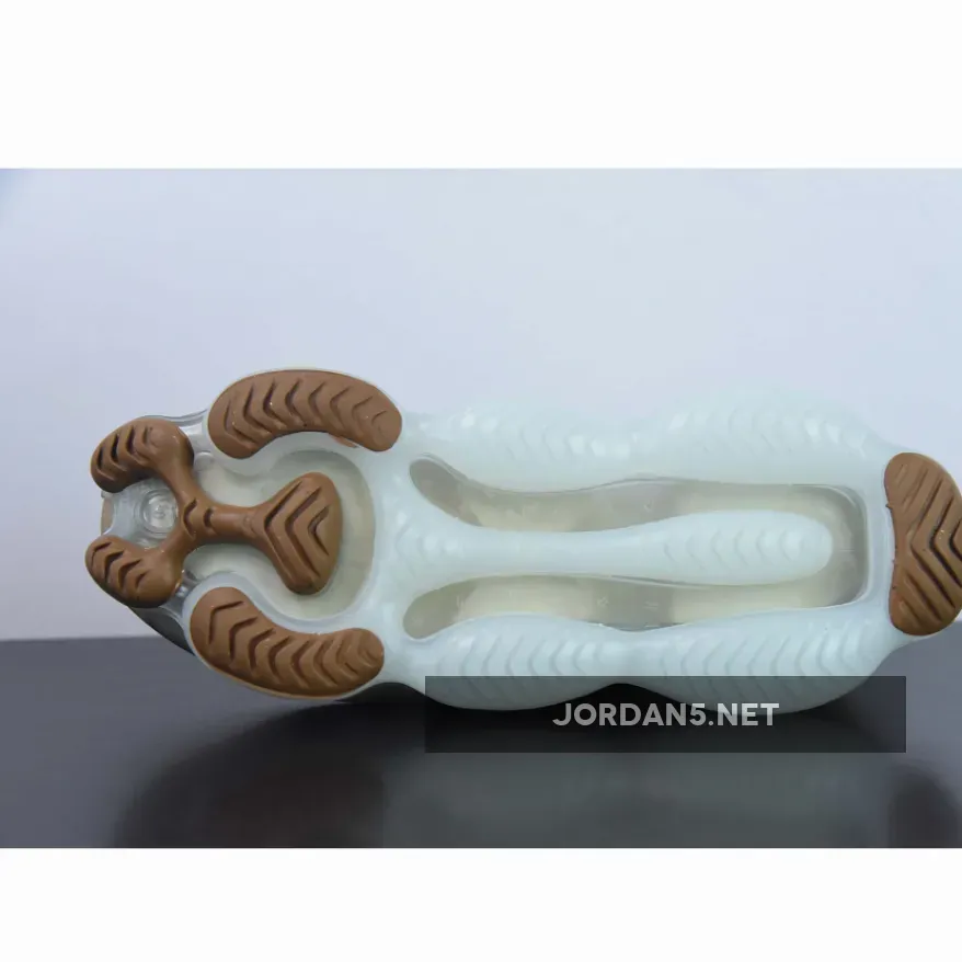 Underfoot, a darkened brush of marble outfits the midsole in tandem with its pillowed semi-translucent cushioning system and brown tread pucks below.