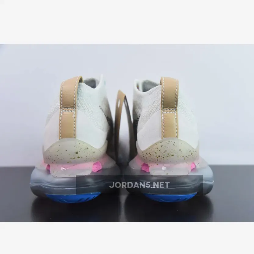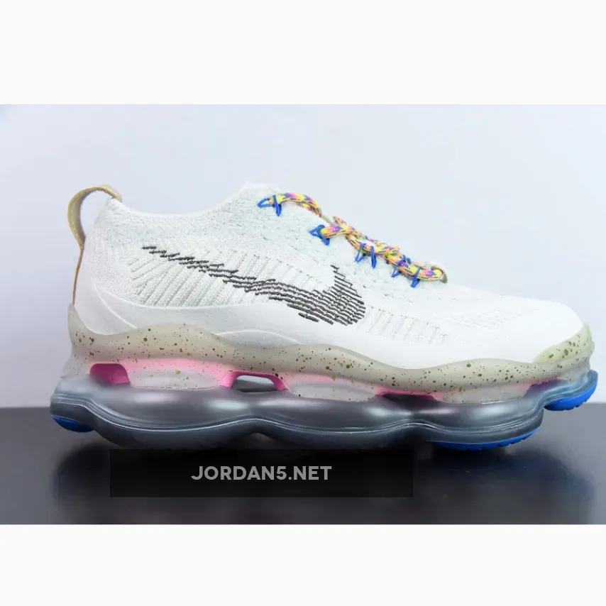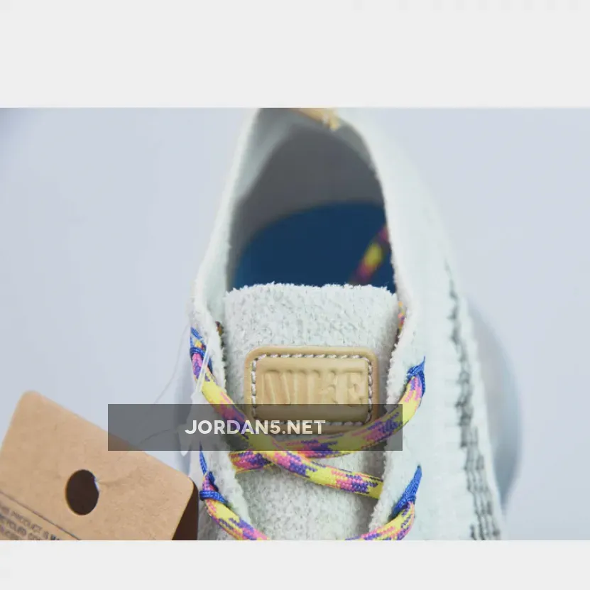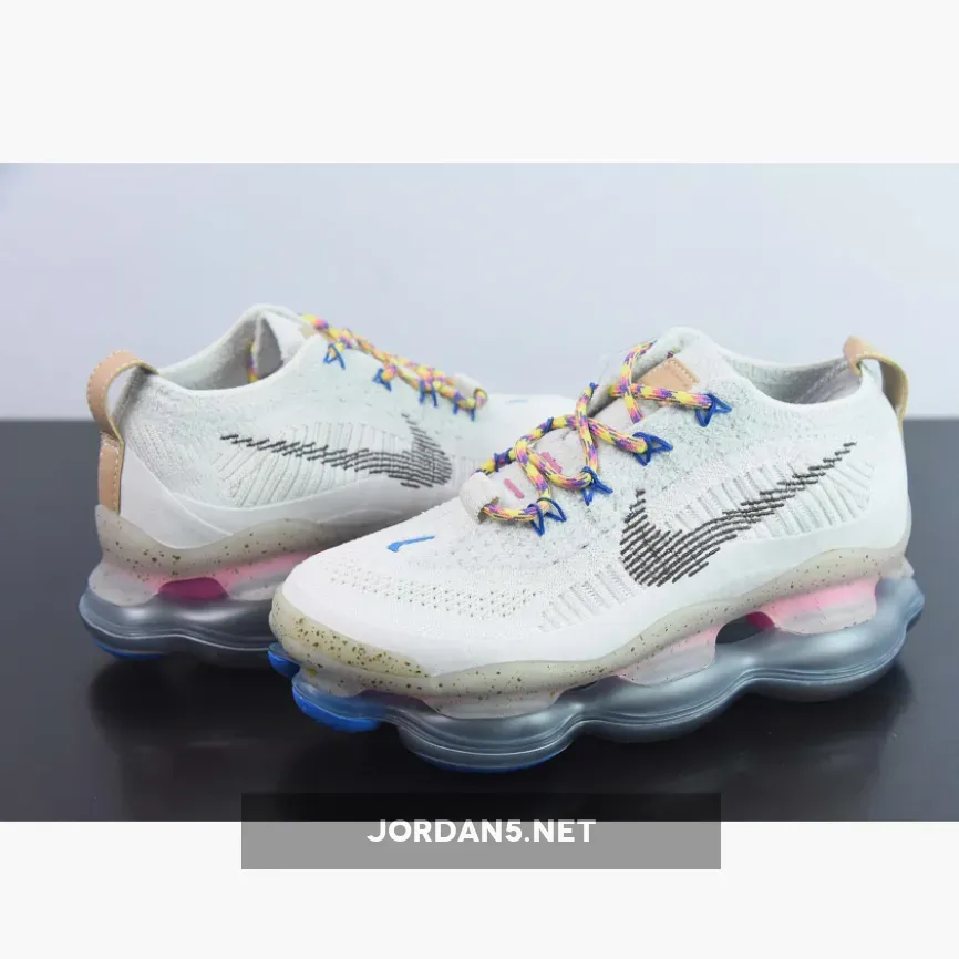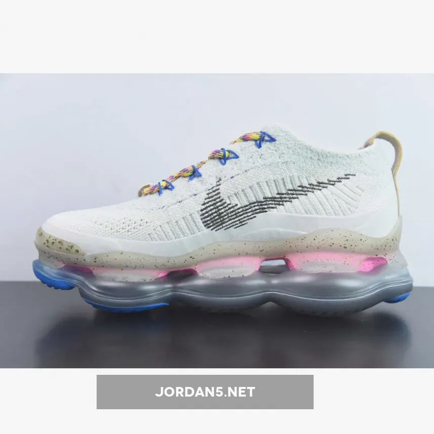 The Nike Air Max Scorpion Hiking features an Off-White colored Flyknit upper with stitched Swoosh logos on the side panels. Adding some color to the design are the Yellow, Pink and Purple-colored rope laces. Elsewhere you will find includes Yellow. Pink, and Purple-colored rope laces, Tan leather tongue labels and heel pull tabs, Blue mini Swooshes on the toe with Nike “Just Do It” branded insoles.