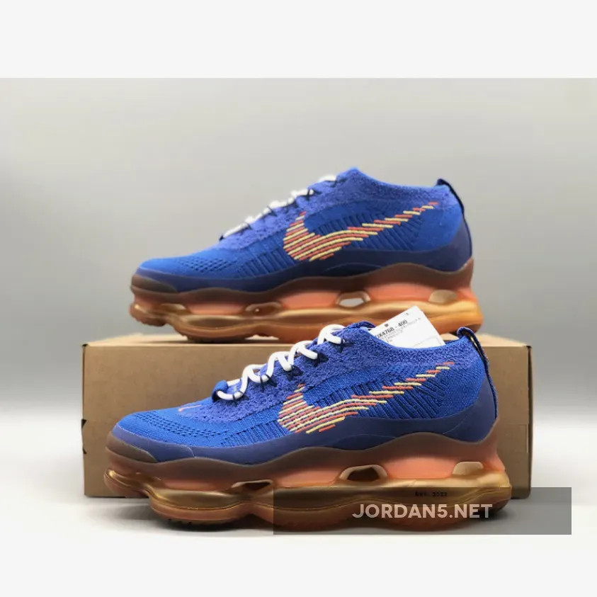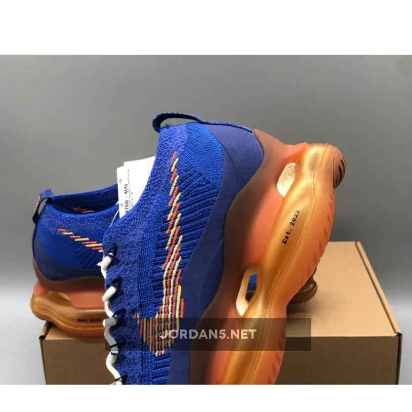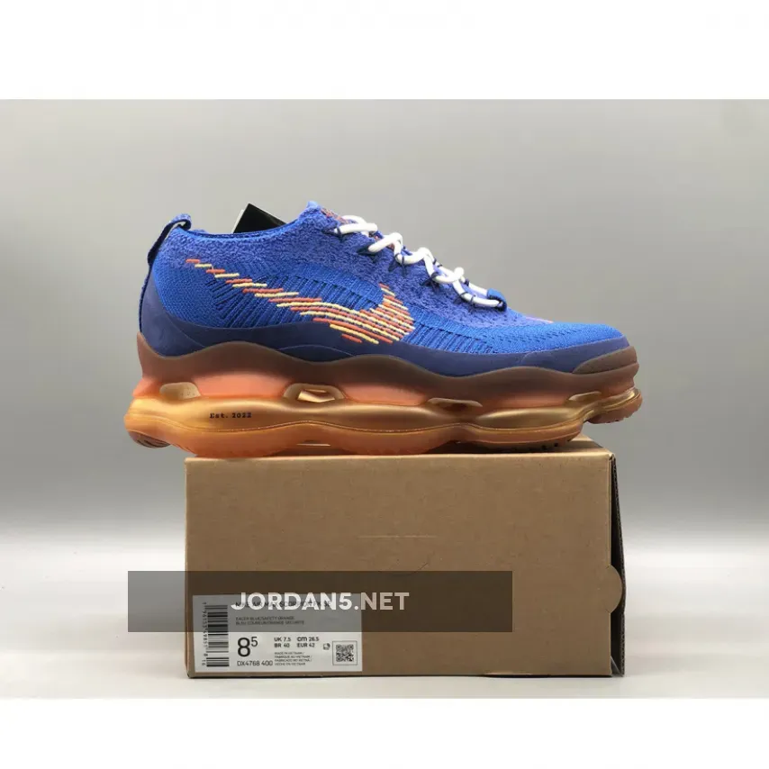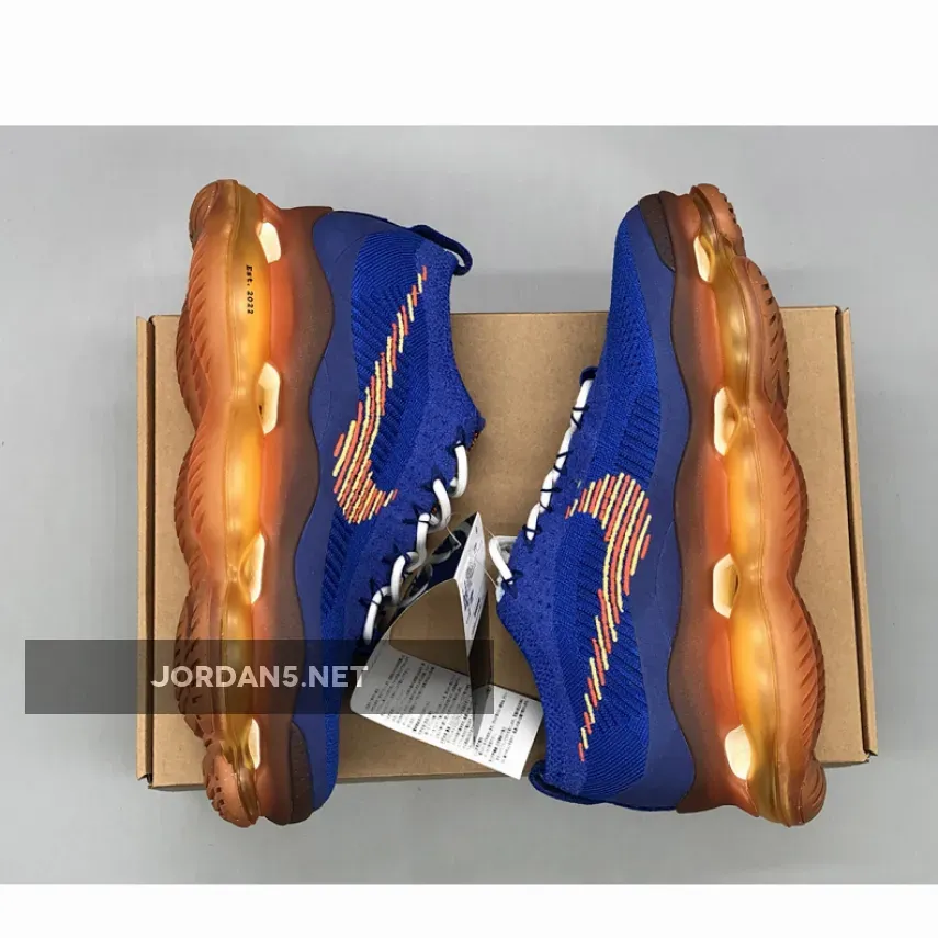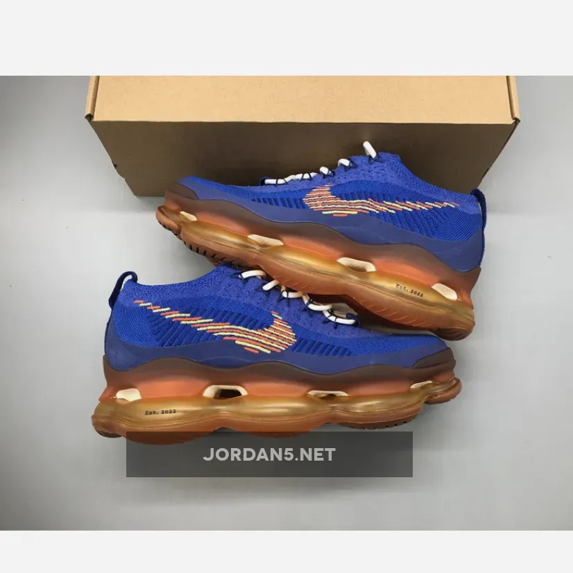 The Nike Air Max Scorpion “M. Frank Rudy” sports a predominately “Racer Blue” and “Game Royal” woven upper accented with contrasting “Safety Orange” and “Team Gold” on the profile Swooshes and tongue branding.